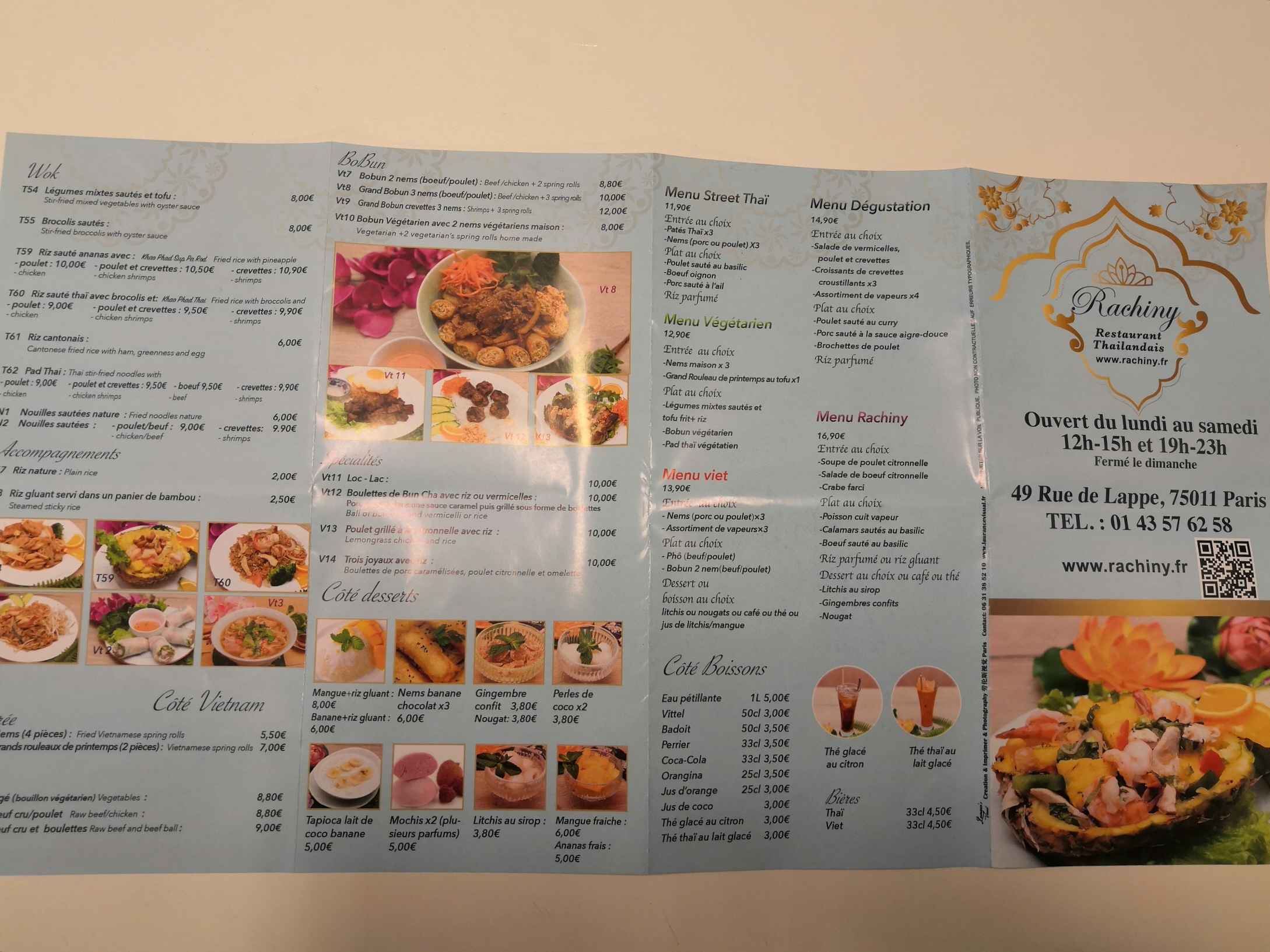 J'appréhendais la cuisine thaïlandaise à cause de divers expériences, et comme je mange très peu épicé, mais ce restaurant m'a réconcilié avec, c'est selon moi, le meilleur restaurant thai-viet ! J'y vais souvent maintenant et je ne suis jamais déçue, mon compagnon aussi est devenu fan (notamment du crabe farci, du pho, du pad thai...). La nourriture est de bonne qualité, mention spéciale pour les crevettes au lait de coco et curry rouge juste DIVINES avec du bon basilic frais, que j'adore manger avec leur riz gluant (et tous les autres plats à la crevette qui sont mes coups de cœur et que j'alterne à mes passages). Le rapport qualité-prix est plus que correcte, la taille des plats parfaite, les boissons maisons aussi m'ont impressionné et étaient délicieuses (thé jasmin chaud, thé thai ou thé au citron glacés), et je n'ai jamais eu de problème à la digestion (ce qui est rarissime au restaurant pour moi). Un service tellement chaleureux qu'on se demande si on est bien à Paris ou si on n'a pas débarqué de l'avion ! Mesdames et surtout monsieur ont toujours le sourire et sont de bons conseils. Toujours un plaisir de manger à Rachiny pour nous, ainsi qu'un grand nombre d'habitués de ce que je vois ! Merci pour votre travail et à très bientôt.