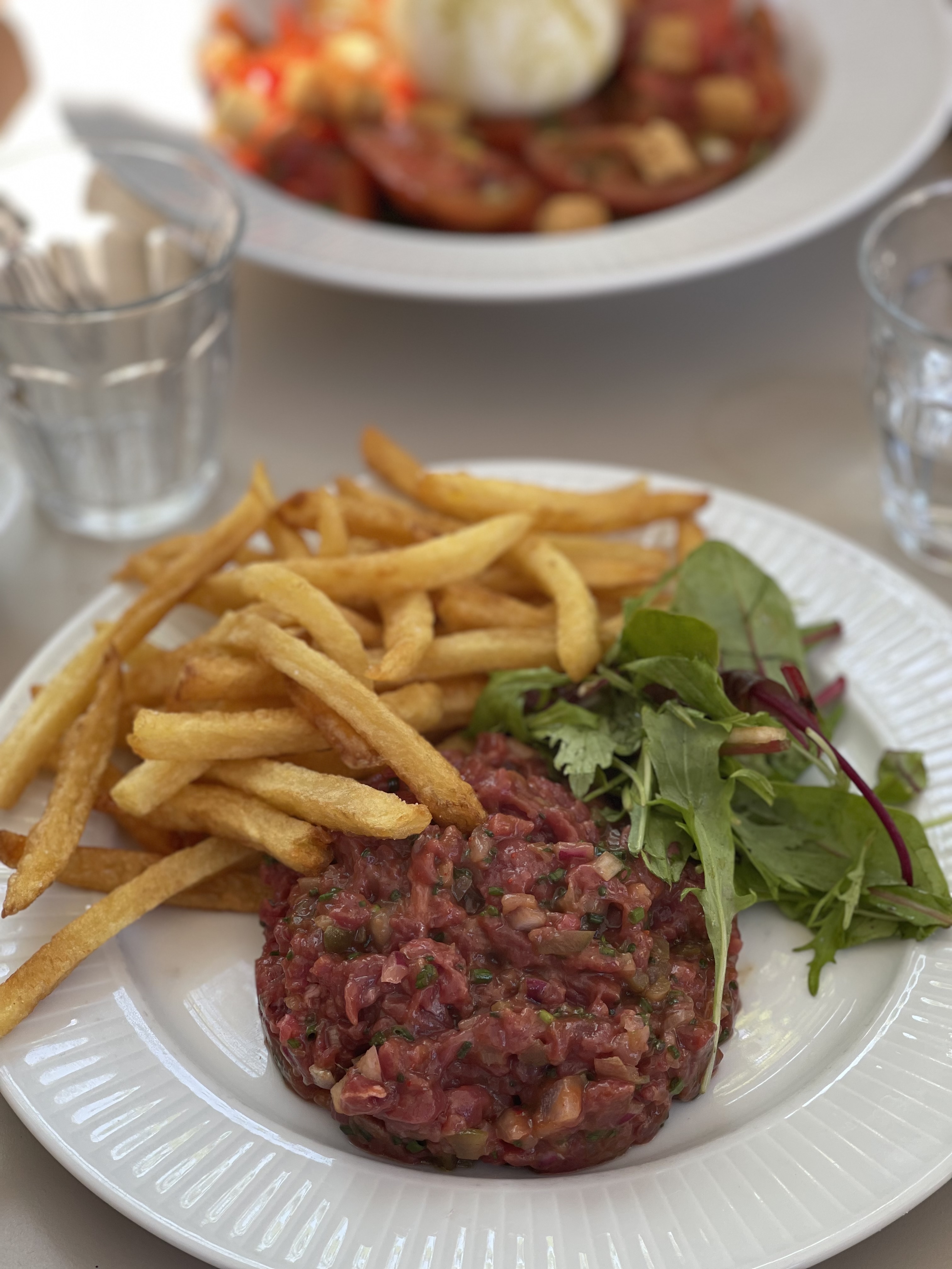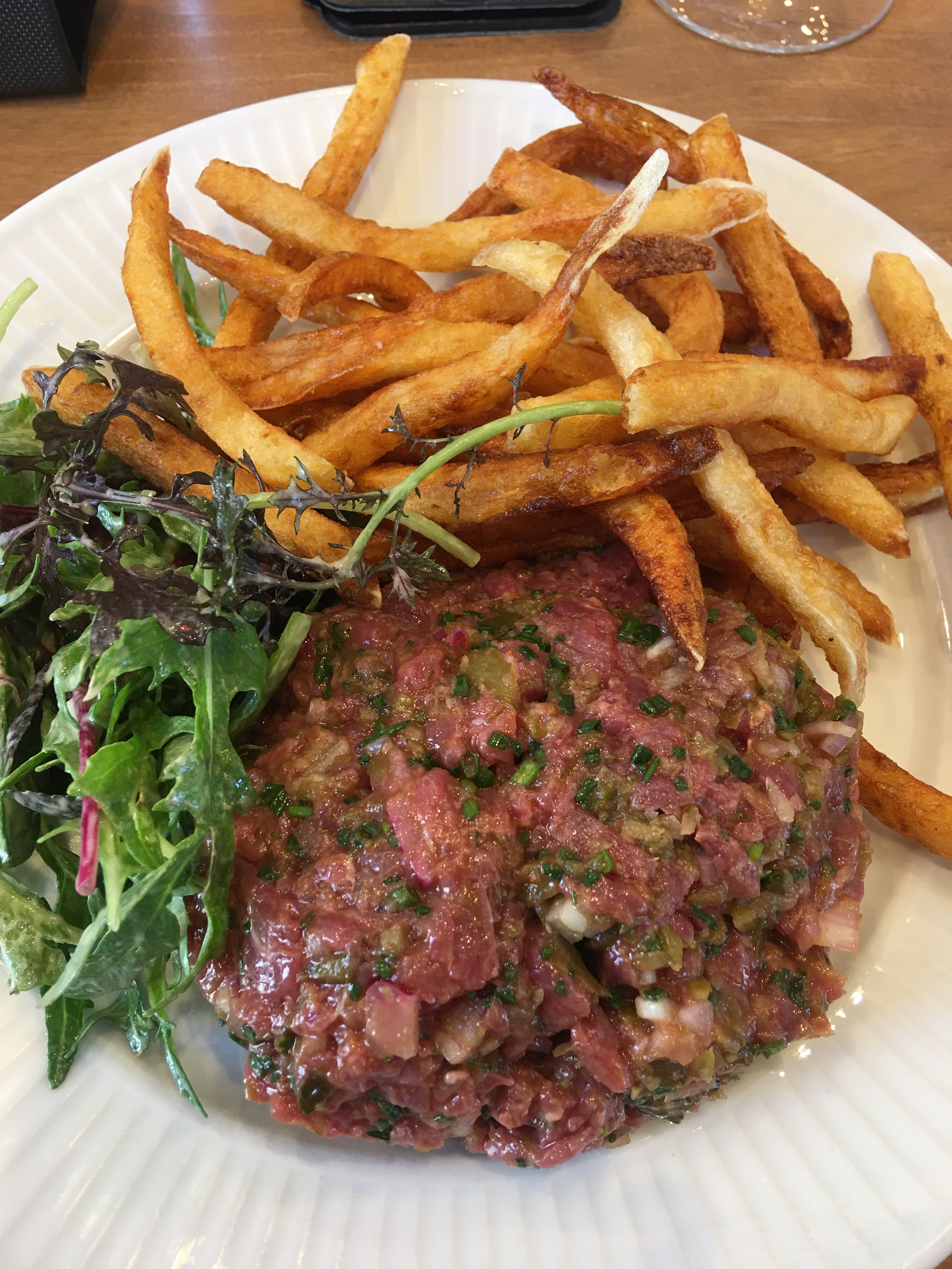 Déjeuner jeudi 12 octobre avec une amie accueil agréable service efficace sur la terrasse et 2 tartares vraiment bons assaisonnement parfait plus ou moins épicés selon notre demande accompagnés de bonnes frites maison et petite salade de mesclun 2 verres de rosé ferry lacombe (ce vignoble nous avait habitués a mieux )dejeuner parfait Merci à l equipe