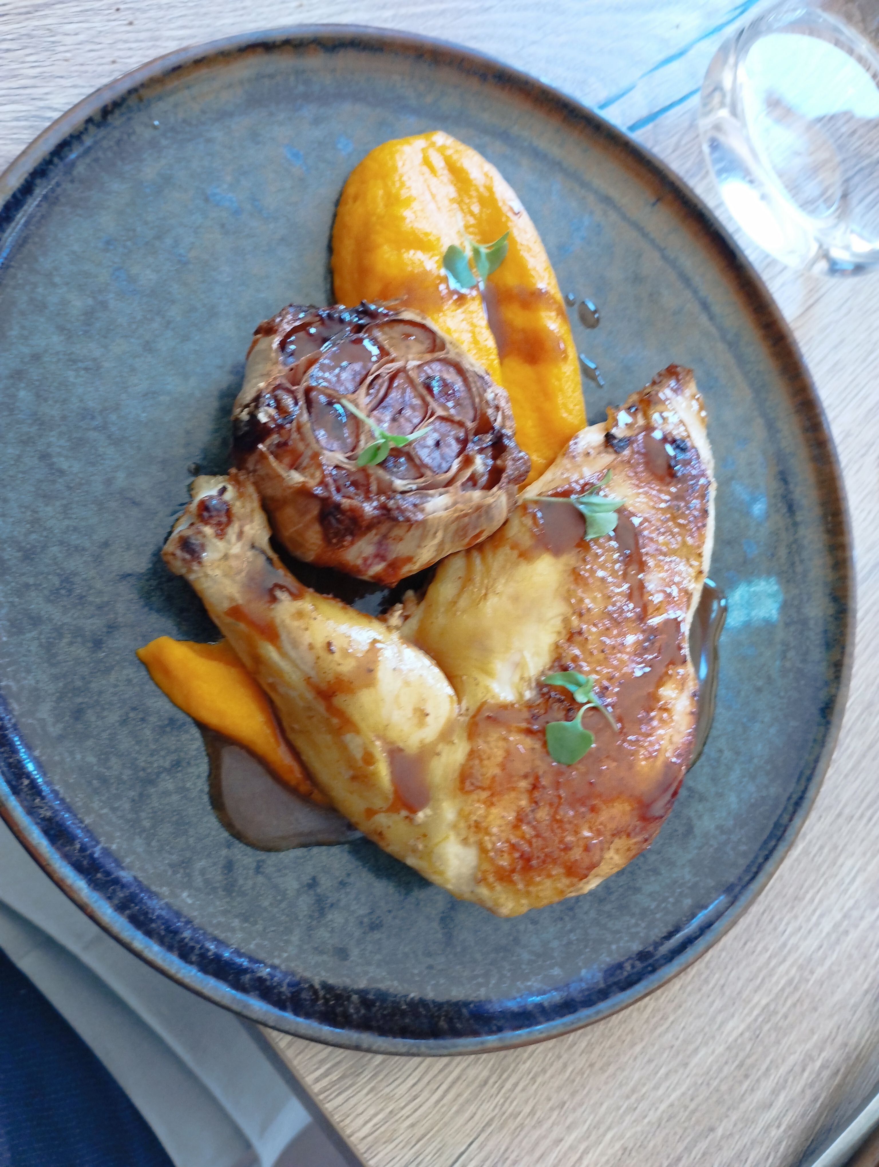 Rien d exceptionnel en ce lieu ,une patte de poulet en soit disant suprême de poulet avec une petite cuillère à café de purée de carottes et une demie tête d ail confie . A ce prix exorbitant le poulet était encore saignant .pour le dessert les deux boules de glace sont grosses comme deux billes