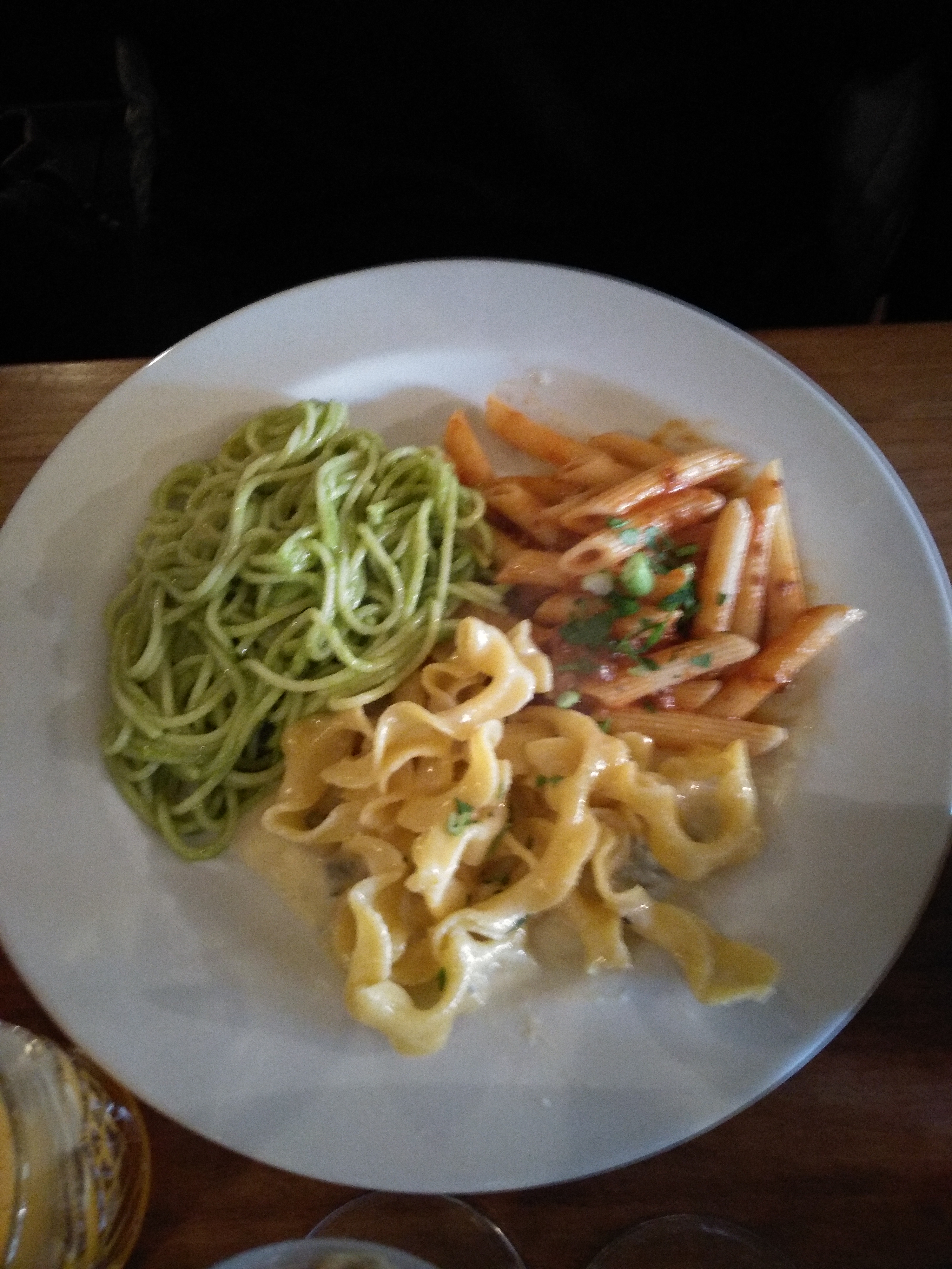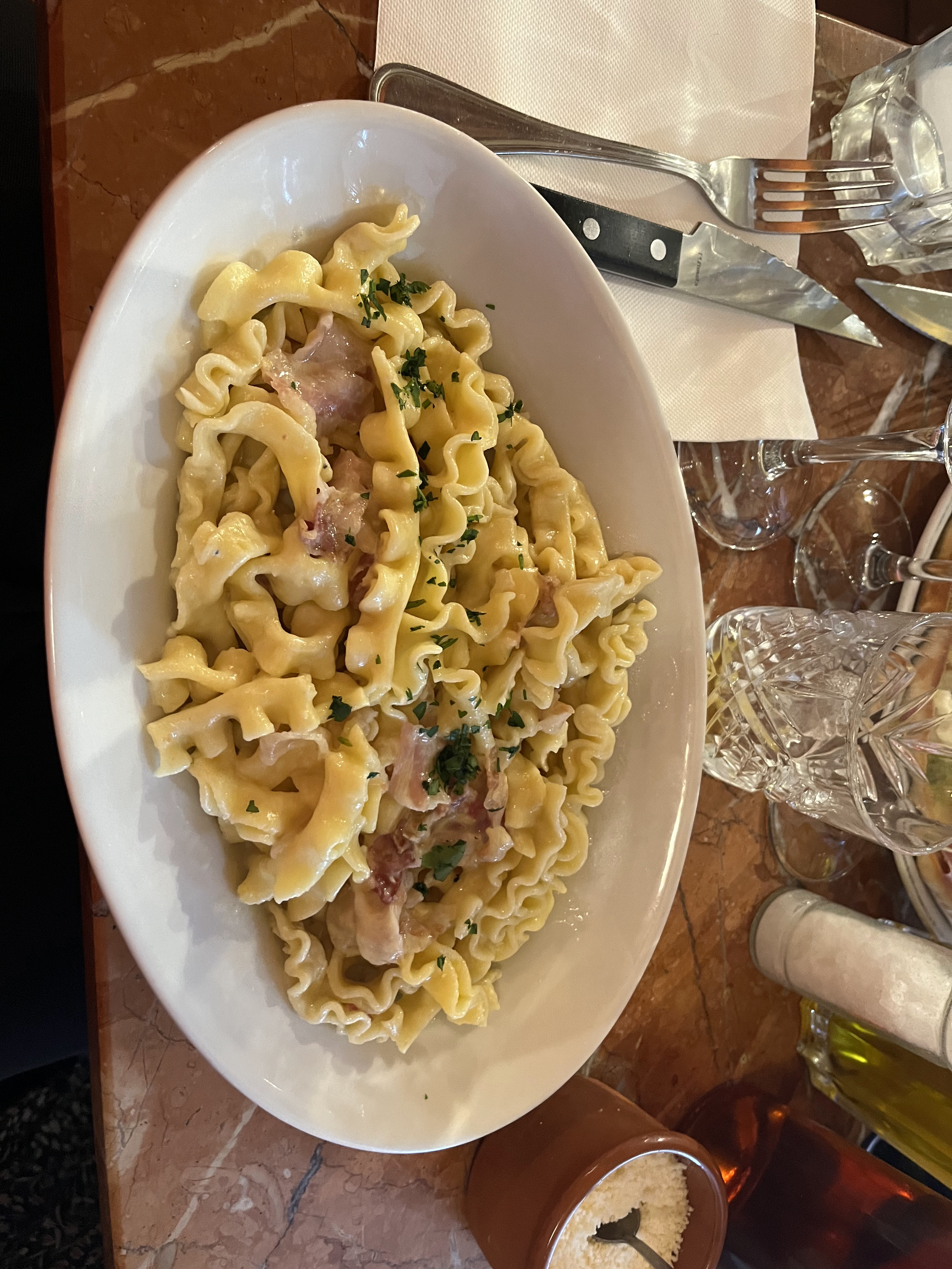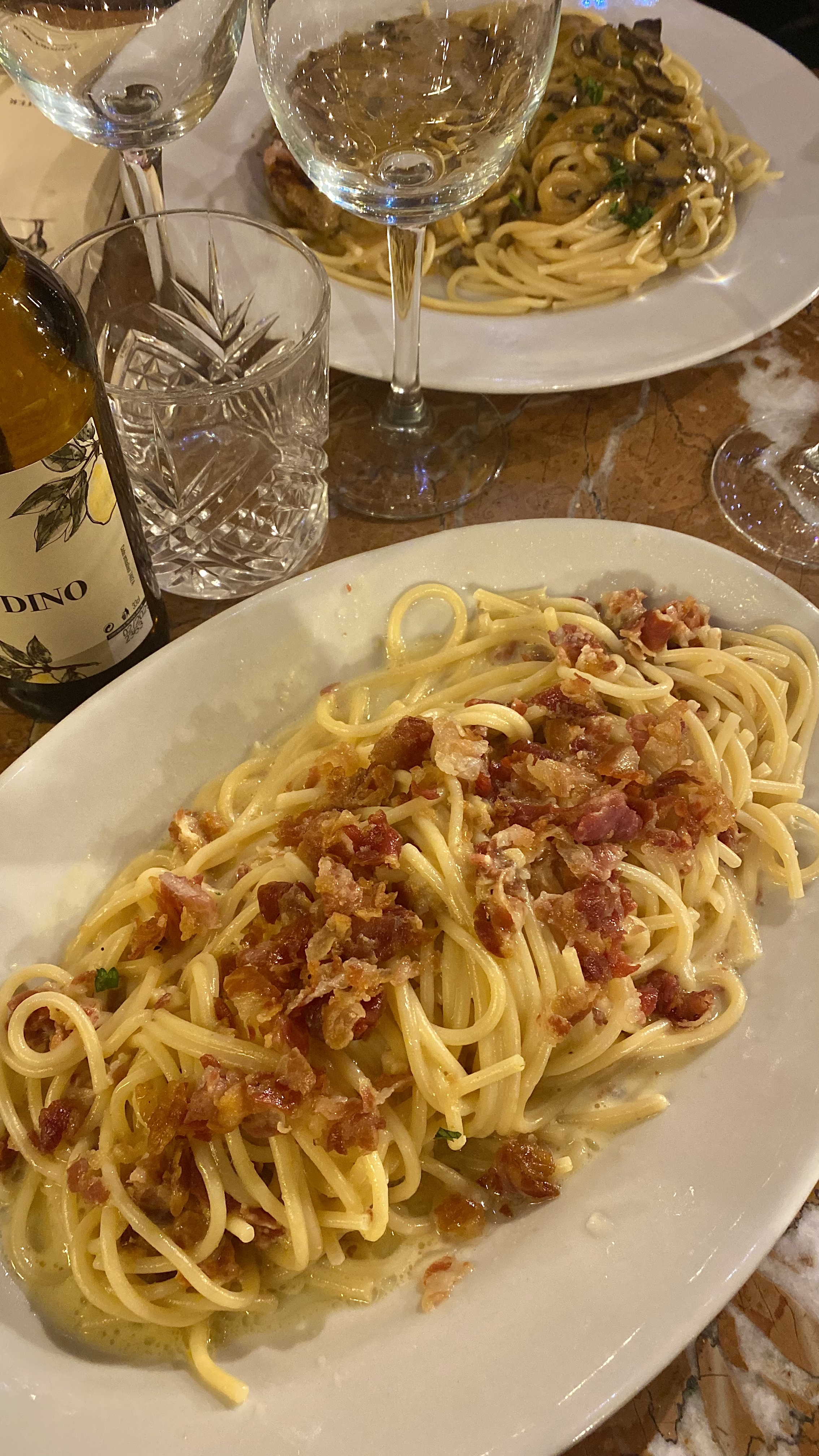 Un restaurant tout à fait basique avec une bonne ambiance et un bon service. On a été servis en 5 minutes ! Pâtes carbo très bonnes. Moi j’avais pris les pâtes aux fromages, un peu déçue… manque de goût et manque de fromage (c’est mon avis personnel). Heureusement qu’il y avait du parmesan dans un petit bol pour rajouter dans nos assiettes. Les portions n’étaient pas énormes ce qui est un bon point car au moins on ne fini pas ballonnés et on a de la place pour un petit dessert. Tiramisu très bon et copieux.
