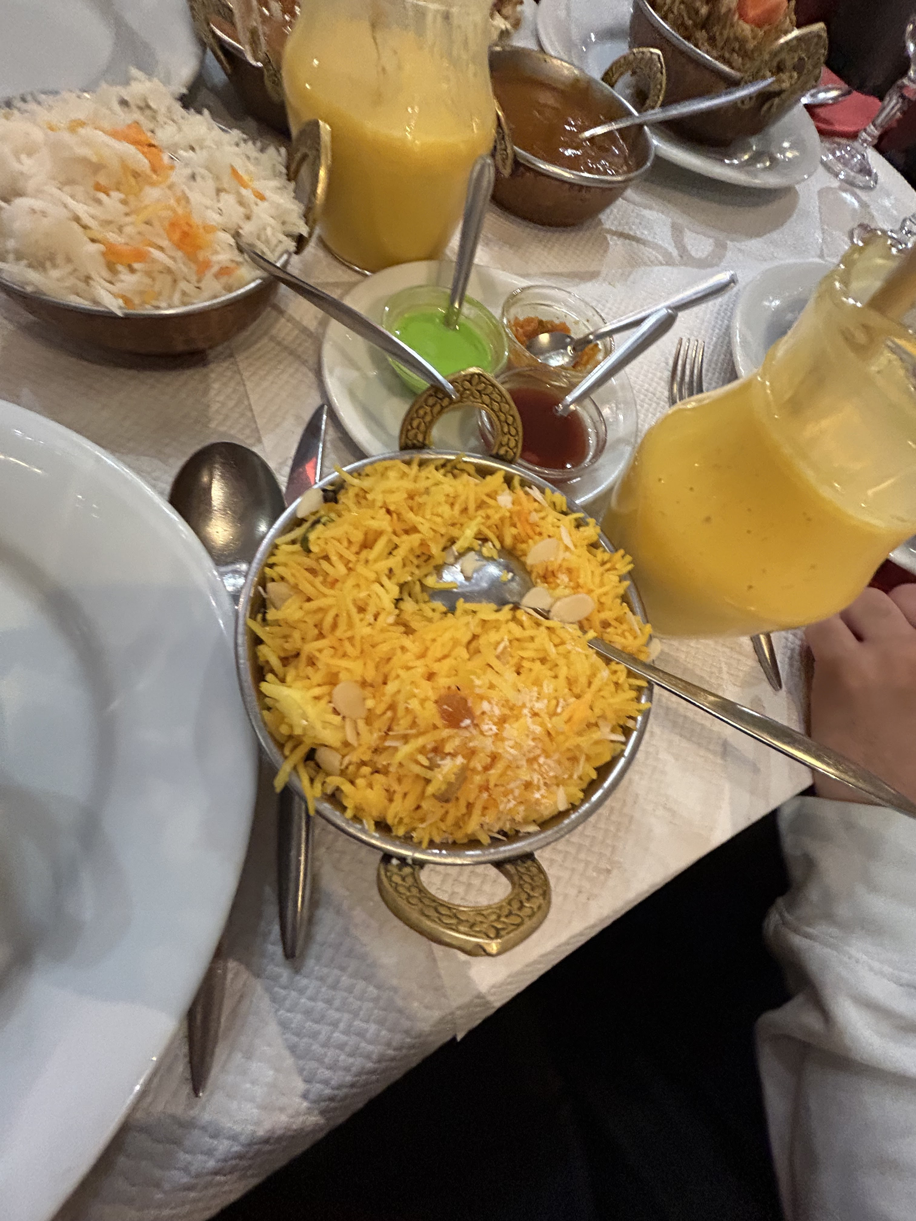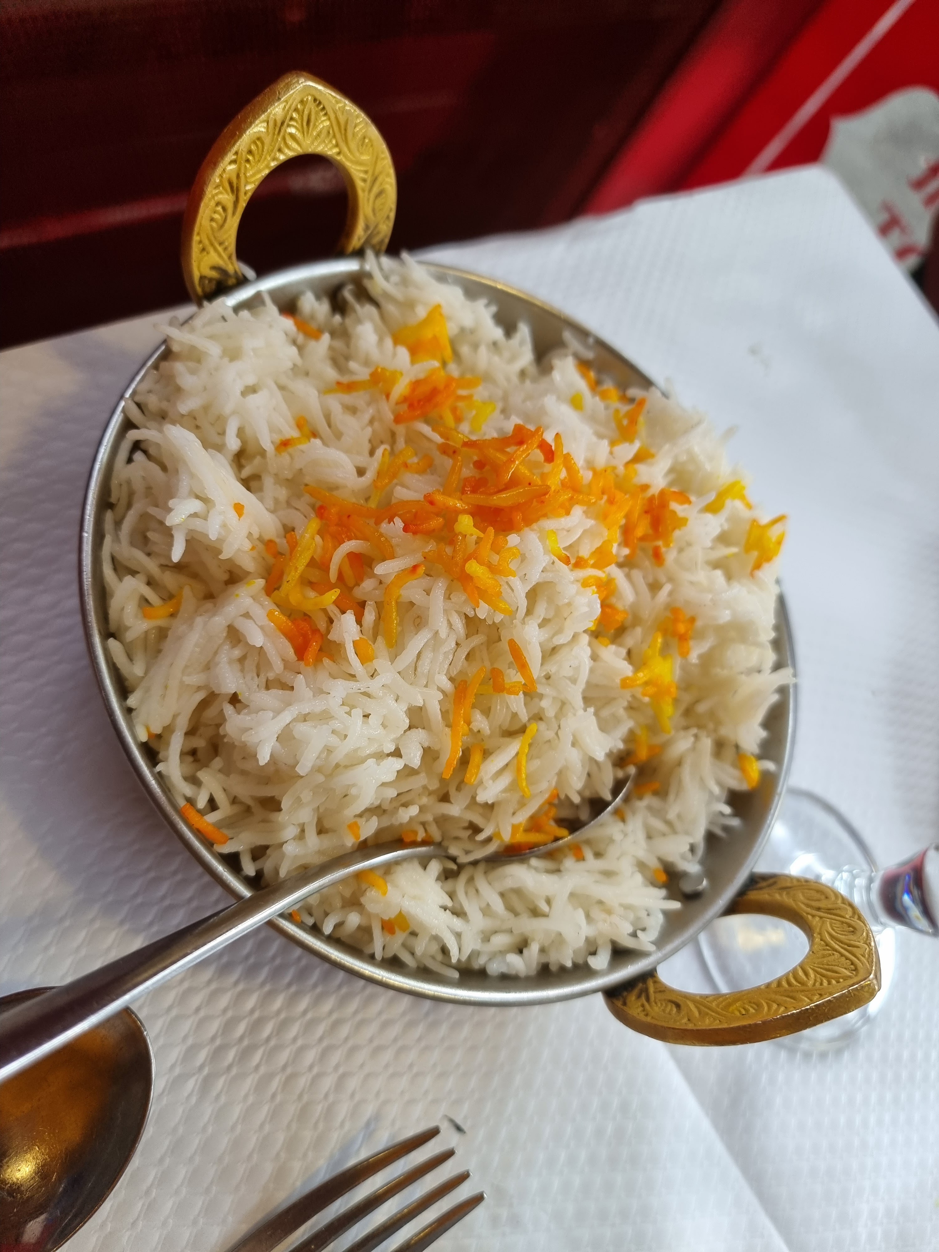J’ai mangé à deux reprises sur place avec des amies, le lieu n’est pas très jolie, le serveur est très sympa, ambiance assez calme, il manquerai un peu plus de musique, les toilettes 😕 Concernant les plats qui sont servies dans des plats typiques indiens, belles présentations, par contre les plats en sauce comme poulets, agneau,etc : plus de sauce et quelques petits morceaux de viandes perdus dans les sauces; trop de sauces et pas assez de viandes. En livraison c’est pire les plats sont pleins de sauces et très peu de viandes? Du coup, on a l’impression qu’ils nous prennent pour des cons, puisqu’in Paye le prix pour avoir des plats de qualités et pas juste du riz saucé!😡🤬