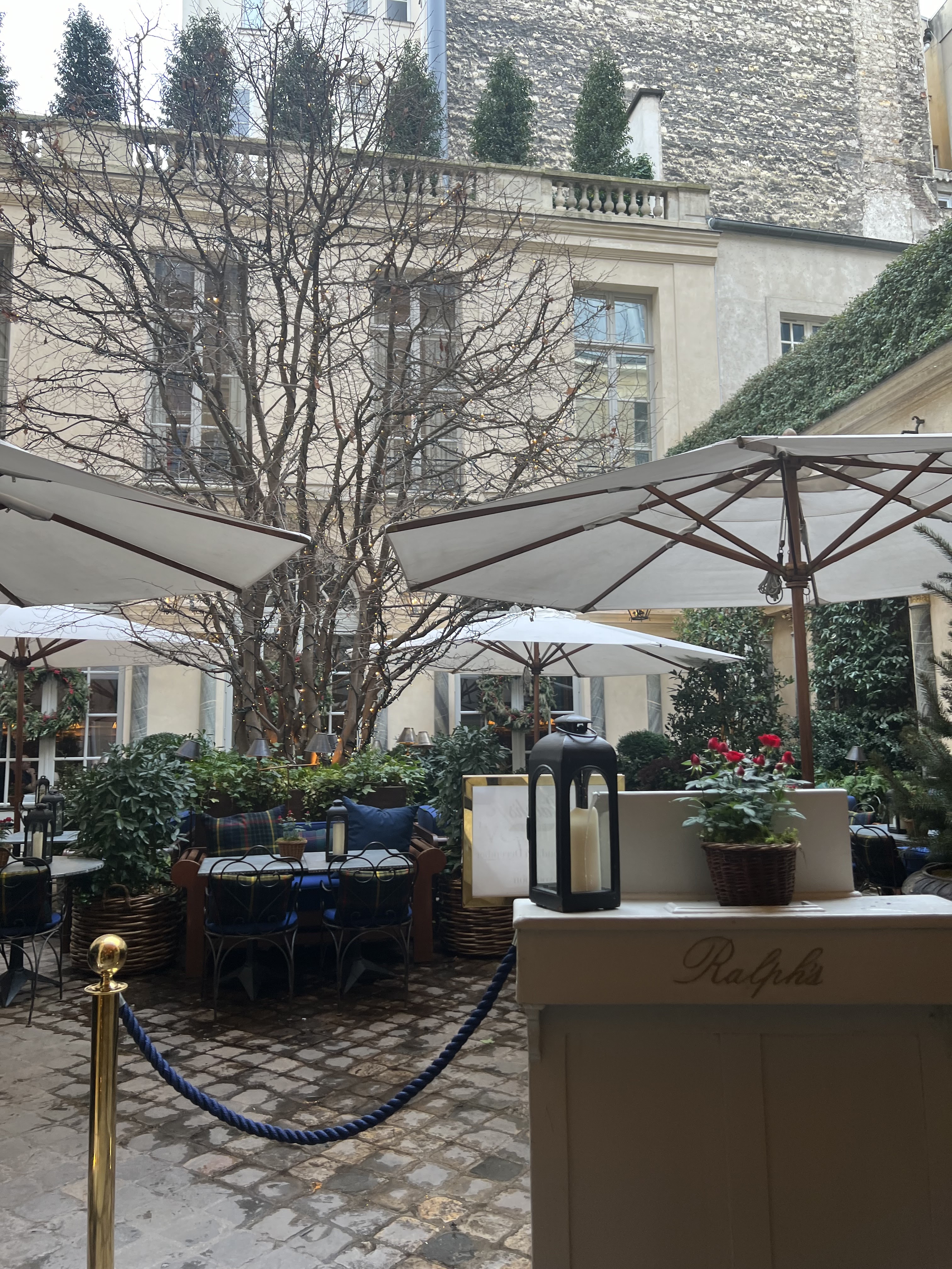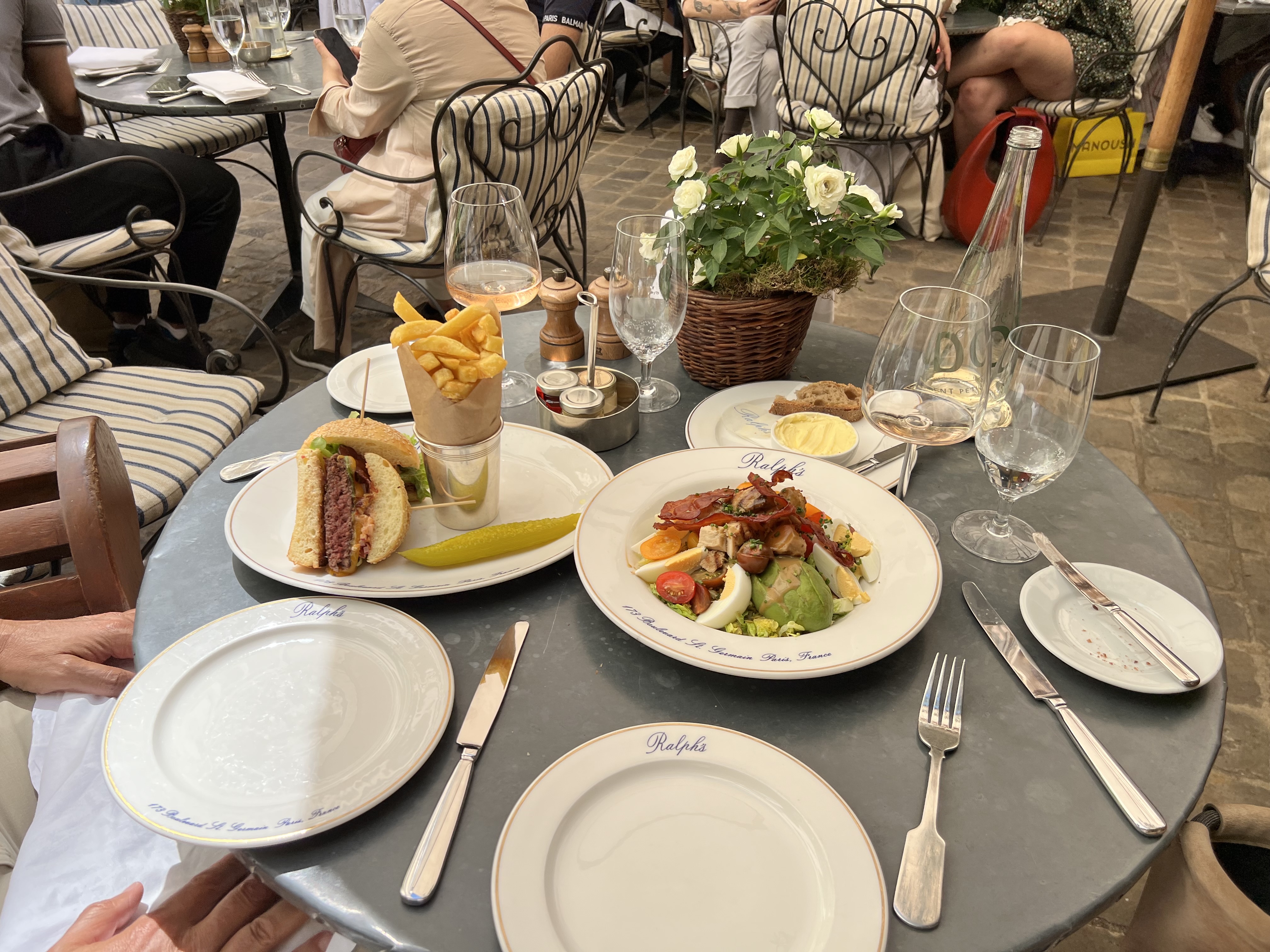 Toute l’élégance de Ralph Lauren dans son restaurant et plus précisément sa terrasse. Dans la cour de cet hôtel particulier du XXVIIIéme siècle en plein St Germain des prés, on s’installe dans des petites banquettes autour d’une table joliment dressée. Les serveurs et serveuses très jeunes dans leurs tenues classiques de la marque s’occupent de vous avec attention. Ici point de cuisine gastronomique , la spécialité c’est le burger Ralph’s accompagné de frites et pour lequel je vous conseille un verre de Zinfandel rouge c’est celui de FF COPPOLA pour l’accompagner. Nous avons eu de la chance pour la table il est préférable de réserver et il y a un voiturier. Enjoy.