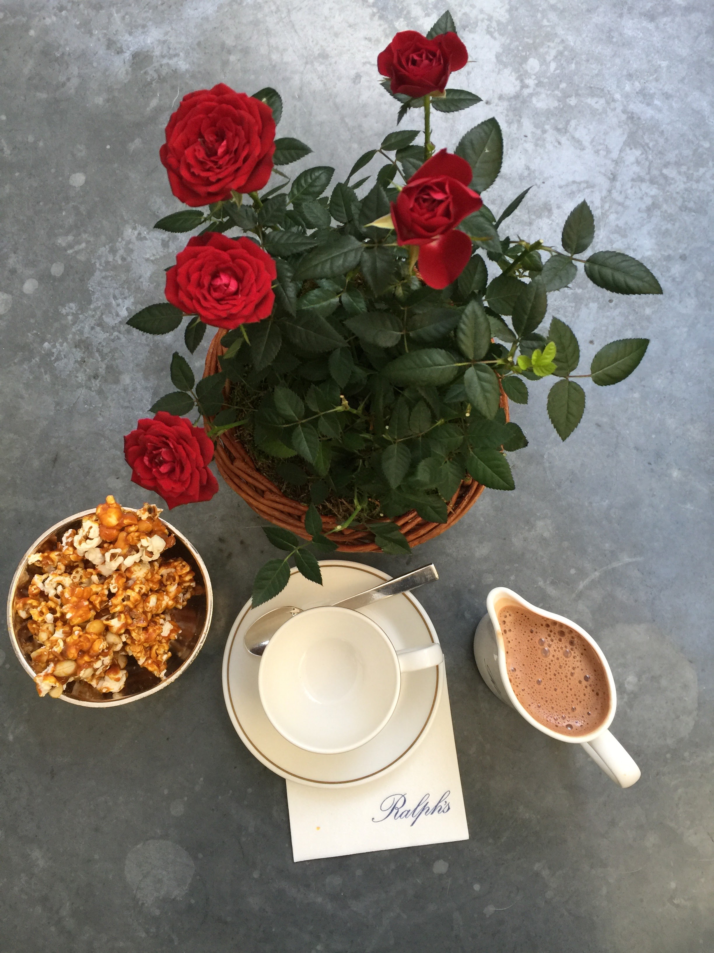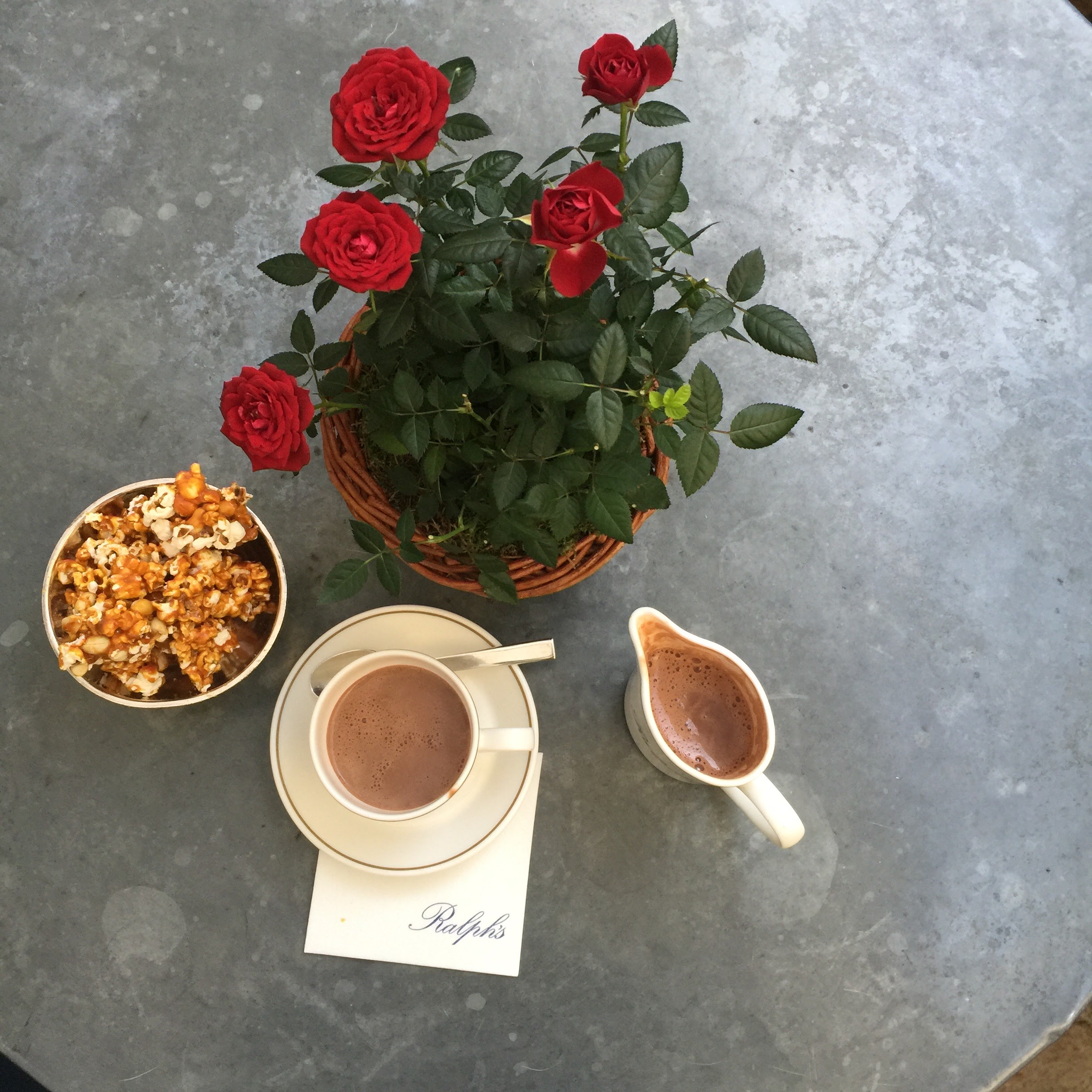 Ce restaurant, situé dans l’hôtel particulier Ralph Lauren, vous séduira par son patio fleuri, ses salons cosy, sa carte américaine et son service haut de gamme. J’avais repéré le Ralph’s dès son ouverture, sans jamais trouver d’opportunité pour m’y rendre. Ainsi, ce brunch de retrouvailles m’a semblé une parfaite occasion de découvrir les lieux. Bien évidemment, j’aurais adoré profiter de la terrasse au soleil, mais il ne fallait pas trop en demander pour ce mois de janvier. C’est donc dans un salon huppé que nous avons brunché. On se croirait dans une maison de maître version US, avec cheminée, porcelaine fine, argenterie, roses rouges et fauteuils moelleux… Tandis que nous parcourions la carte (en anglais), on nous a proposé de délicieuses olives panées en guise d’amuse-bouche. Nous avons toutes les trois opté pour différentes versions des oeufs benedicts (bacon, saumon fumé ou épinards), accompagnés de frites. Les portions sont généreuses et nous aurions pu nous contenter de ce plat. Mais nous avions déjà louché sur les assiettes de nos voisins. Nous avons donc goûté un dessert différents chacune : Carrot Cake, Cheese Cake et Chocolate Cake. Sans oublier les pop corn et amandes caramélisés servis avec le café. Certes, l’addition est salée (environ 50€ par personne), mais compte tenu du cadre, du service et de la qualité, vous en aurez pour votre argent. A noter que le brunch est servi à table, le dimanche uniquement.
