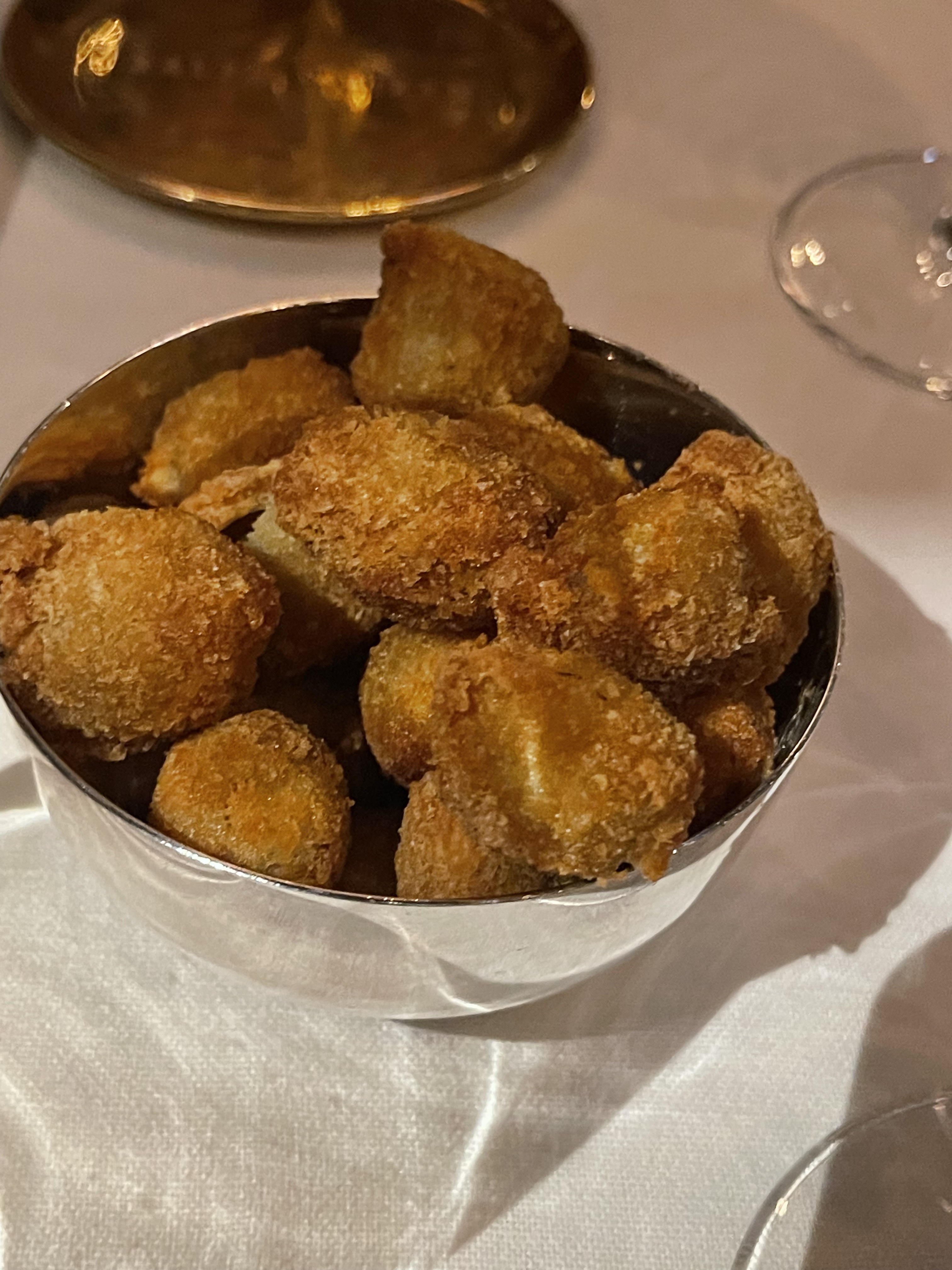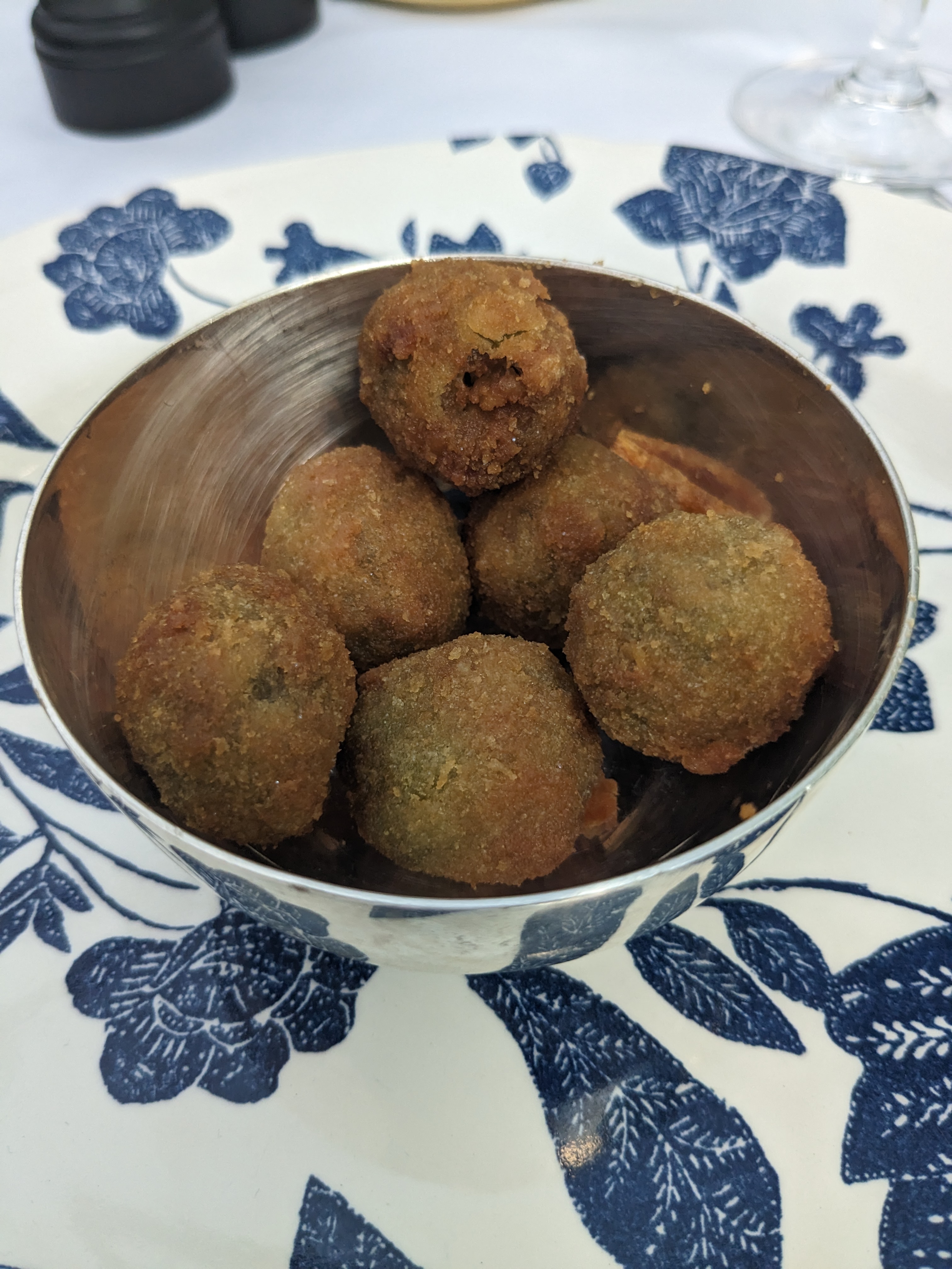 L'ambiance est vraiment exceptionnelle. Une foule bien habillée, du jazz en fond sonore, et la cour et sa déco magnifique, confortable. Les olives panées sont un sublime complément aux bonnes boissons.