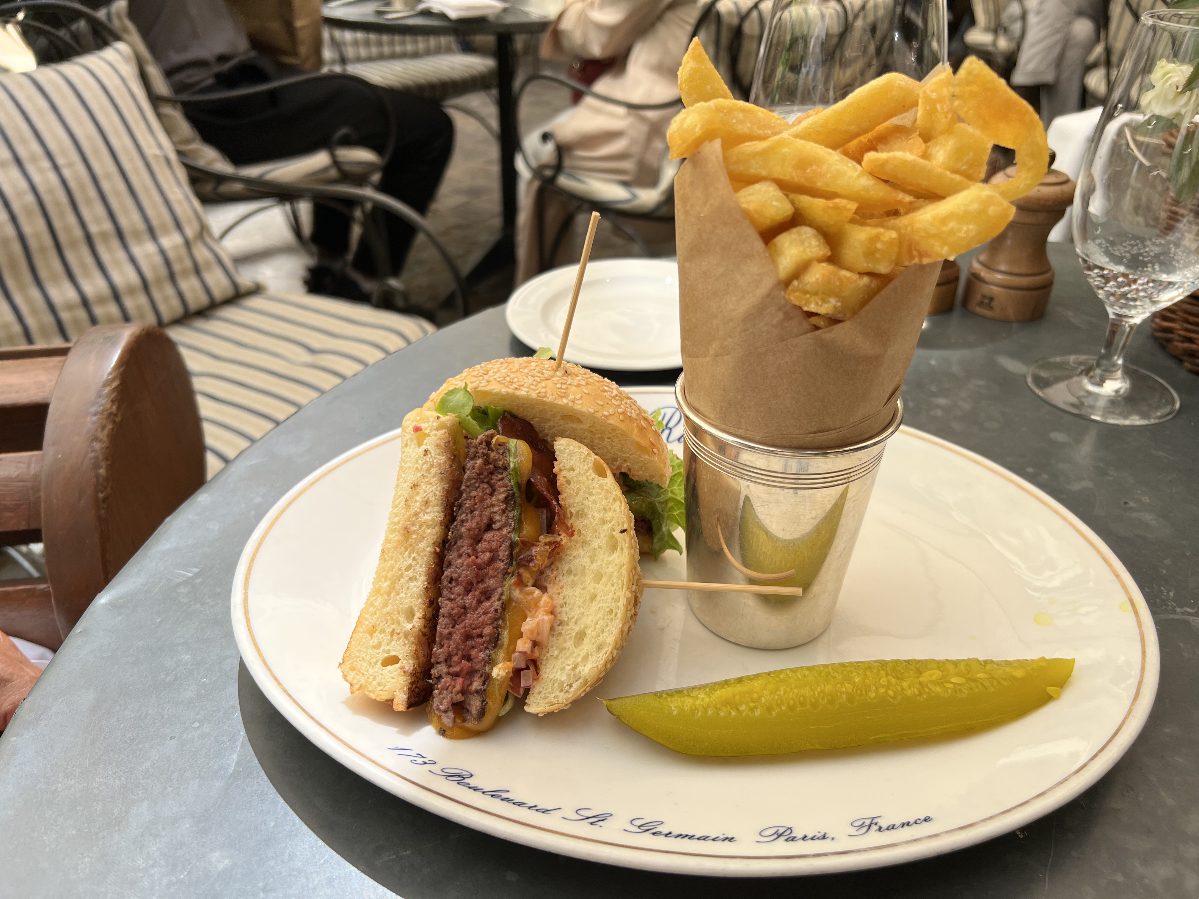 Le cadre est très beau, les tables sont espacées dans un petit patio très intimiste situé à Saint-Germain, seulement on aurait pu s’attendre à mieux au vu du prix de la soirée : (i) les plats sont hors de prix, e.g. 30€ pour un burger classique (non truffé, à ce prix là on pourrait s’y attendre) avec 3 frites qui se battent en duel; (ii) nous sommes arrivées à 19h30, 2 personnes et avons été placées à une table; celle d’a côté (vide) pour 2 personnes nous semblait plus agréable et lorsqu’on a demandé si on pouvait plutôt s’installer à cette table-là, on nous répond qu’elle est « réservée » (sans blague, on a réservé aussi et sommes arrivés avant - curieux comme justification); (iii) lorsque nos verres d’eau étaient vides, il fallait constamment rappeler au serveur de nous les remplir et (iv) le restaurant accepte les petits chiens, mais dans ce genre de lieu on se serait attendu à ce que la gamelle d’eau soit apportée spontanément. En résumé, le cadre est beau, la nourriture correcte quoique hors de prix, mais le service laisse à désirer.