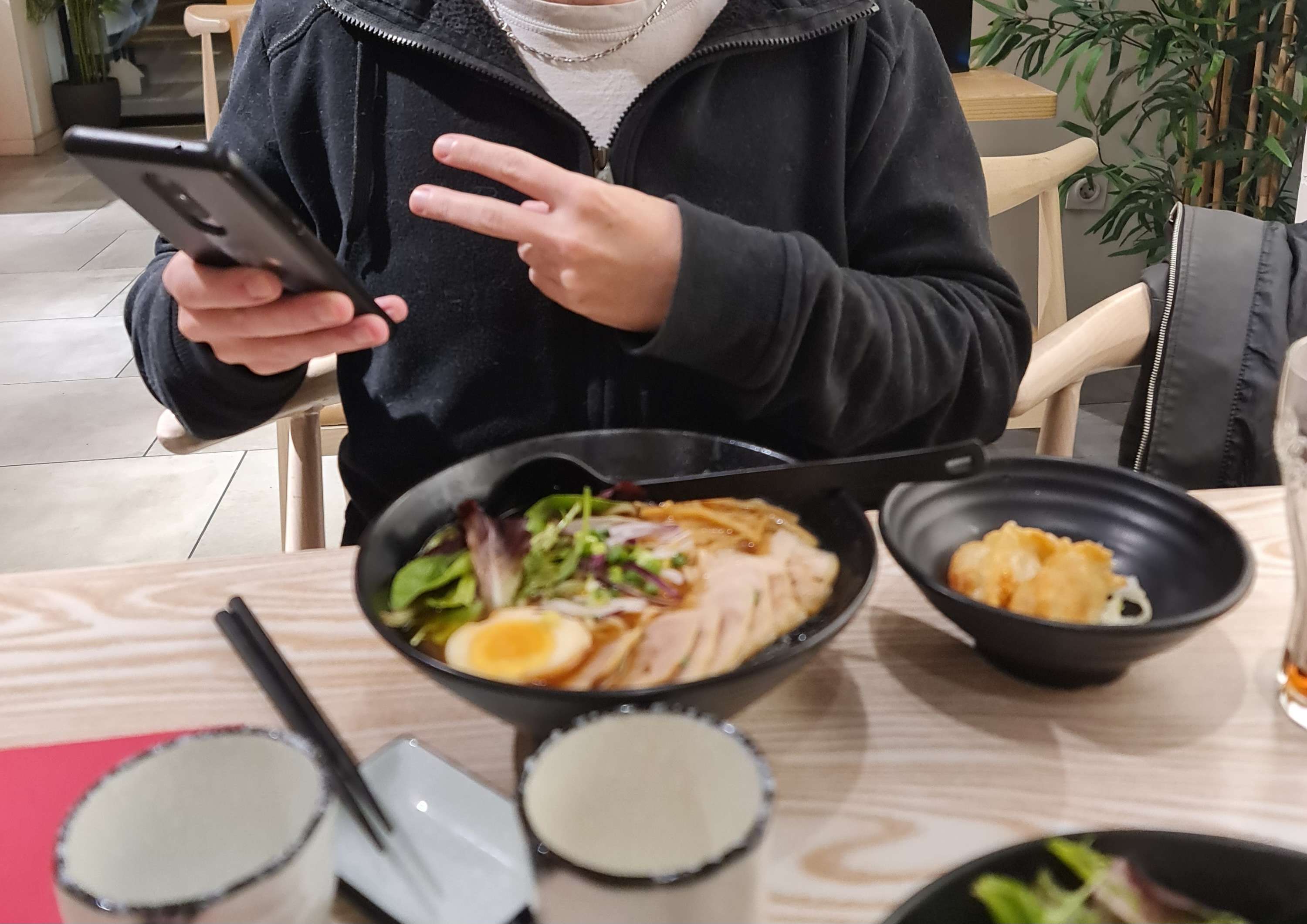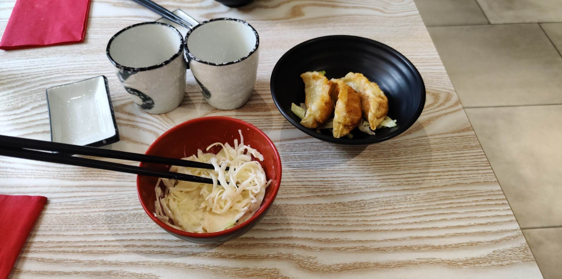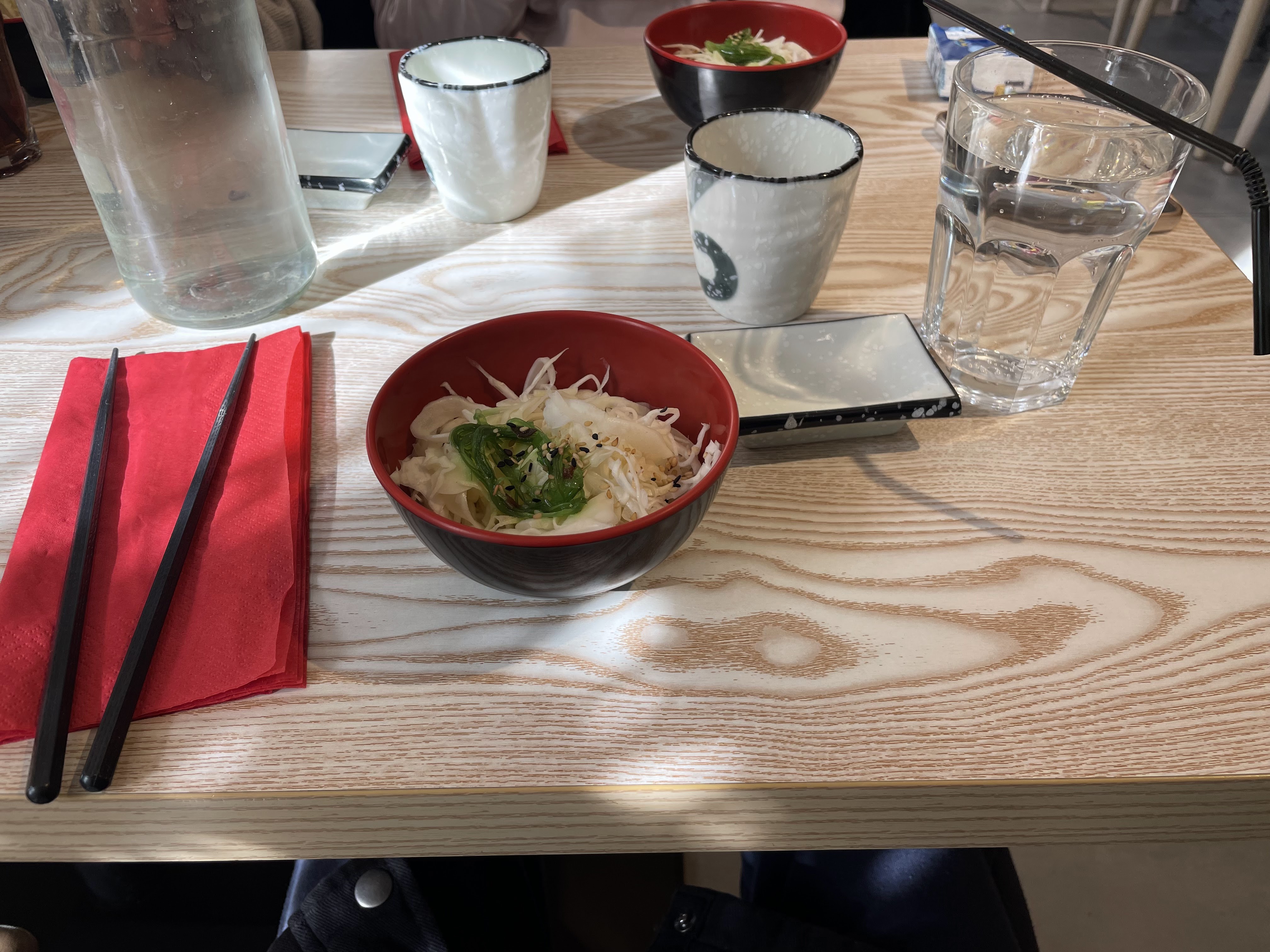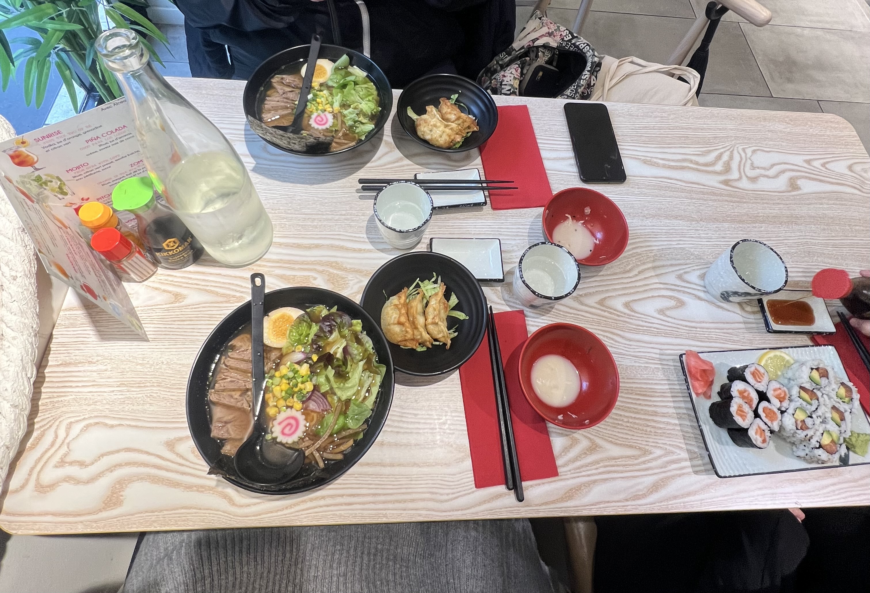 Bon mais sans plus. Salade de chou un peu sèche mais très bon raviolis ! Ramen très salé et trop d’ingrédients qui gâche un peu le goût. Dommage