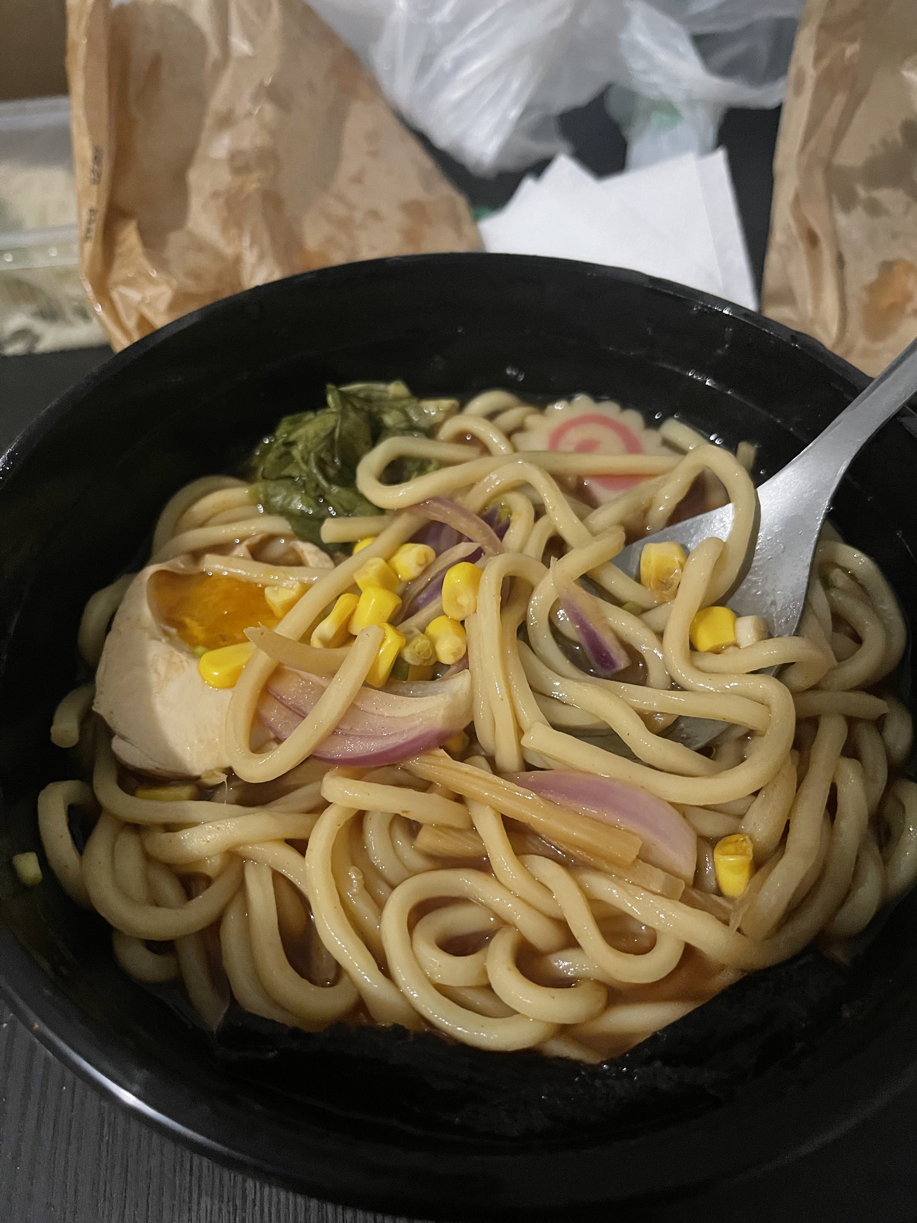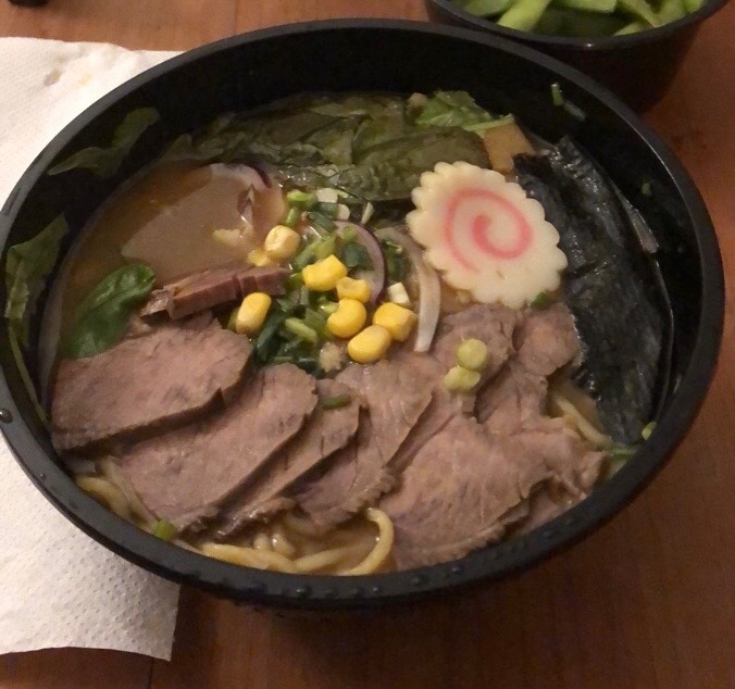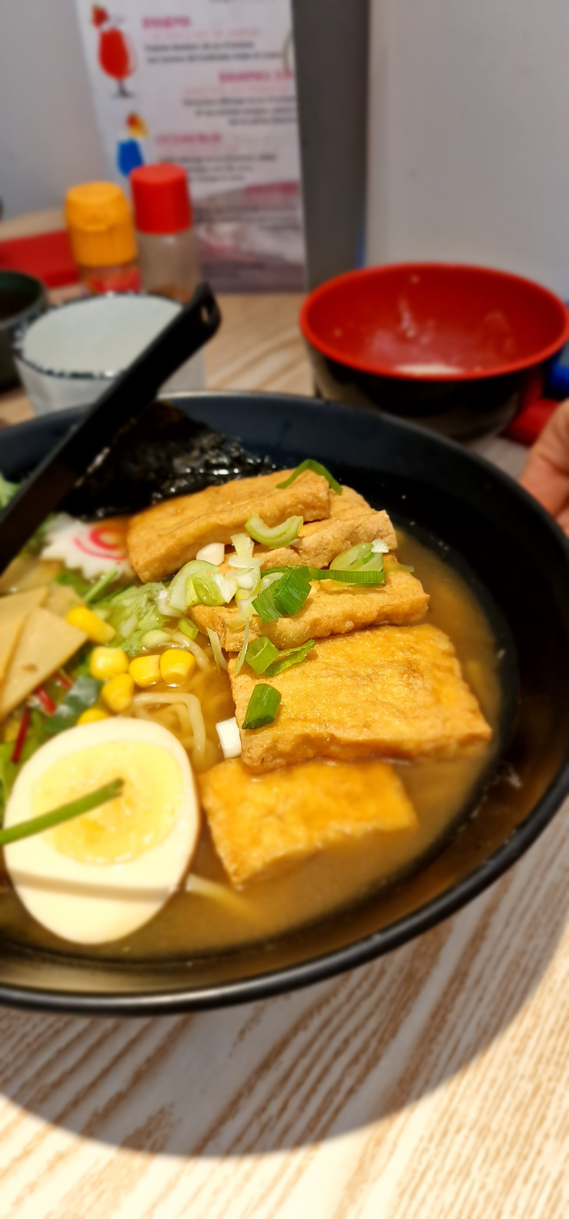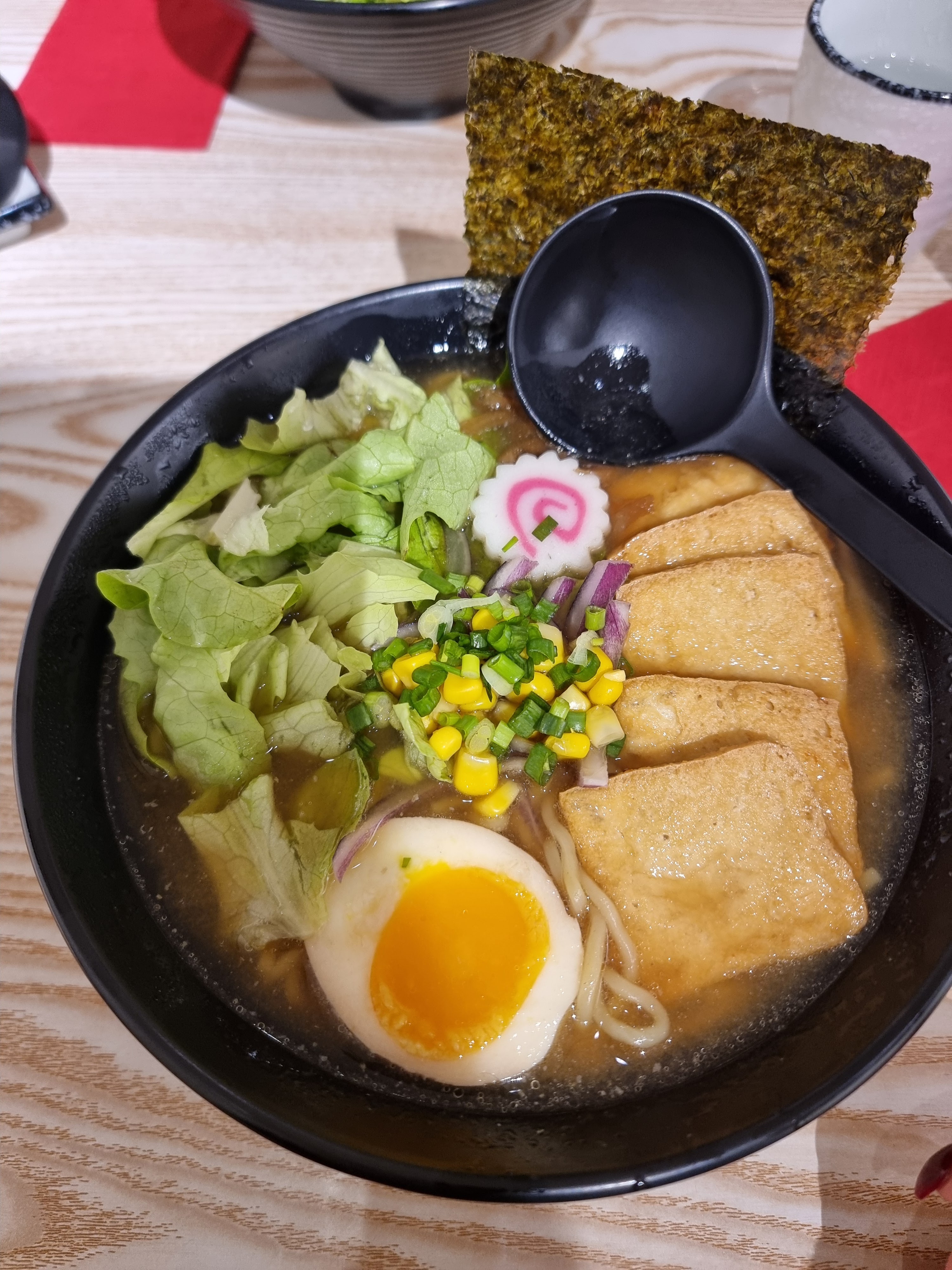 Surprenant de voir du maïs, de l’oignon rouge et de la laitue dans un ramen. Le goût n’était pas à la hauteur d’un ramen authentique.
