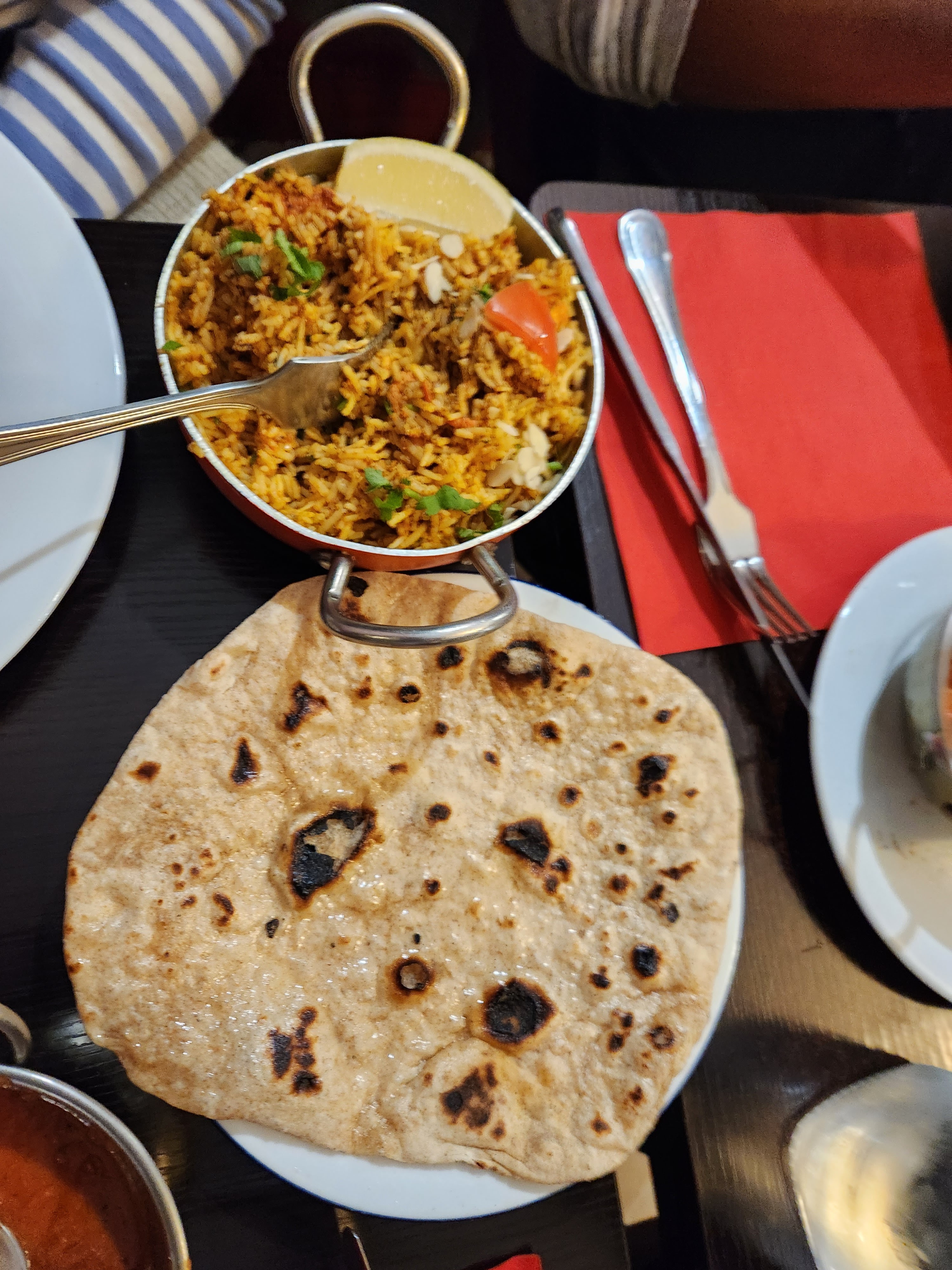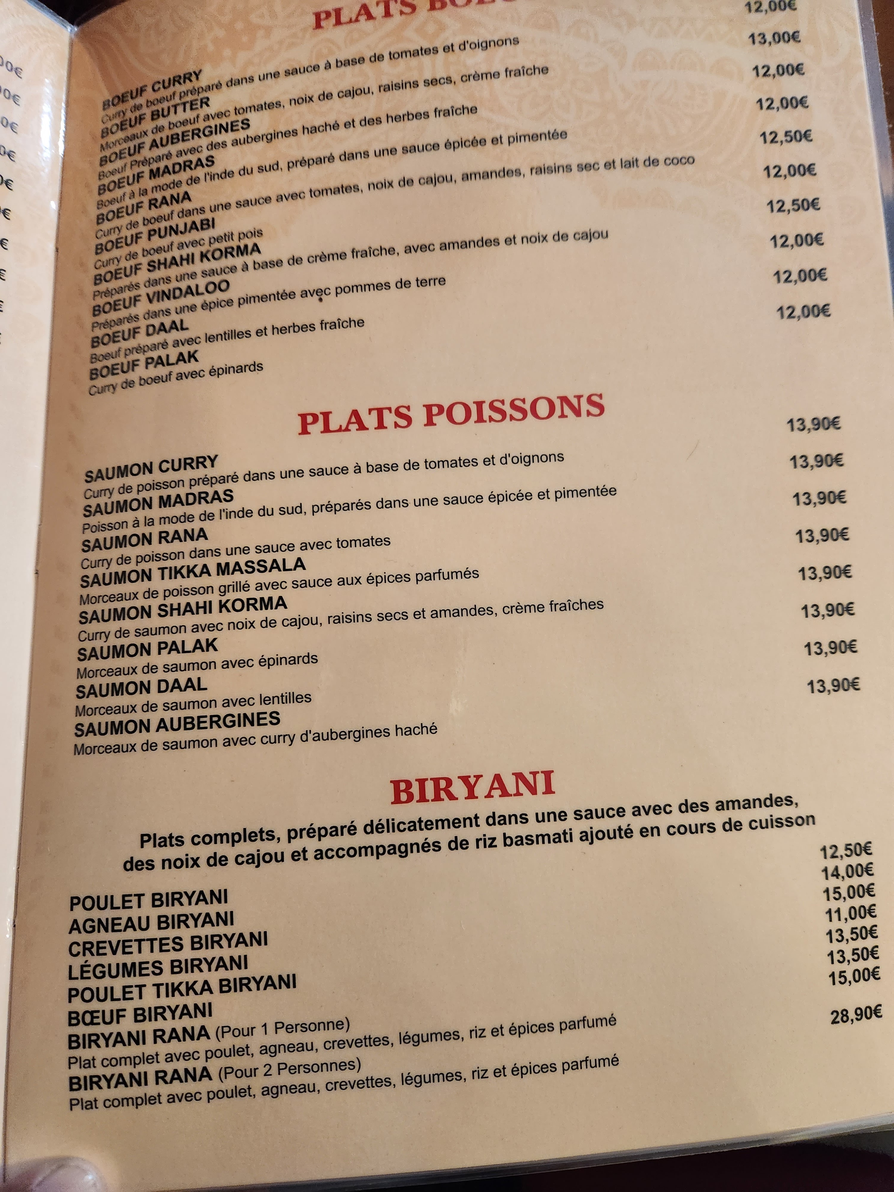 Excellent ! Nous étions 5, j'ai prit un poulet marsala qui était juste excellent, mon frère un poulet curry, ma mère une gambas, ma nièce une petite entrée (kebab, qui n'a rien à voir avec un kebab turc) et mon beau père du boeuf avec du riz rajpoot. Le riz rajpoot est vraiment à choisir il était exquis ! Les naan était également bon (naan ail fromage et oignon) malgrès que celui à l'oignon était un peu trop croustillant à mon goût. Mon beau père a prit du pain complet il était également très bon. Dommage que le restaurant soit caché en tout cas le personnel était très aimable ! Je recommande