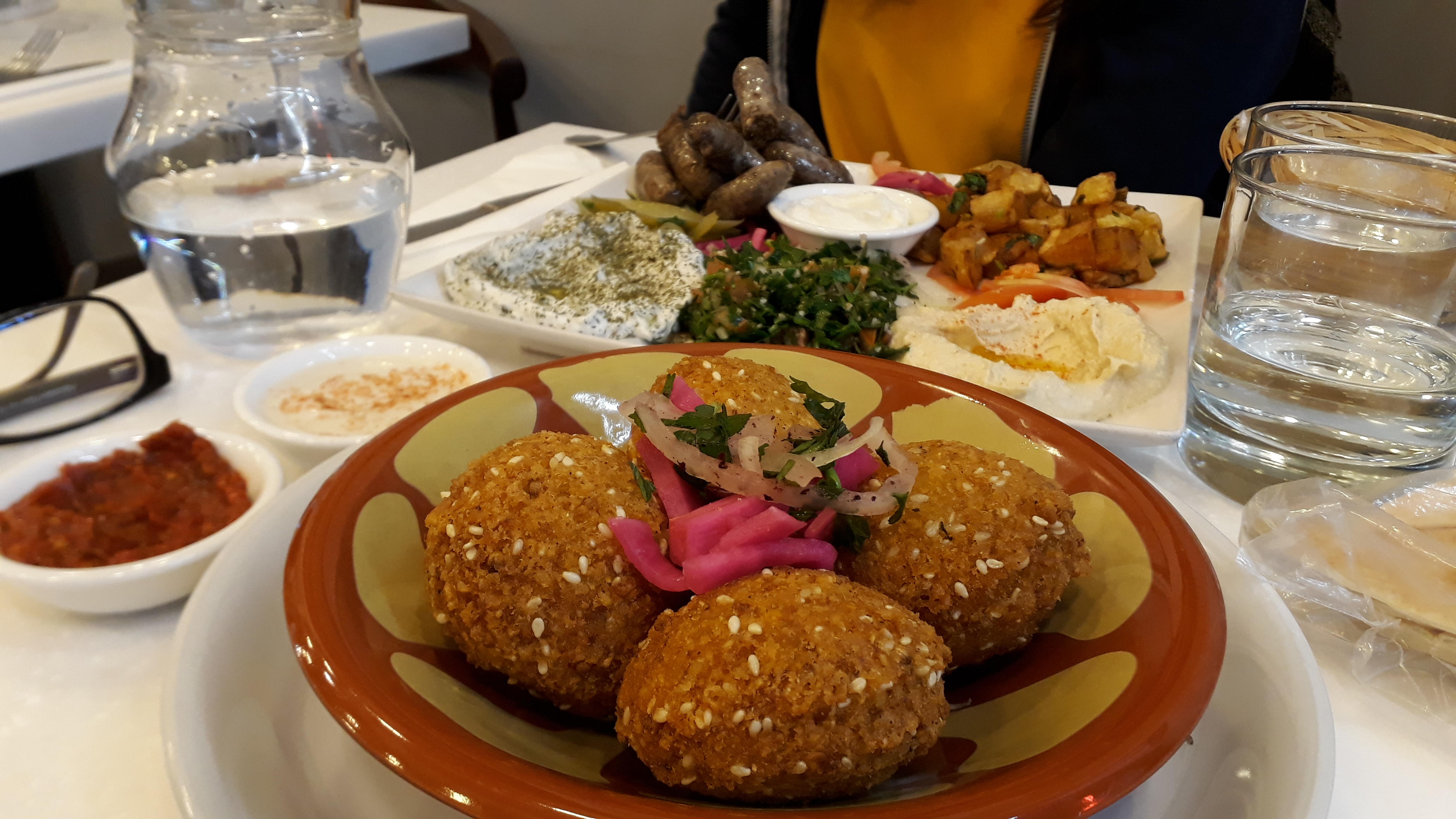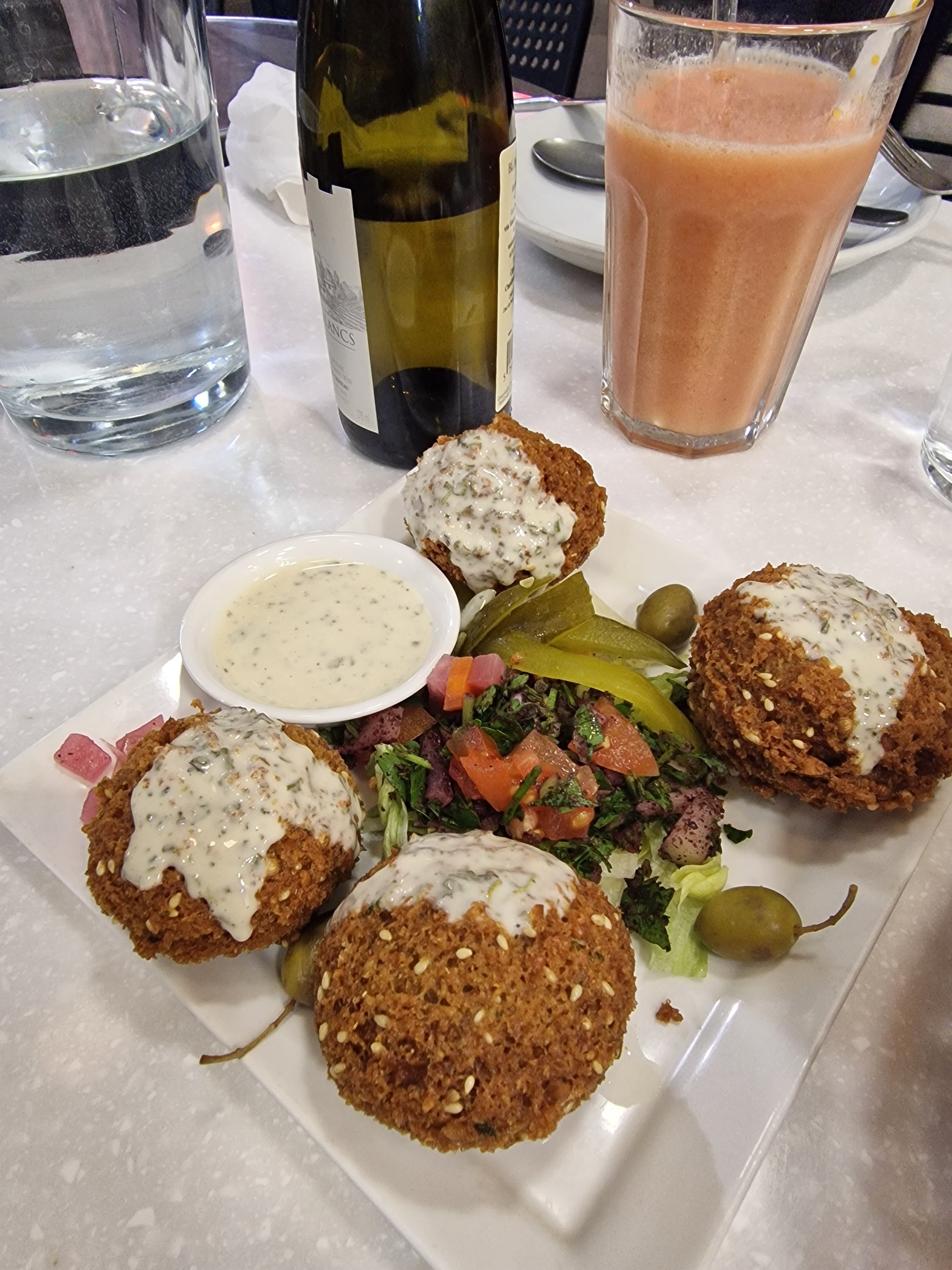 Les mezze sont délicieux surtout le caviar d'aubergine et le Houmous! Les rikakat et les desserts sont aussi très bons ! Les falafels sont en revanche un peu secs mais dans l'ensemble c'était très bon! Pas d'alcool servit dans ce restaurant, pas embêtant mais bon à savoir !
