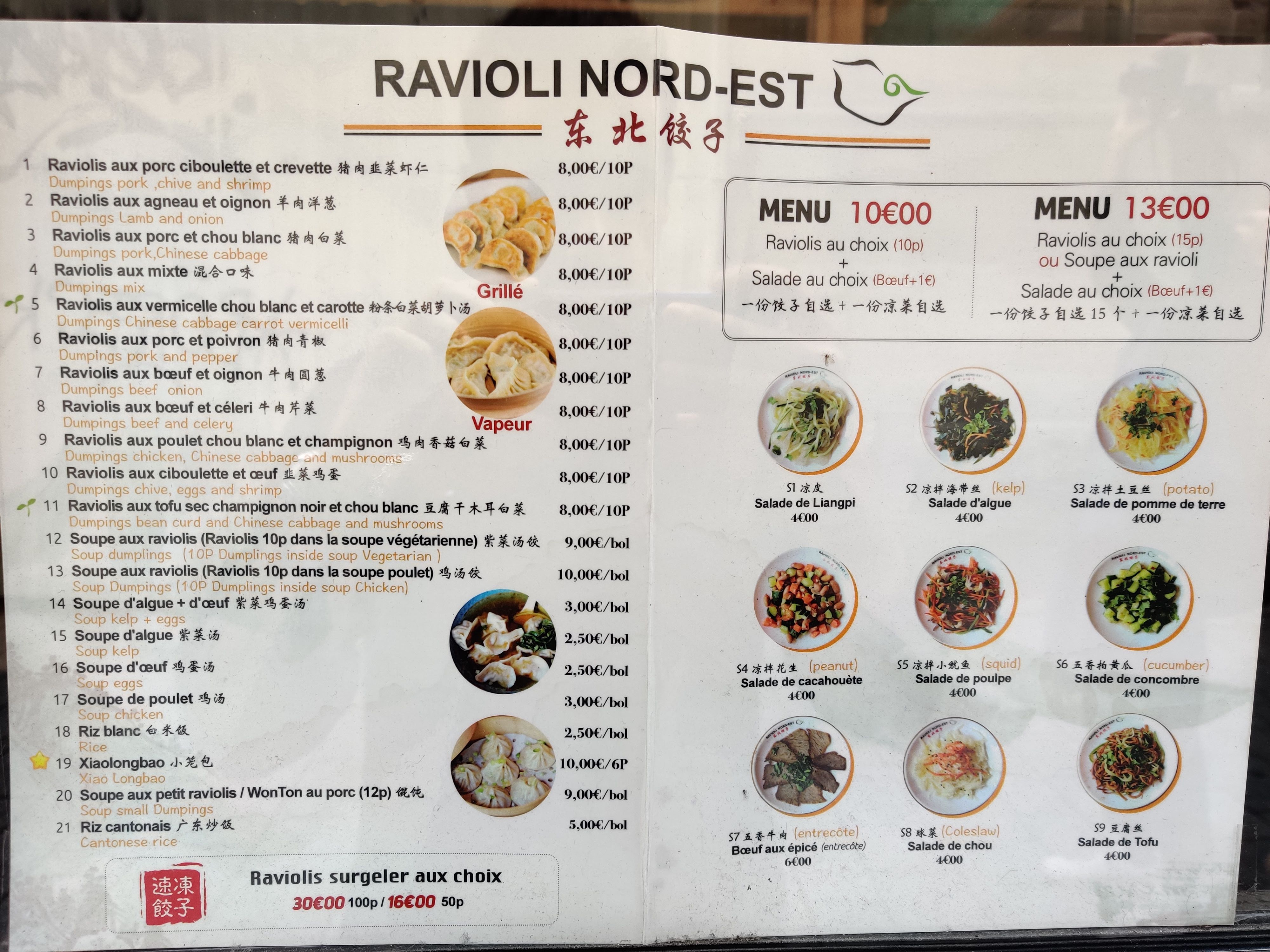 Menu raviolis (10 pièces vapeur ou grillés) + salade. Le tout pour 10 euros. De bonnes saveurs et un très bon rapport qualité prix.