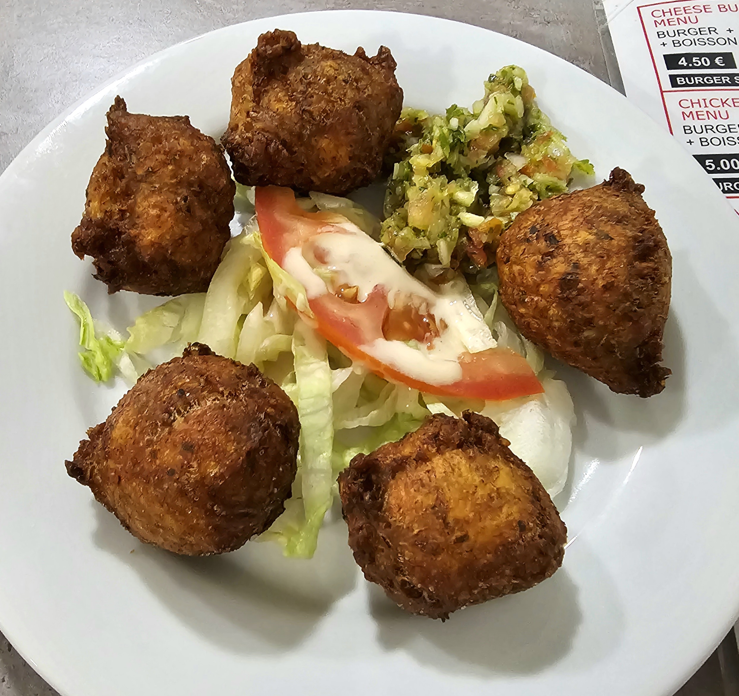 Ce n’est pas du tout une pâte à bokit, le goût n’y est pas. Les accras c’est pas ça non plus. Les alokos trop moles. J’ai pris un bokit viande hachée et un autre aux saucisses et… déception.