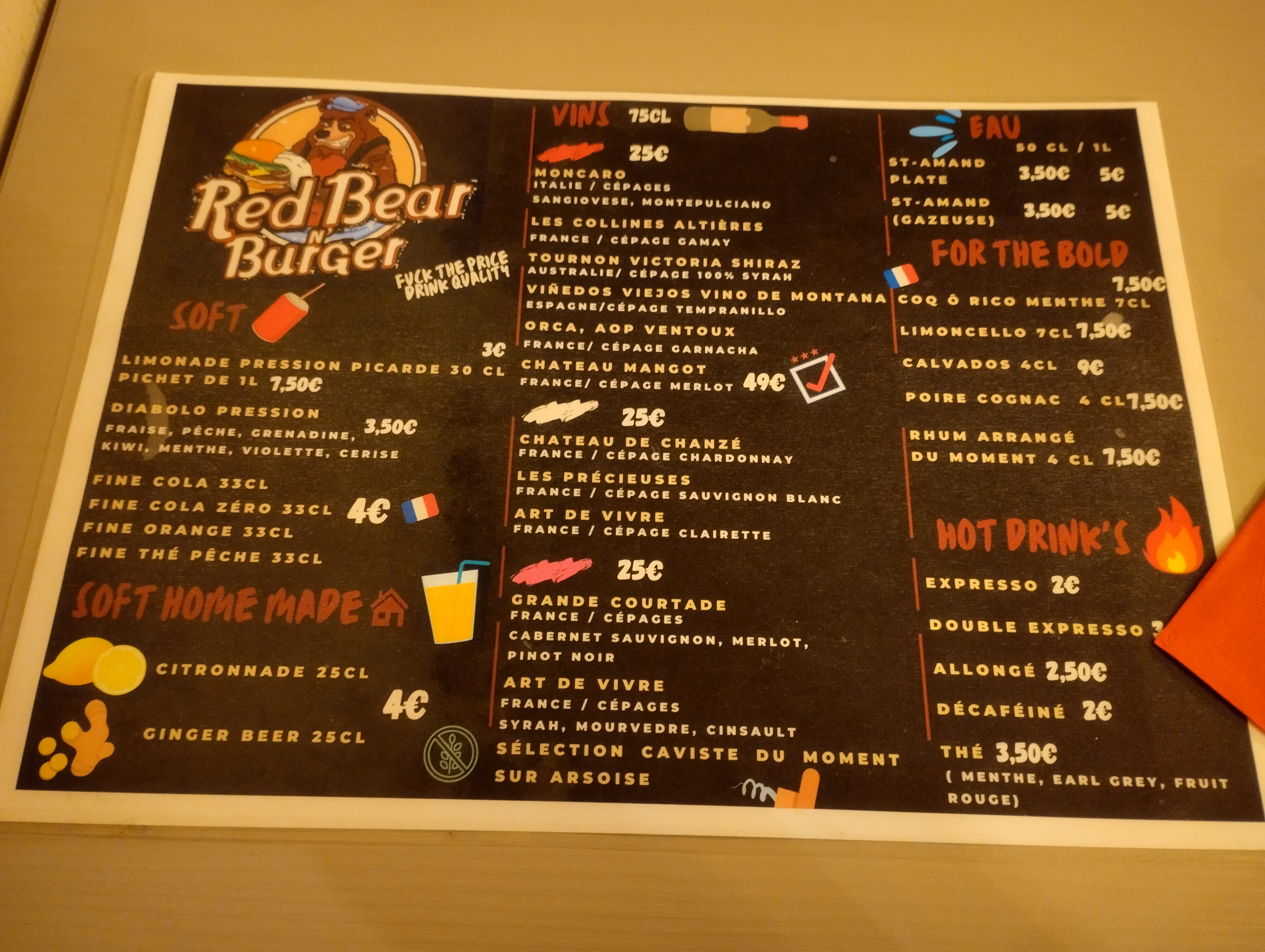 Nous y sommes allées pour la première fois, et nous avons été conquise. Le rapport qualité-prix est tout à fait respecté. Quand on voit d'autres enseignes de restaurants à la chaîne qui font à ce même tarifs mais en moins bonne qualité et quantité ! je préfère de loin manger maintenant au red Bear N'Burger où tout est fait maison. Tout est bon! Que cela soit de l'entrée, les boissons, les plats jusqu'au dessert. Le serveur était très sympathique et disponible. Préférez réserver avant de vous y restaurer, c'est une petite salle et qui peut également venir vite bruyante selon le monde. Le seul bémol Ça serait la porte d'entrée, les courants d'air, étant en période chaude ça va, mais l'hiver j'imagine cela moins agréable. Autrement tout été parfait, la cuisine en vaut vraiment le détour 🥰.