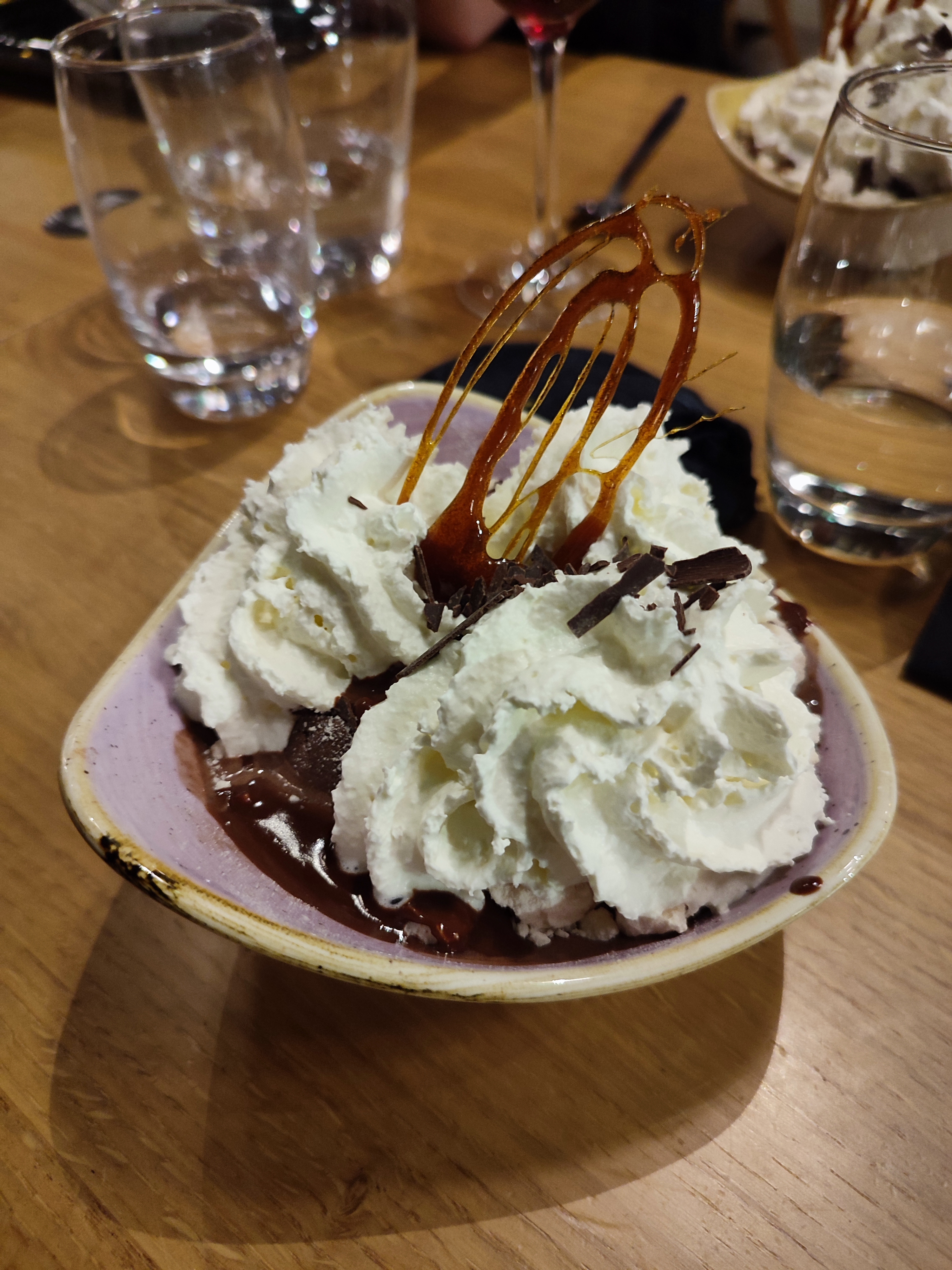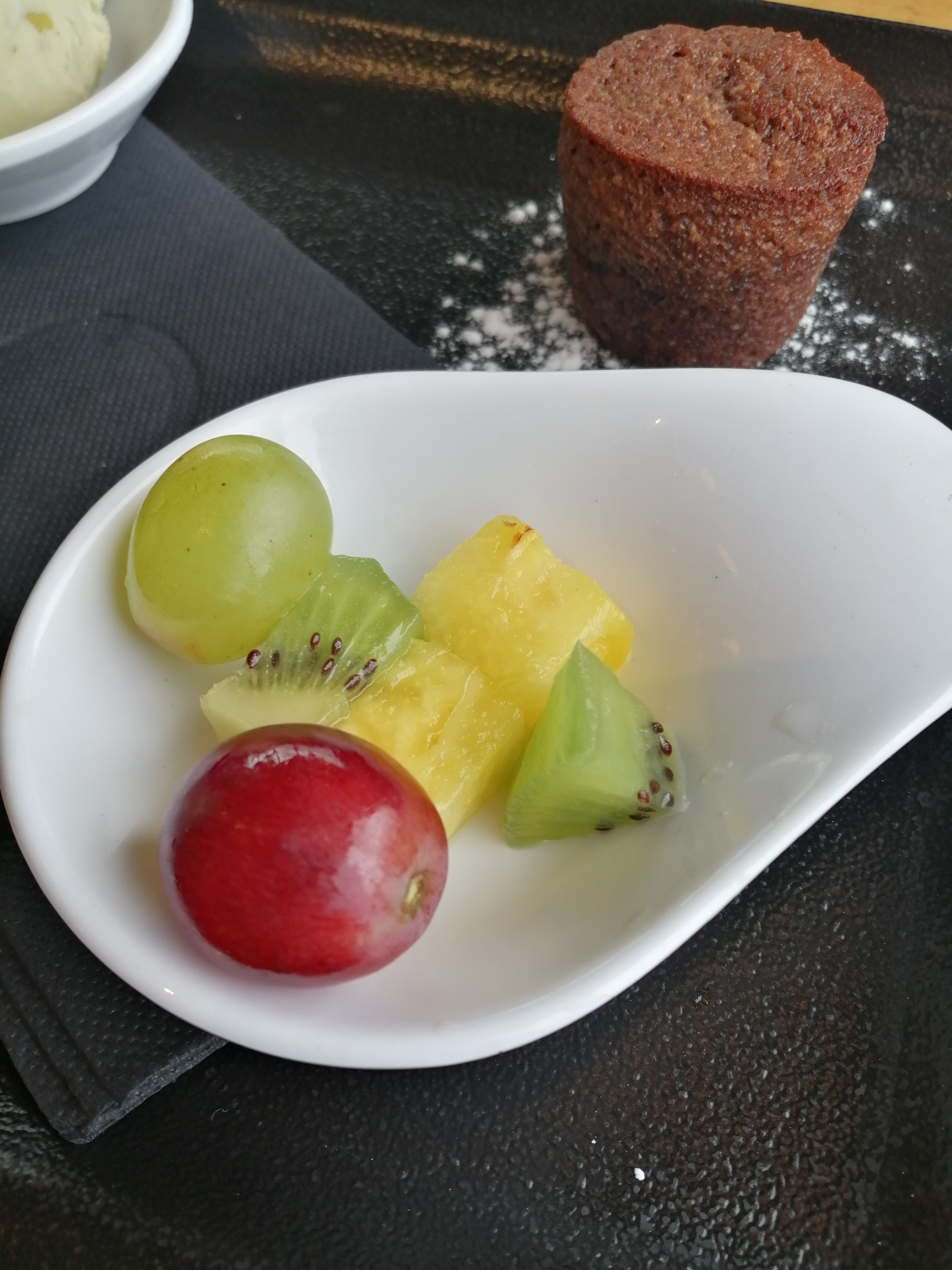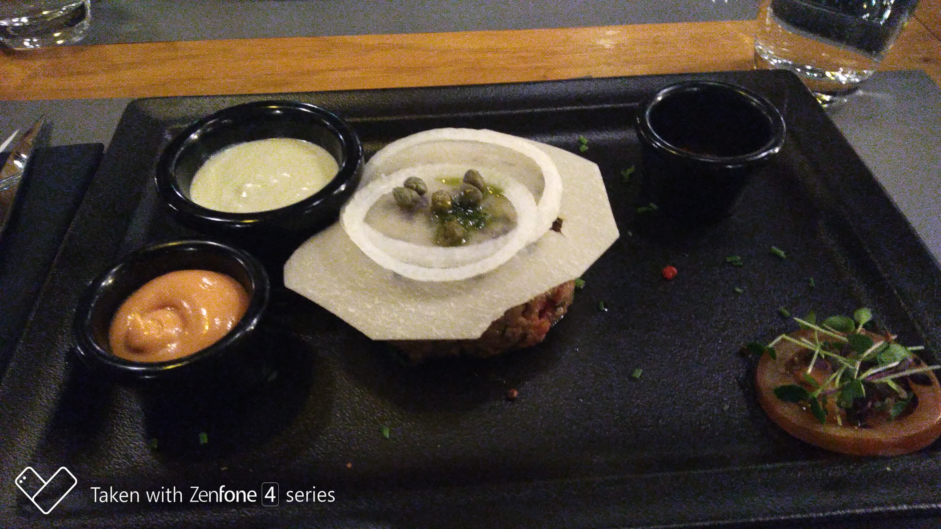 Tartare de saumon pour moi et c’était super bon avec une petite sauce aux fruits de la passion. Cœur de rumsteck pour mon compagnon, viande tendre. En dessert, nous avons pris une dame gourmet chacun, super bon mais super copieux (coupe d’au moins 750ml) ! Nous avons gâché, pas top ! Il faudrait faire des coupes moins grandes et donc moins chères. Service impeccable, employés sympas et pro, bon rapport qualité/prix ! Par contre, une étoile en moins pour l’insonorisation de la salle (mettre des éléments ou panneaux acoustiques) et le manque d’intimité !