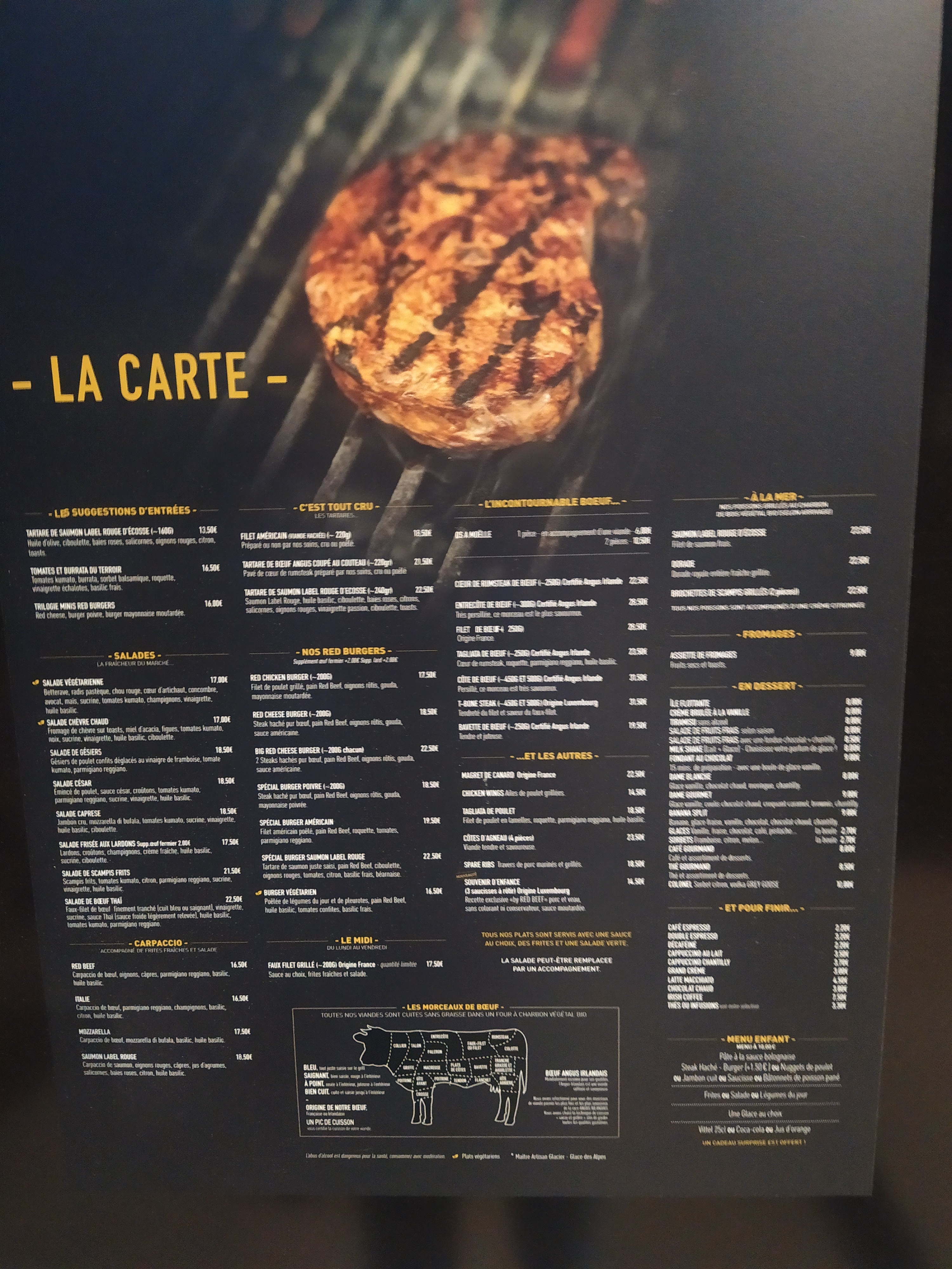 Super accueil ,serveur(euse) super sympa service rapide mais pas trop. Pas pousser à partir ça change de d'autre services de restauration. Produit très bon et bien présenté. Satisfait de ce que j'ai mangé. Restaurant propre, covid : distance respecté entre les tables,gel à disposition. Je n'ai pas mit 5 étoiles juste pour le prix un peu élevé mais je pense que la calité des produits en vaut la peine. Les photos contiennent ces produits : Le plat : -Tagliata de poulet -Red cheese Burger -Big red cheese Burger -Red chiken Burger -Côte de bœuf Le dessert : -Milkshake : fraise/pistache -Sorbet citron -Café gourmand Je conseil ce restaurant à tout les fans de viande.