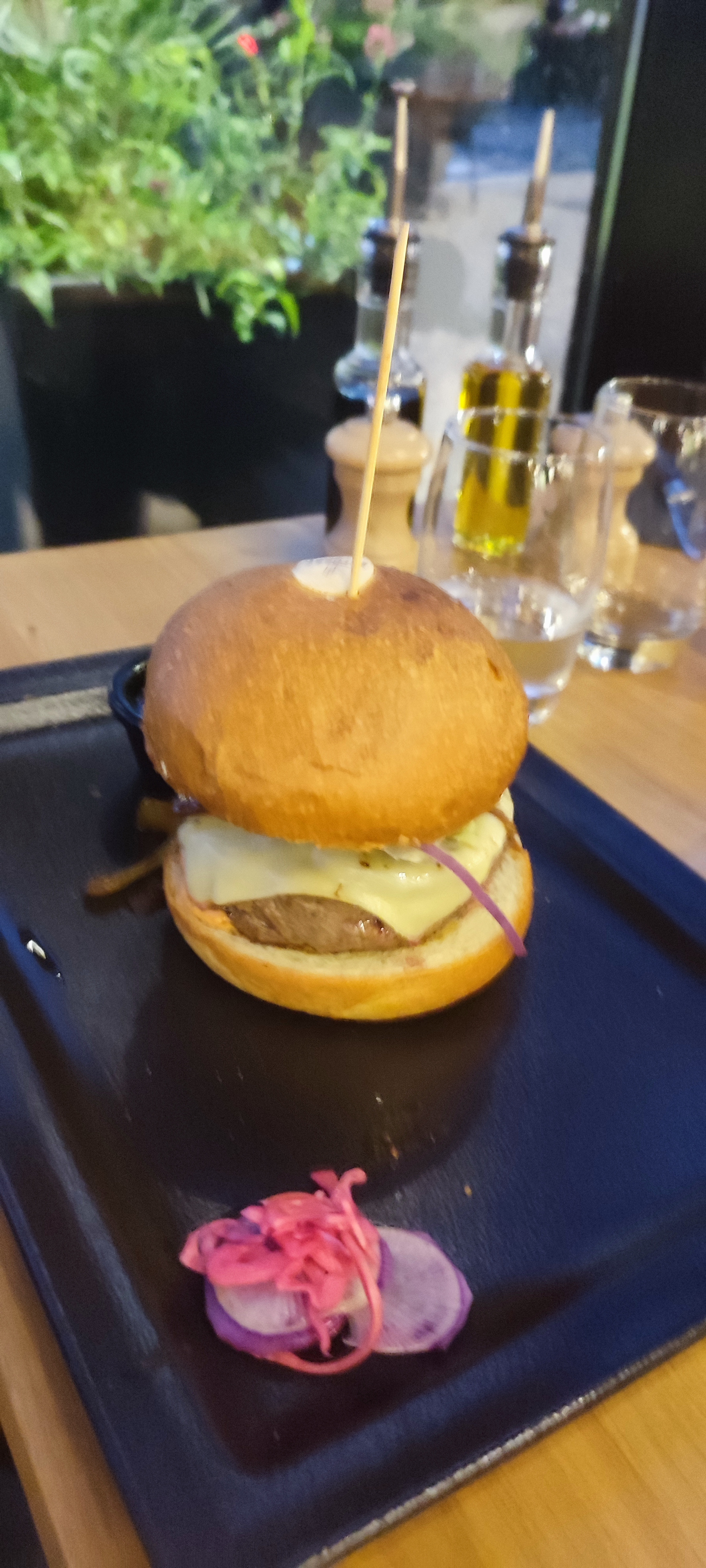 Je me suis rendue dans ce restaurant avec mon copain hier à 12h20, on nous installé à 12h30 et prit pas longtemps après notre commande qui était 2 burgers. La serveuse a essayé de nous vendre de l'eau au lieu de nous proposer un carafe d'eau car nous n'avions juste pas prononcé le mot carafe d'eau. On nous a ensuite fait attendre plus de 30min pour manger, pour au final voir arriver une assiette quasi vide, la rondelle de tomate qui était censé être DANS le burger était posé sur le côté de l'assiette. Puis une salade (juste de la salade) avec un bol de frite était disposé dans des bols à partager pour deux. Je n'y retournerais pas. Payer 16€50 pour ça c'est honteux.