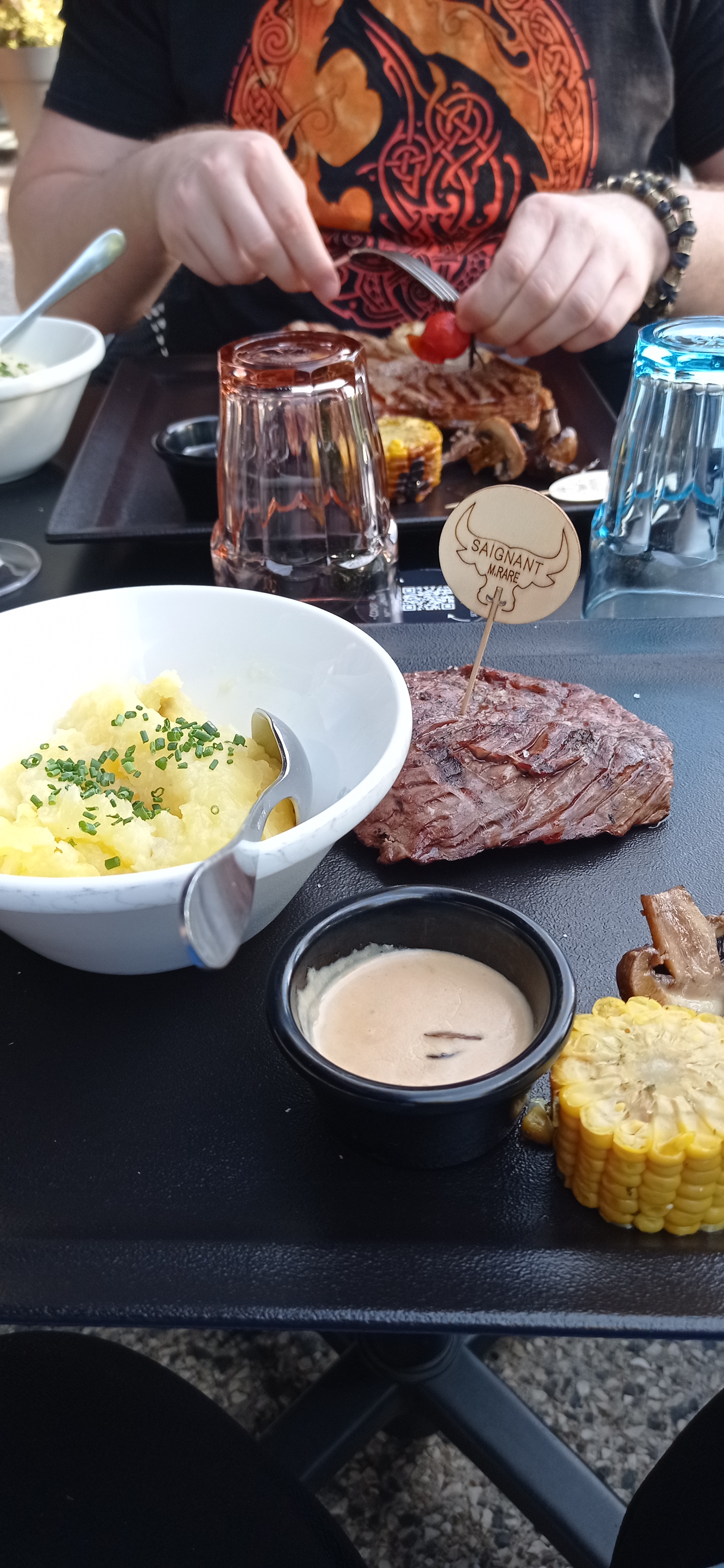 Viande délicieuse mais les frites ne sont pas du tout à la hauteur (surgelées plutôt bas de gamme) et beaucoup de gâchis, de nombreux accompagnements repartent en cuisine car servis en trop grande quantité... les poubelles doivent être pleines!