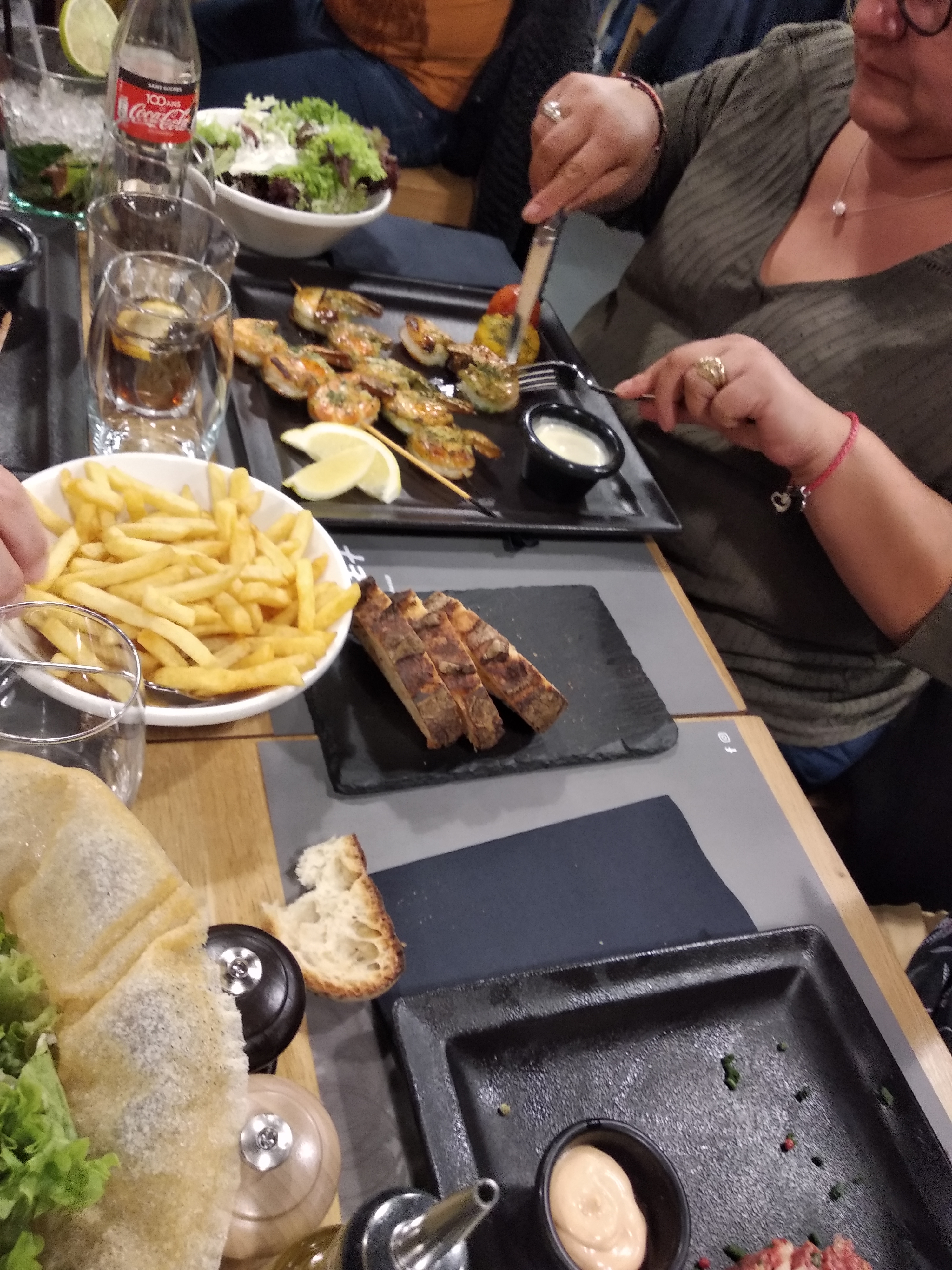 Le gros point négatif c'est que les accompagnements ne sont pas servis dans l'assiette mais à part et que vous soyez seul ou 4 vous avez le même petit plat de frites et de salade...certe qu'on peut demander pour en avoir en plus mais déjà les 1ers accompagnements arrivent plus de 5 minutes après que les viandes et burgers soient servis et la demande pour la suite c'est encore plus long, il faut vraiment être patient...bref très déçue du service...