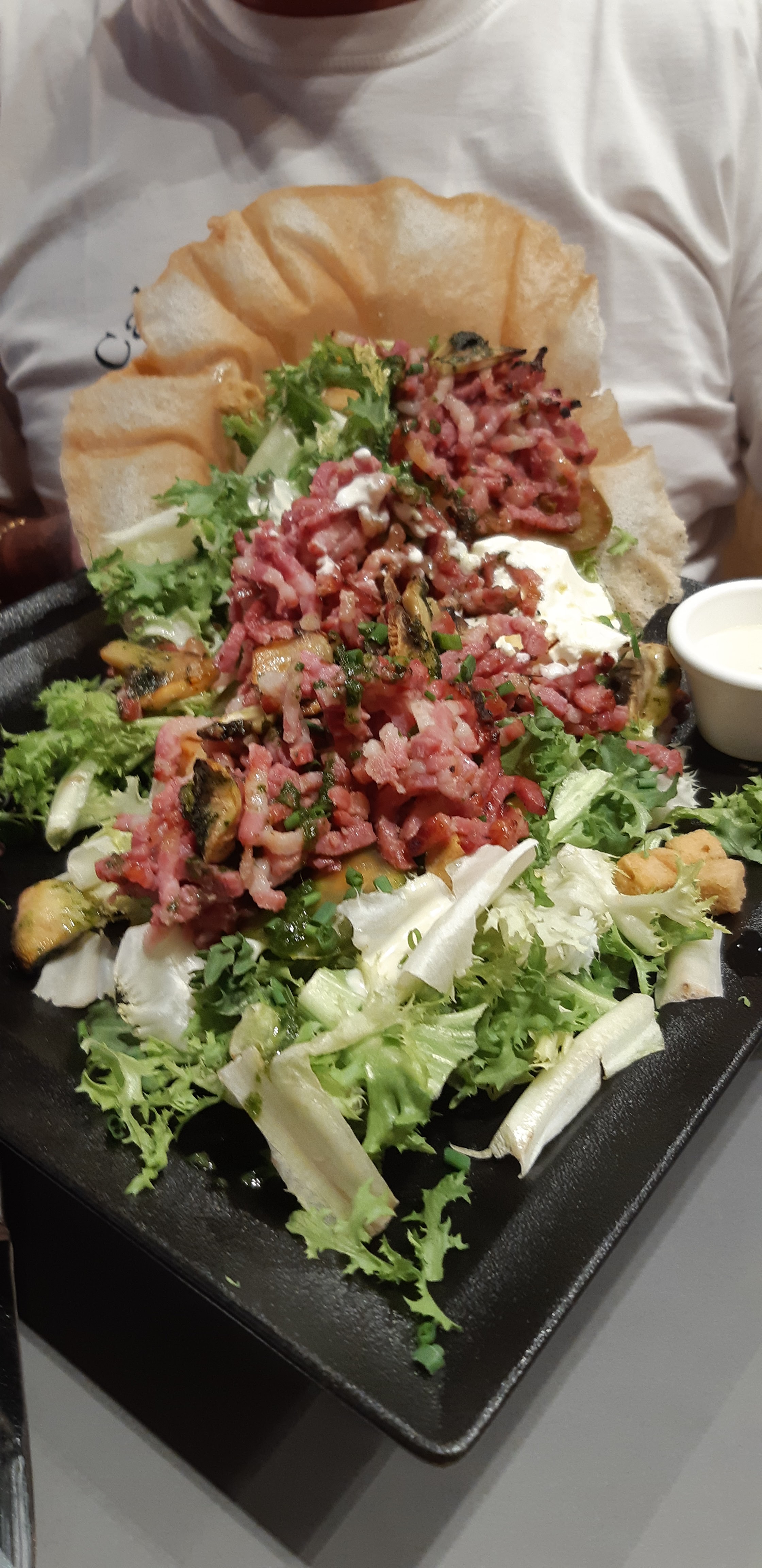 Repas copieux,bon (juste j’avais demandé la viande bien cuite et elle etait rouge) le prix est en accord avec la qualité et les portions! Service parfait! Pour moi le gros soucis c’est le bruit c’est extrêmement bruyant! L’impression d’être dans une cantine ou un Self! Alors moi je recommande cet endroit entre amis,collègues,familles mais pas en couple c’est à peine si on s’entend parler et pas de tables à l’écart!