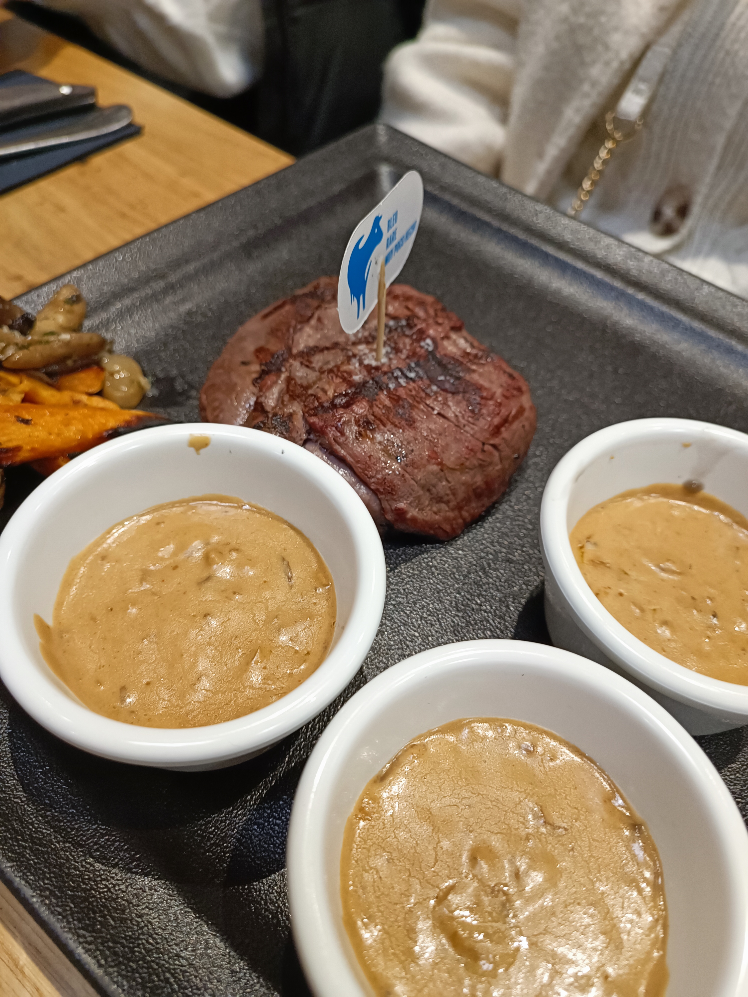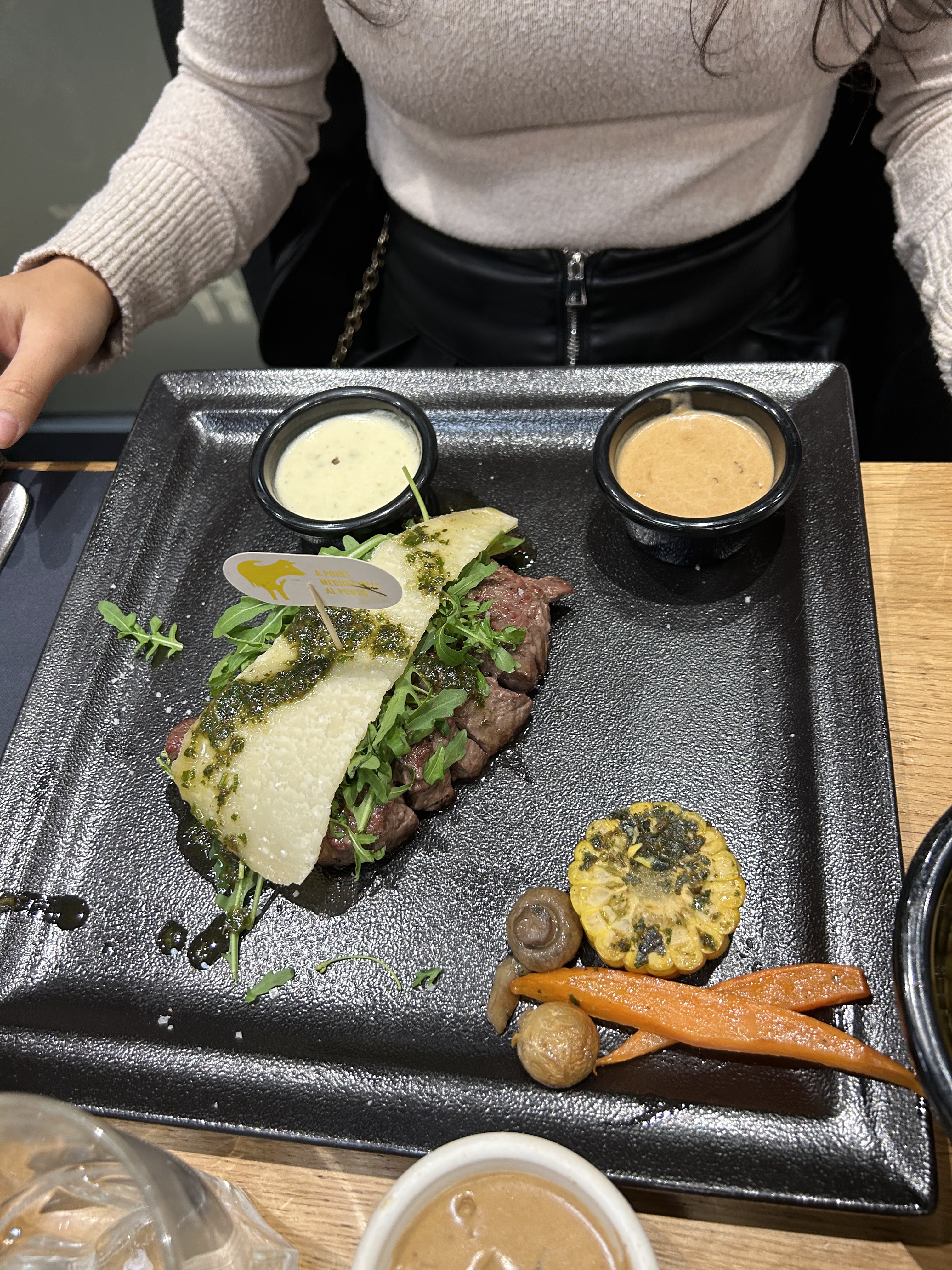 On a bien mangé, les serveuses et serveurs sont hyper réactif et souriant. Dailleurs ils ont assez vite réglé la situation dans laquelle on se trouvait, assis à coté d'un client qui sentait très très fort la transpiration (monsieur, prenez une douche et changez de vetements avant de sortir au restaurant!) Viande au top, très tendre. Seul bémol: quand on paie assez cher un repas, cà fait un peu pingre de servir un petit bol de frites pour deux sachant que partout ailleurs ce serait un chacun, ce qui est normal vu qu'on a chacun un accompagnement avec notre viande... Sinon oui je recommande et on reviendra.