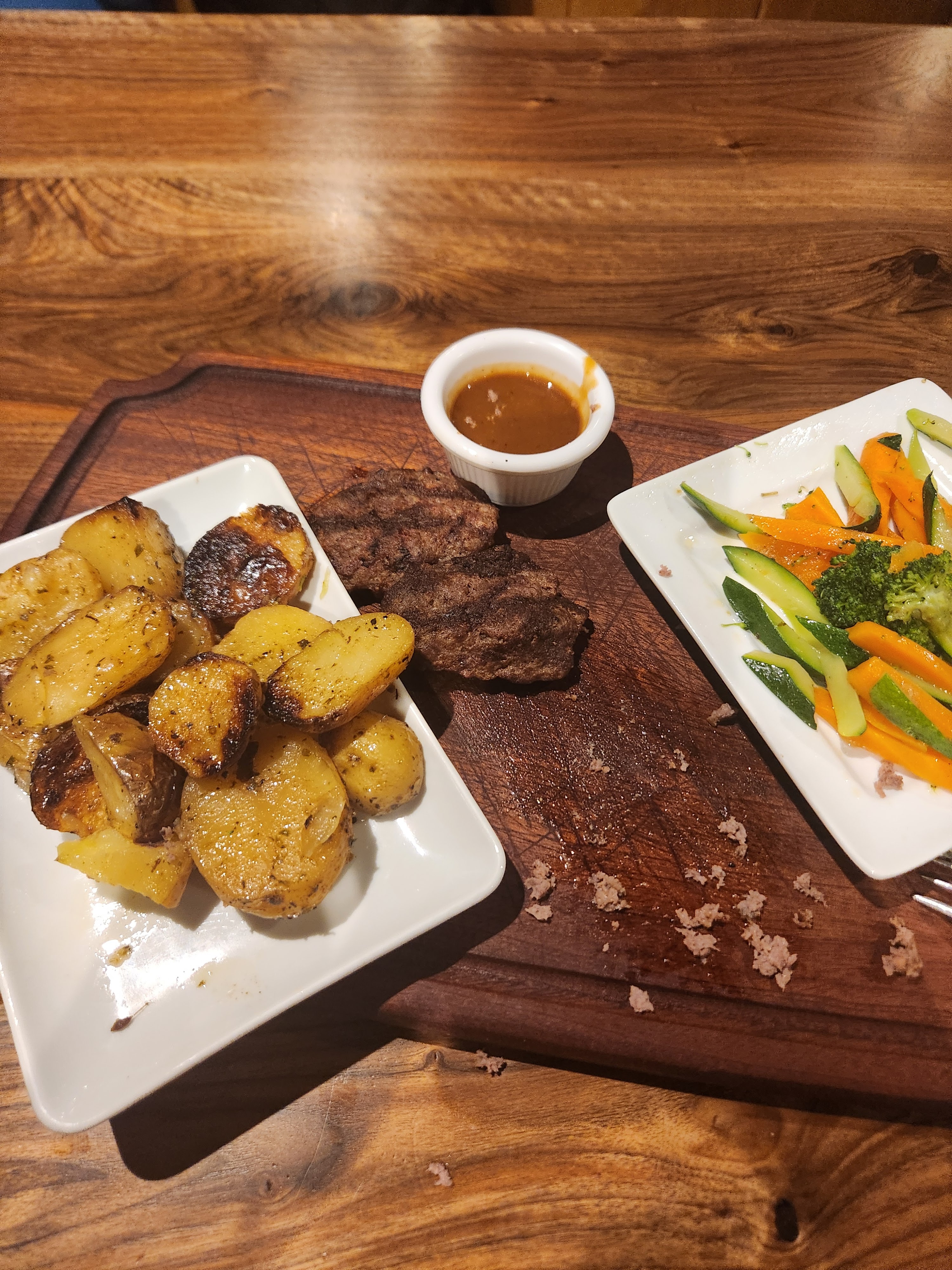 Nous étions très excités de manger un steak dans un steak house. Nous avons été ravis de voir un steak vieilli à sec dans le menu et nous l'avons commandé. Cependant, le steak n'était pas vieilli à sec. C'était très dur, ça manquait de saveur. Le service était très lent. J'ai dû me lever plusieurs fois pour demander des services publics. Pour être honnête, j'étais plus intéressé par la salle de bain. J'ai trouvé que les briques apparentes et la grotte, le tunnel menant à la salle de bain étaient très agréables.