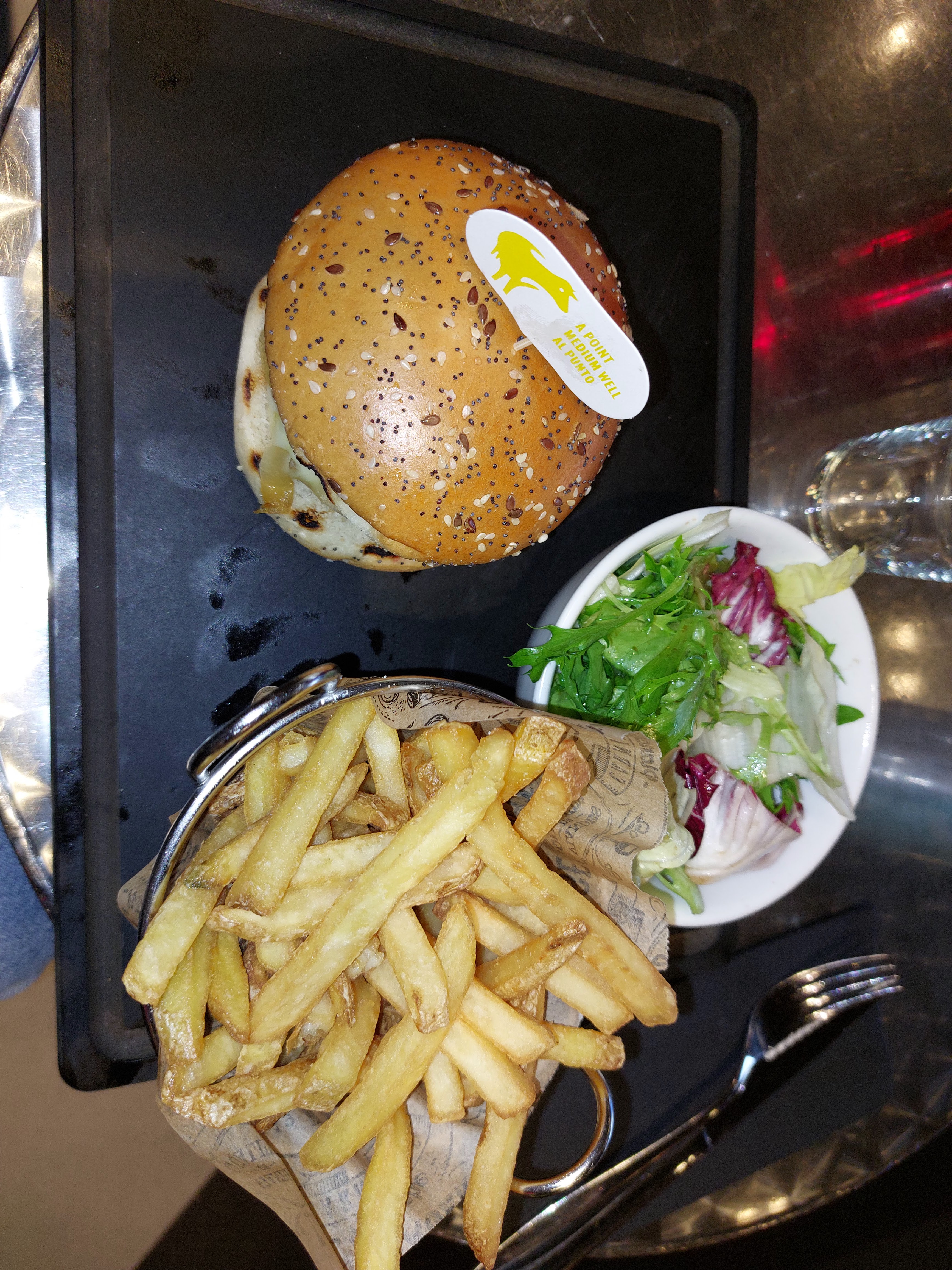 Promesses non tenues. Je réitère mon expérience d’il y a quelques mois ; en effet, j’avais tenté pour la première fois ce restaurant. J’avais quitté l’établissement au bout de 20 min d’attente sans la moindre attention du serveur. Cette fois ci le serveur est réactif, le service rapide, mais ça s’arrête là. Le Burger est commandé saignant, il arrivera bien (trop) cuit. Le pain n’est pas terrible. La salade semble dater de la veille. Les frites sont correct. Dommages car la carte donne envie et le lieu est attirant. Le tarif est toutefois trop élevé pour le service et la nourriture proposée ...Mais nous sommes à l’aéroport...