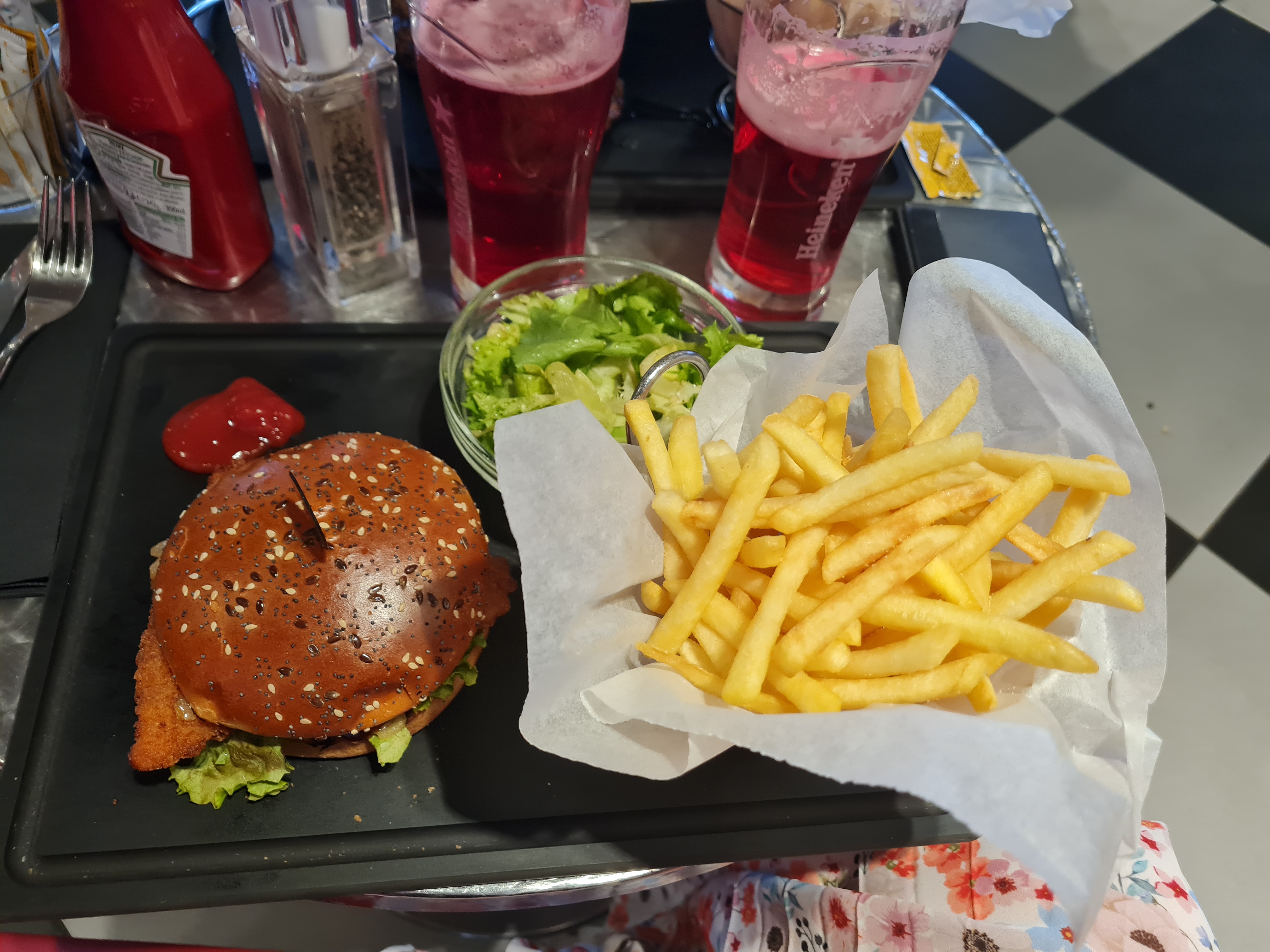J ai pris une salade à emporter ainsi qu’un burger frite et dans l ensemble c était bon. Salade avec du thon, un tartare de saumon et des crevettes bien servie pour un appétit « normal ». Par contre le burger pour lequel on peut choisir la cuisson de la viande est bon sans plus. Frites goûteuses. Dans l’ensemble je valide la partie take away =vente à emporter.