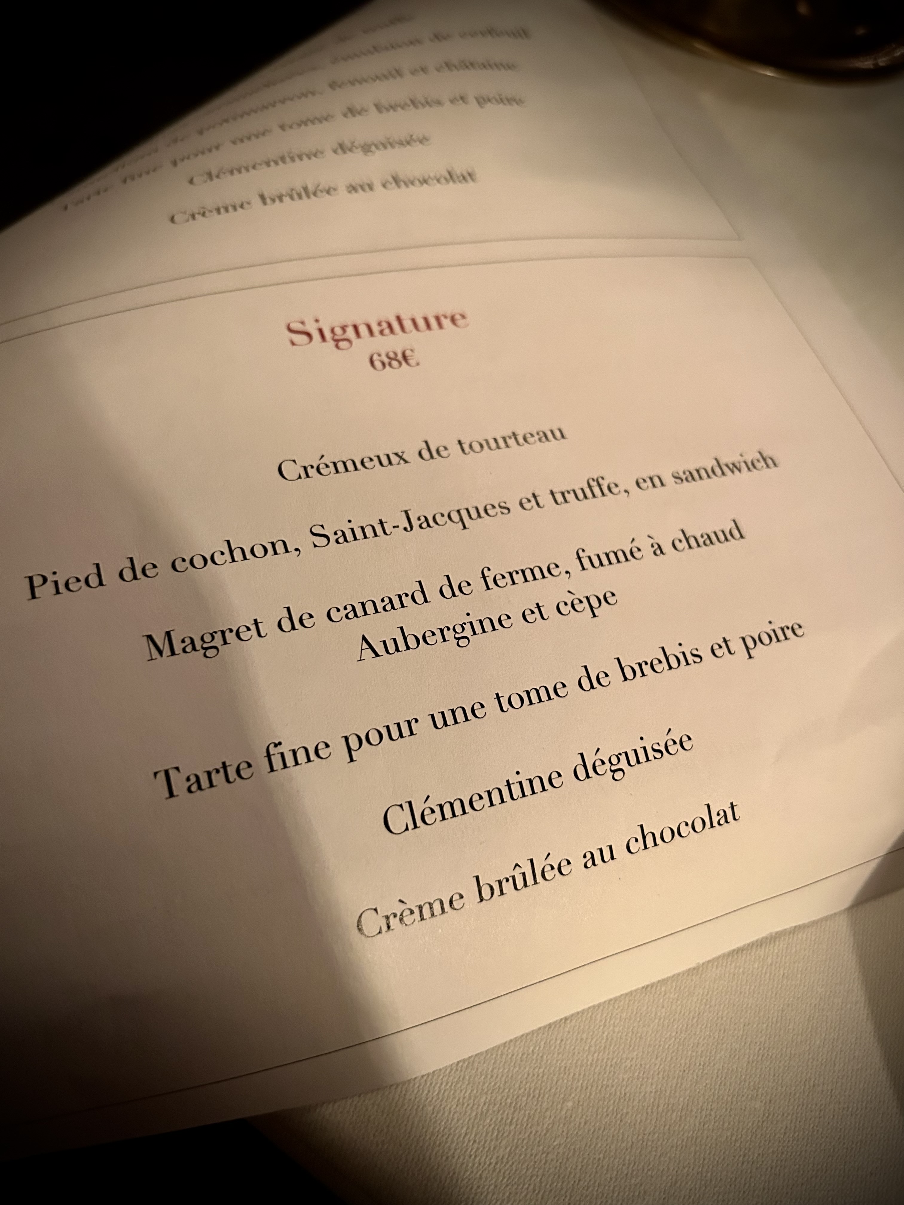 Magnifique soirée, Menu signature exceptionnel, très bon rapport qualité prix. Ce que j’ai préféré : le crémeux de tourteaux. Un peu plus mitigé sur la tarte fine à la tome pour laquelle j’espérais moins de douceur et plus de puissance fromagère . Excellente adresse, nous reviendrons.