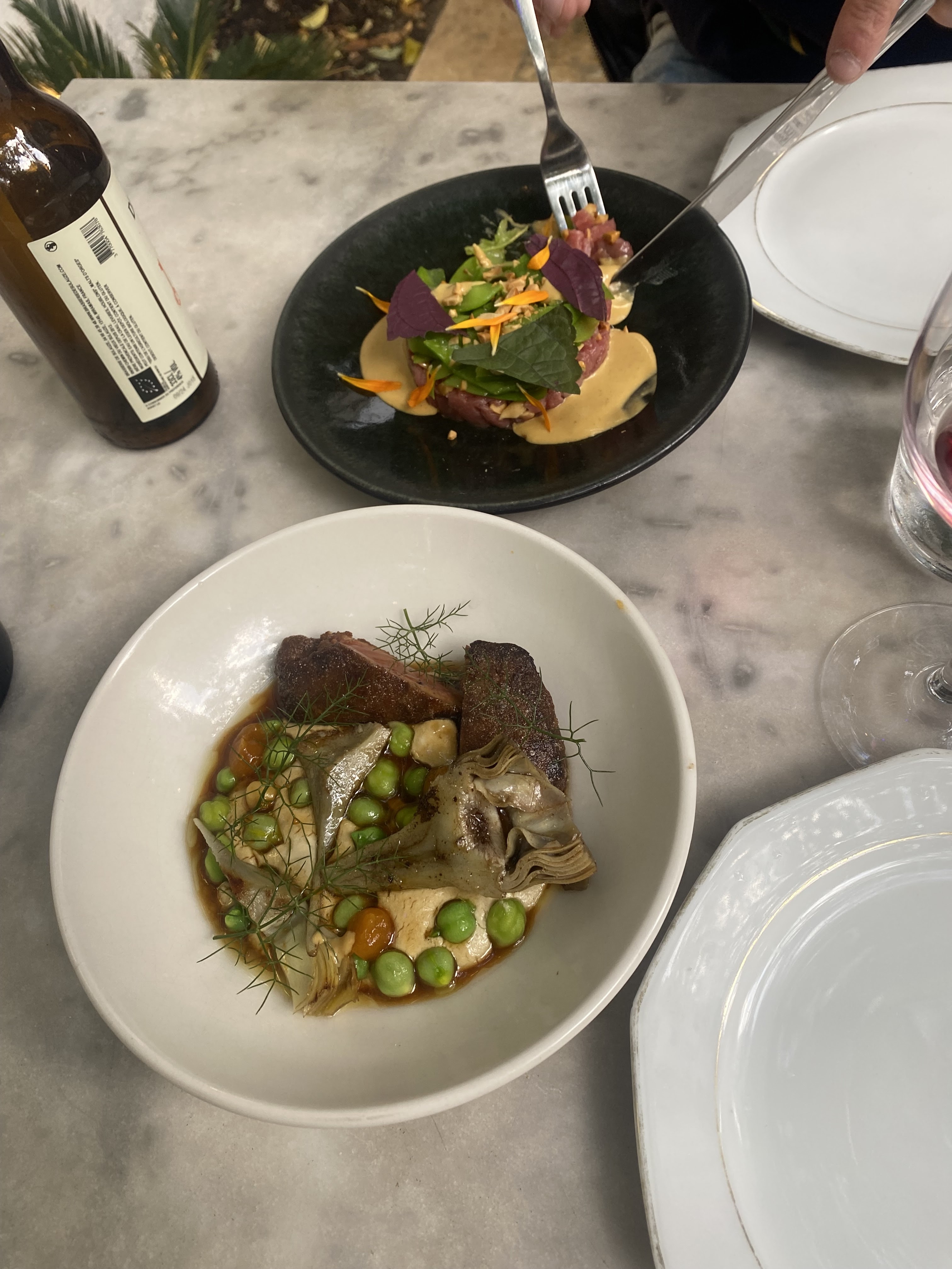 On a été un peu déçus des 4 assiettes proposées en « menu surprise ». On s’attendait à plus gourmand, plus copieux, plus généreux pour le prix élevé (58€). Deux des quatre services étaient franchement en dessous (une demi tomate avec deux petits morceaux de coeur d’artichaut en entrée, très bon mais si petit que c’en était frustrant ; deux asperges cuisinées aux agrumes en guise de plat végétarien, on reste sur notre faim encore une fois). On adore ce genre de petites assiettes végétariennes, mais pas à ce prix là !