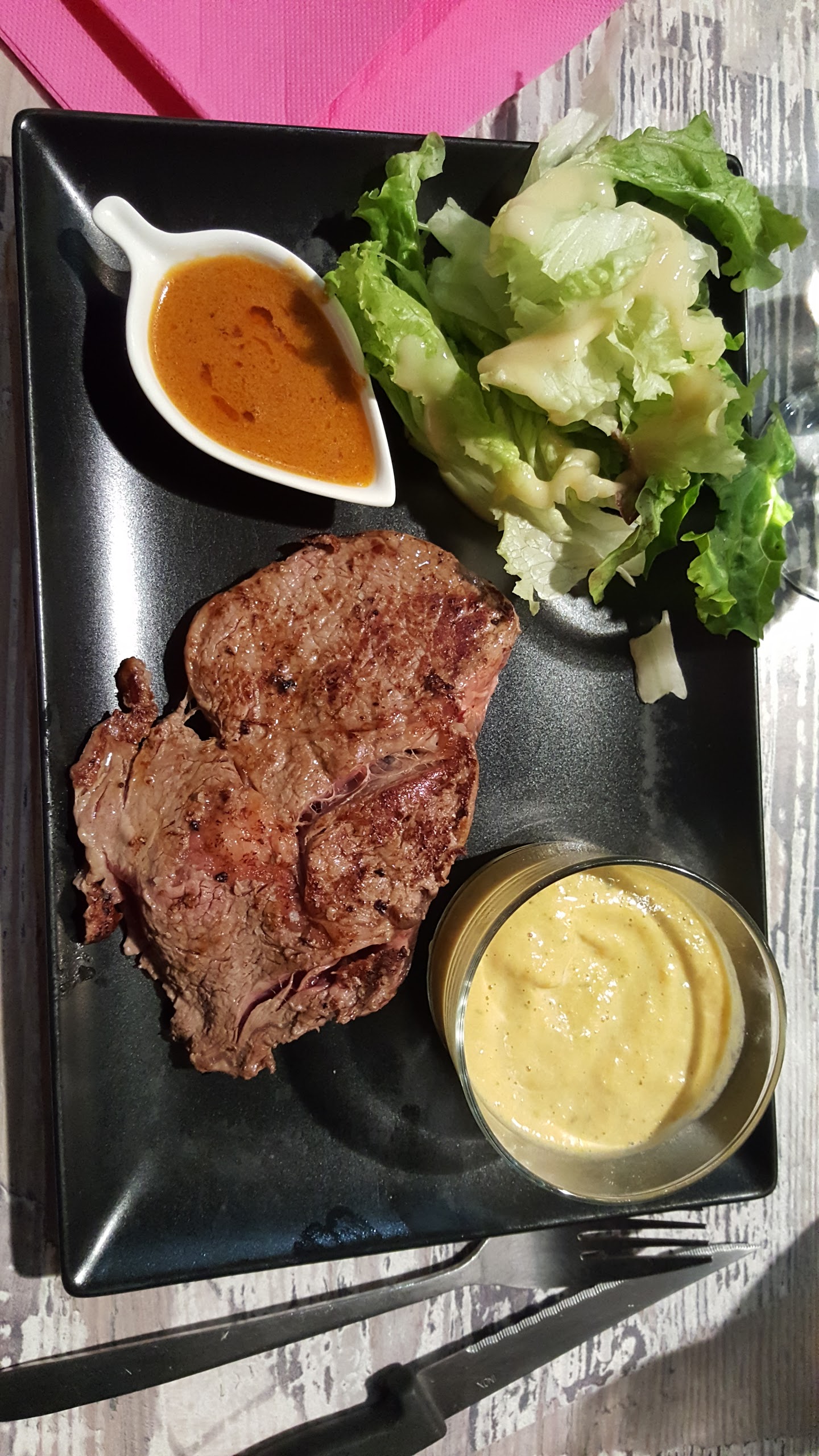 Je recommande! Acceuil parfait, serveuse dynamique et souriante, pas la peine de demander du pain ou de l eau quand il n y en a plus! Une explosion de saveur concernant l entrecote avec sa sauce au foie gras et sa purée courgette/carotte/ananas pour 15€. Petit plus chauffage exterieur