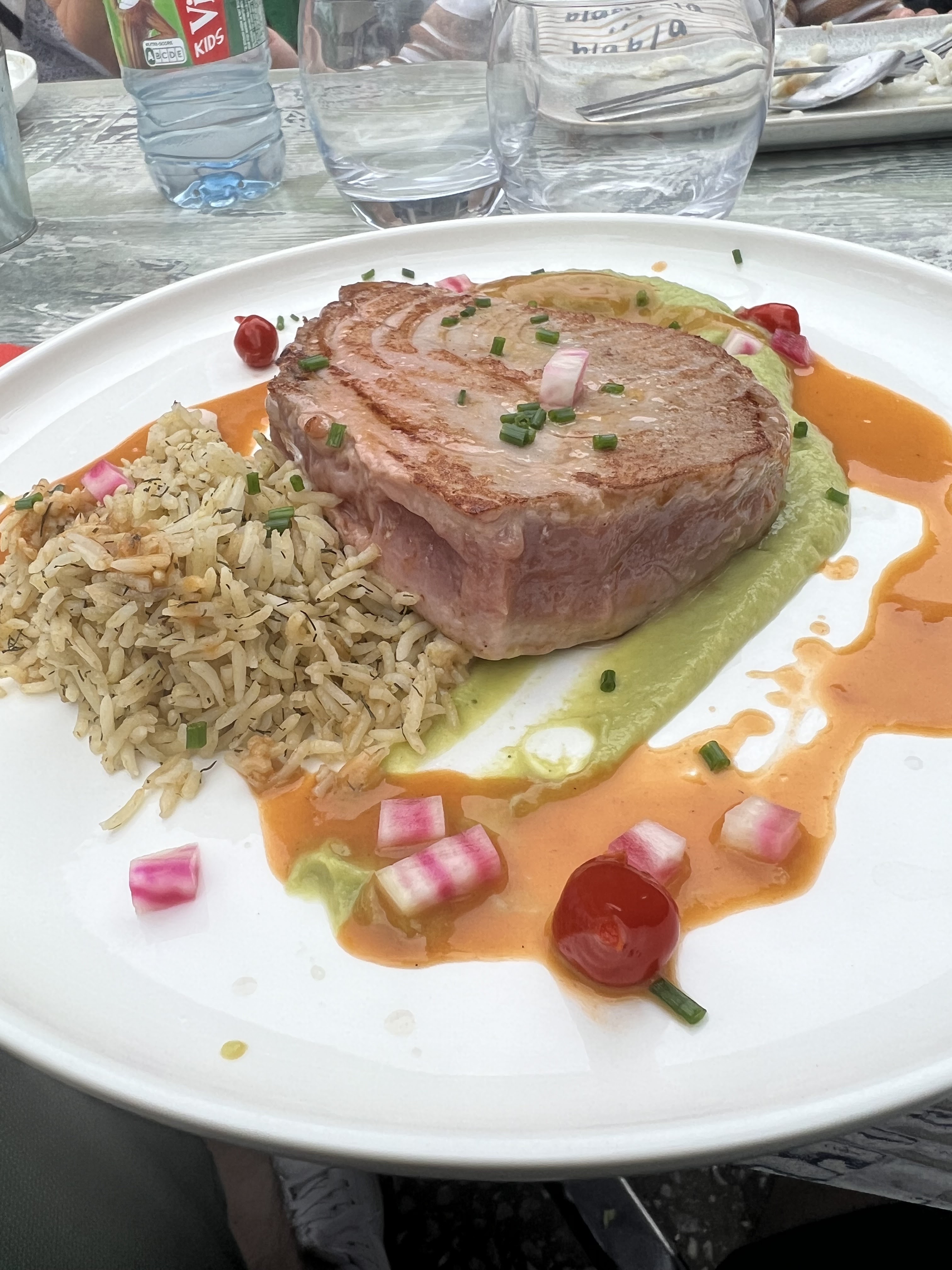 Un peu déçu par le restaurant car nous avons été surpris par des averses. Les serveuses ont été très réactives mais un patron plus intéressé à dresser des tables qu’aider ses employées. Le repas à été très rapide car la pluie a eu raison de nous. Malgré un bon plat, le thon mi cuit est très bon mais les garnitures étaient froides et le riz sec!!! Les serveuses ont gérés et sont restées pro malgré la météo...