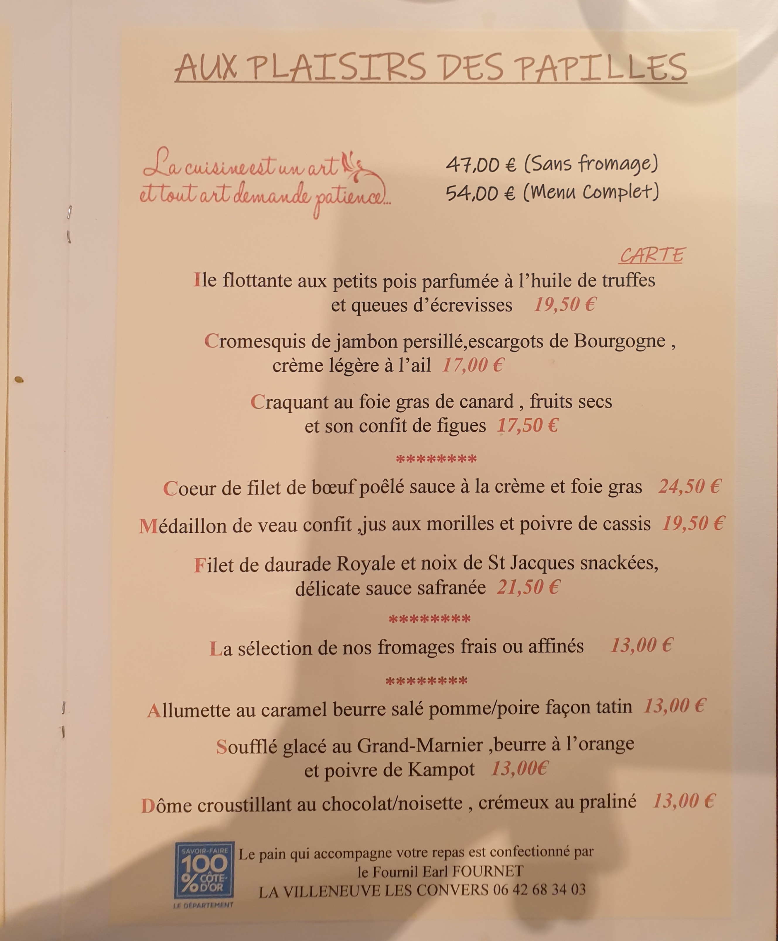 Repas très bien!! Produits frais, vins de la région et petites attentions tout au long du repas nous recommandons les yeux fermés et nous reviendrons c'est certain. Belle continuation à toute l'équipe. Laure et Jphilippe