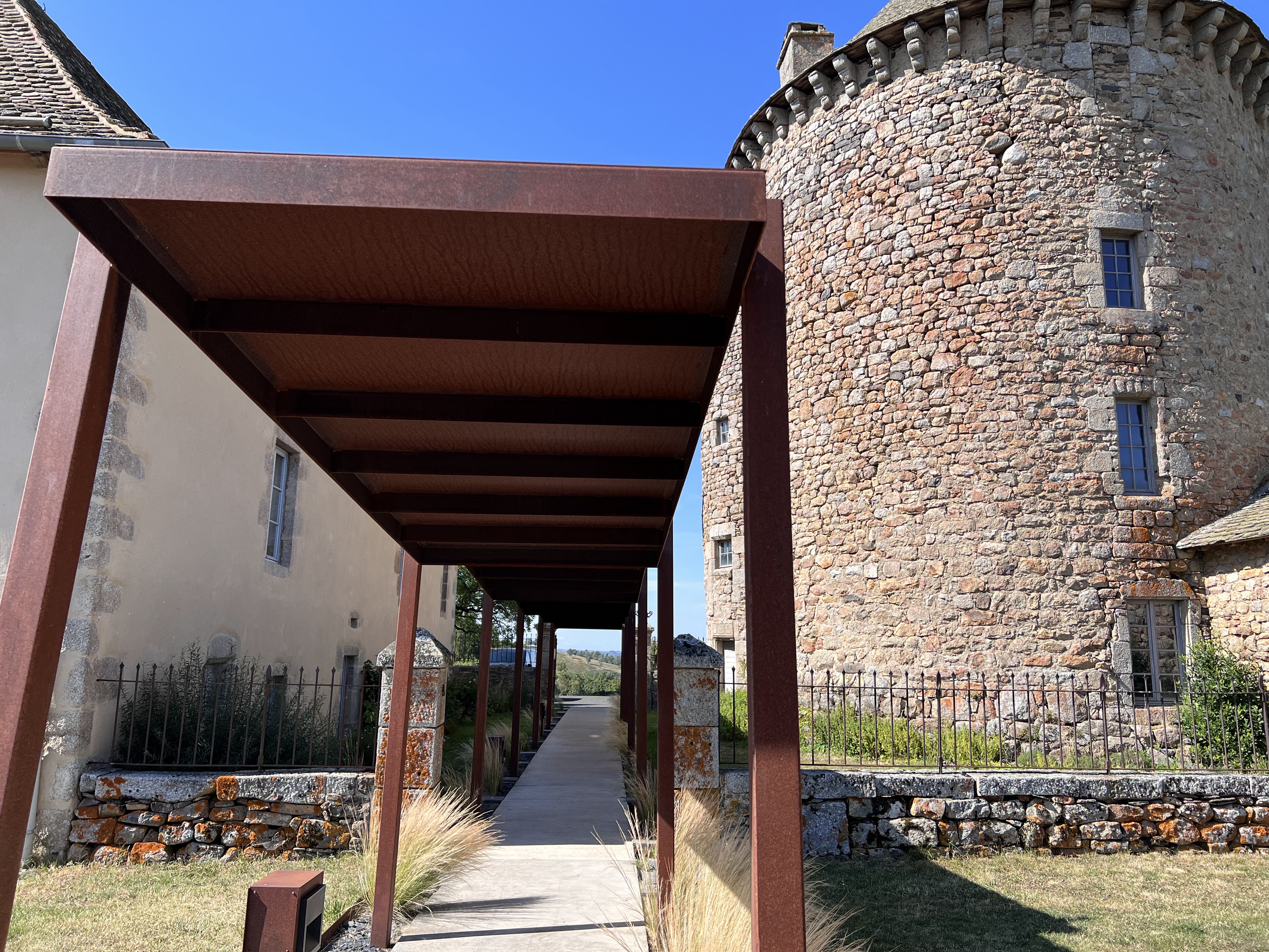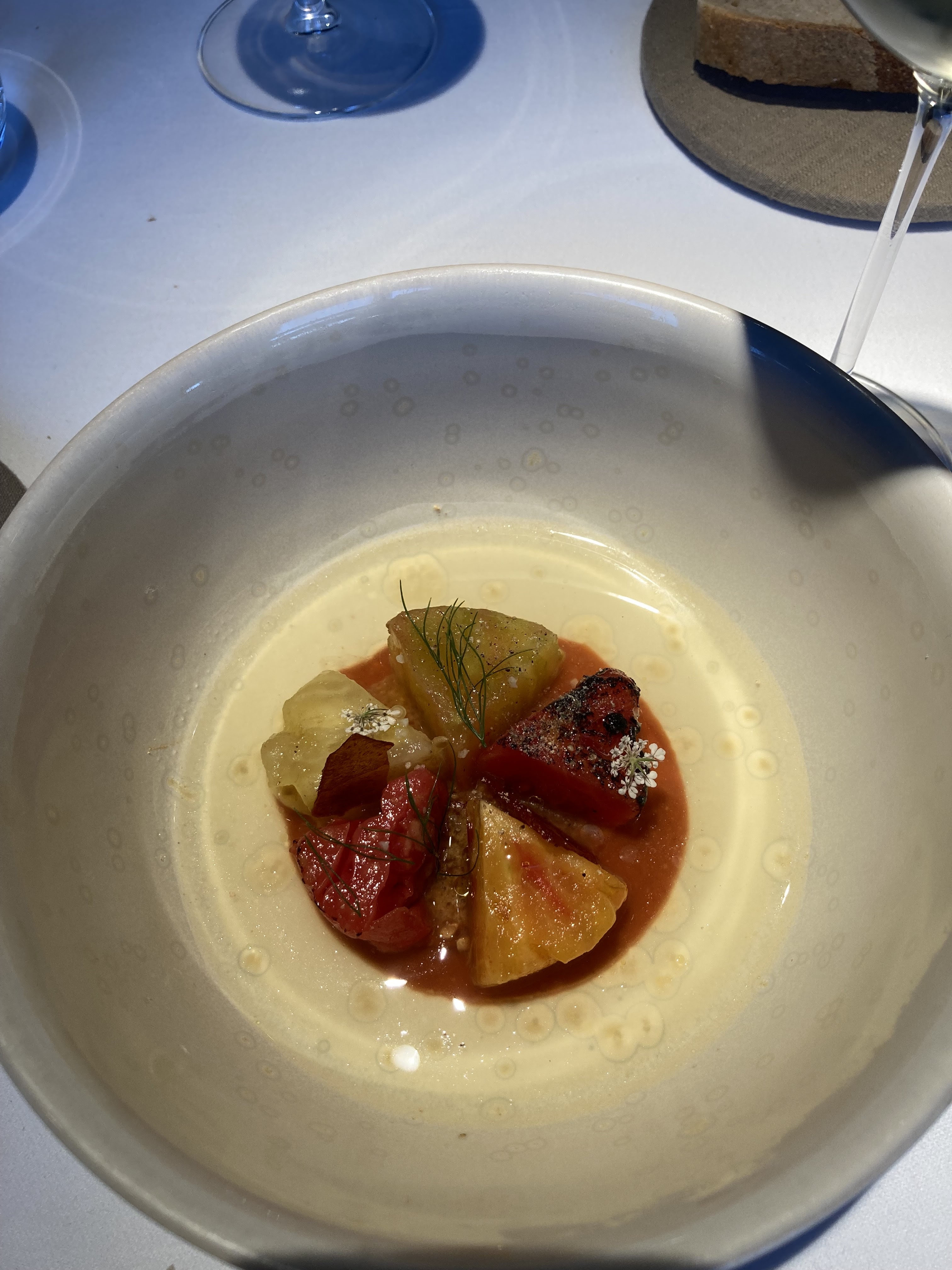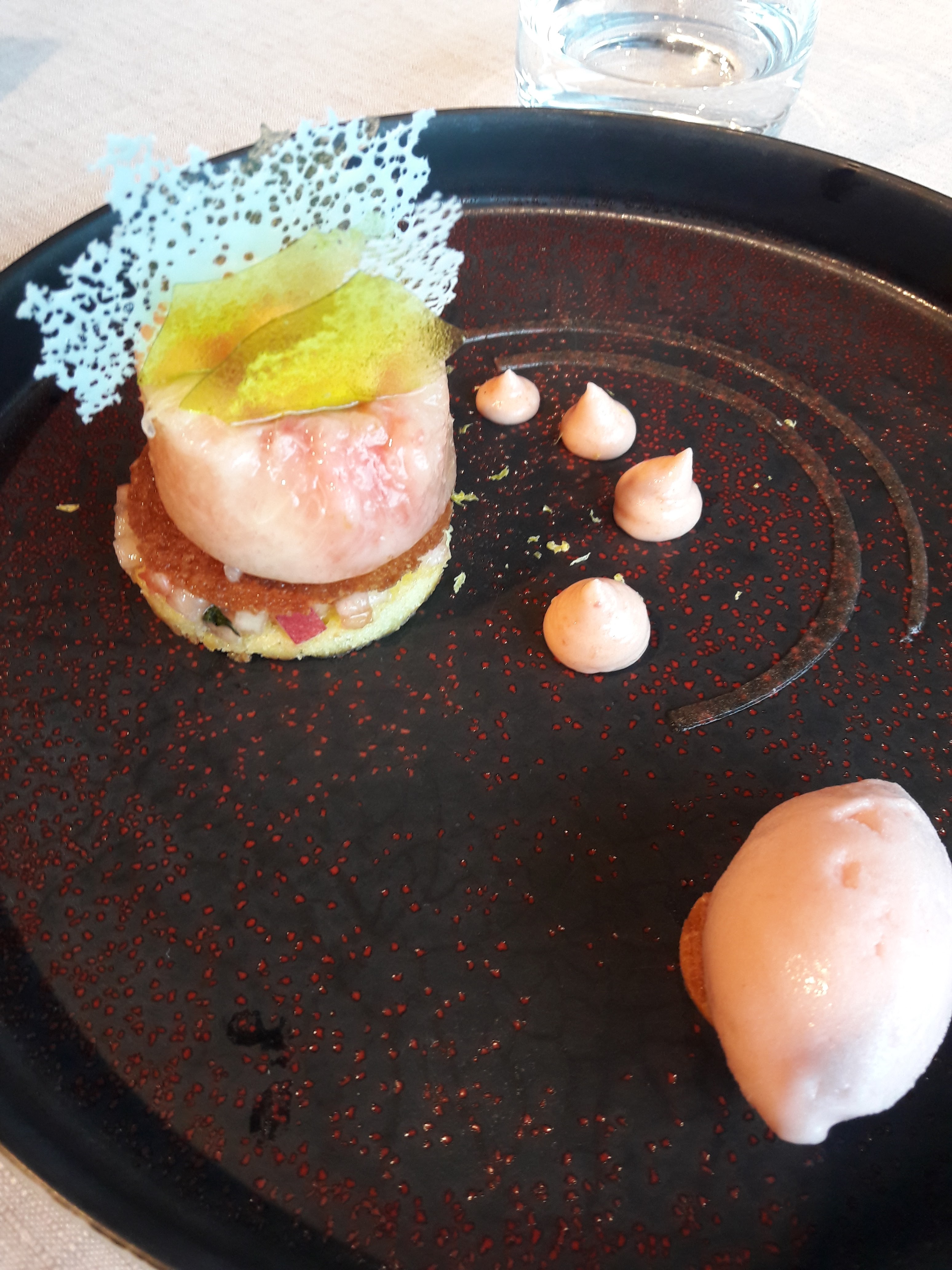Arrivés par le château médiéval du Couffour perché et surplombant le plateau d’Aubrac, on découvre le restaurant après avoir descendu un escalier en métal ajouré laissant apercevoir un paysage magnifique. Salle très lumineuse, ouverte sur un paysage en cinémascope. Rien n’est laissé au hasard, tout est designé et épuré : mobilier, couverts, vaisselle. Accueil chaleureux, Marie-Aude Vieira fait le tour des tables avec le sourire et simplicité. Service efficace et prévenant. Optons pour le menu S. 3 « crackers » pour commencer… saveurs et textures très différentes, vite suivis de 4 mises en bouche magnifiquement présentées. Et puis surprise : une entrée, ajoutée par le chef : variation autours de la tomate… Entrée : pressée d’aile de raie farcie aux câpres accompagnée d’une sauce hollandaise, très bonne… Puis pièce de bœuf-oignons-pommes de terre grenaille, classique. Chariot de fromages impressionnant, très bien décrit par la serveuse… Superbe dessert de saison : pêche, crémeux de verveine, sur pain de Gênes « graphique » suivi de 4 mignardises, régal des pupilles et des papilles. Beau moment de grâce que ce repas, parfaitement orchestré.