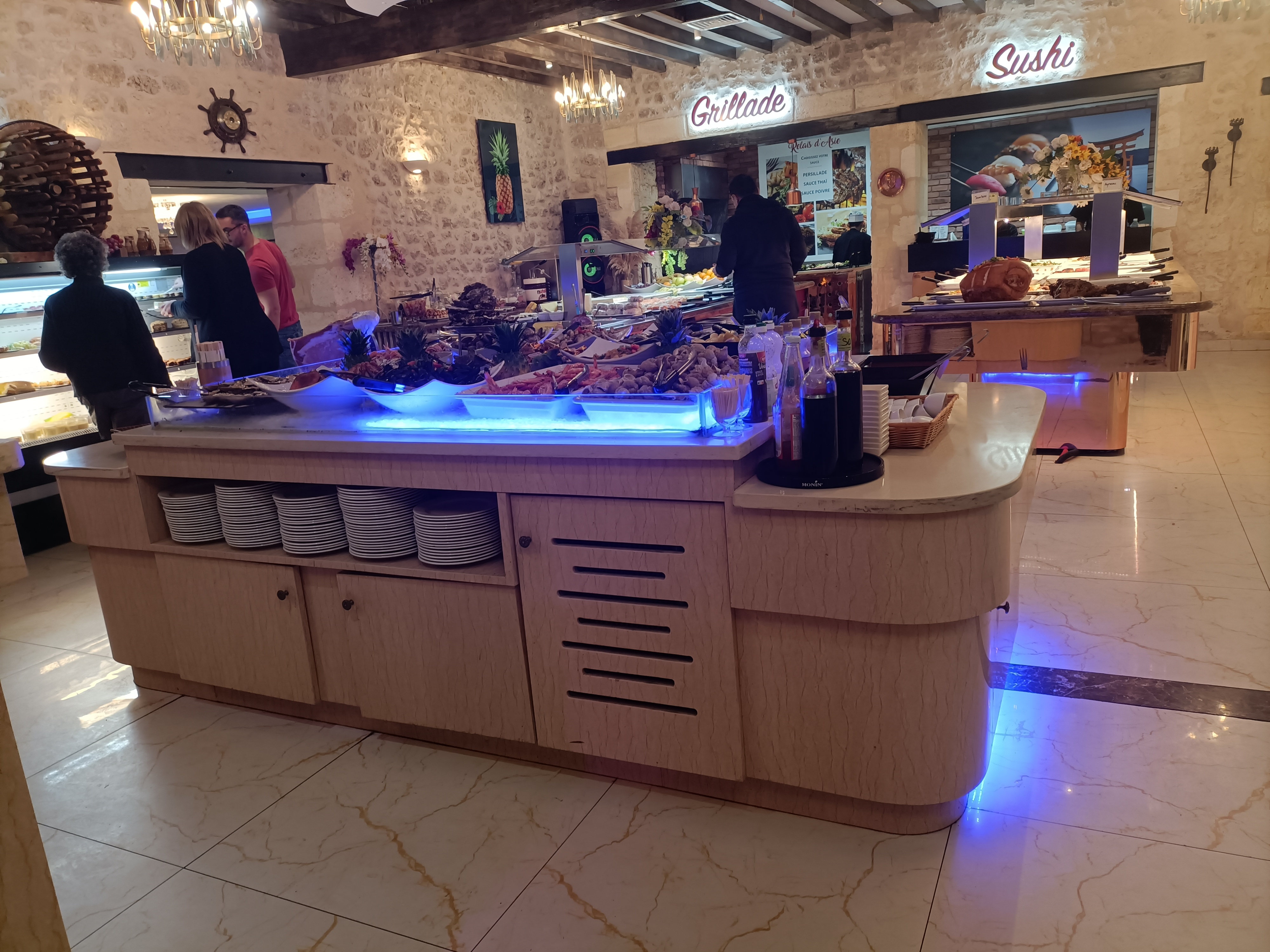 Lieu très conviviale pour un restaurant à volonté il y a un large choix de fruits de mer, de desserts, de plats chaud mais aussi de grillade, sushis. Pour ma part cela manque de bouchée vapeur.
