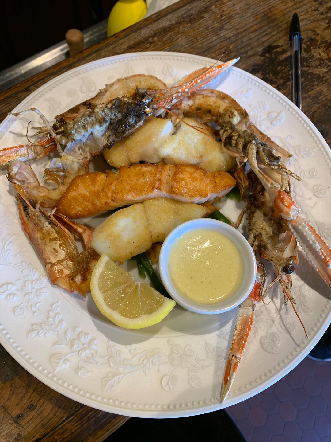 Voilà plusieurs années que nous venons régulièrement au Relais et c'est toujours une fête : accueil chaleureux, belle table et surtout une cuisine généreuse, avec uniquement des produits frais et de saison. Je me suis régalée avec l'assiette de poisson et crustacés grillés : gambas, langoustines, barbue, saumon et beurre blanc citronné. Cette composition peut varier en fonction des arrivages, et notre hôtesse est allée se renseigner en cuisine avant que je passe commande. Nous sommes loin des chaînes de restaurant standardisés...