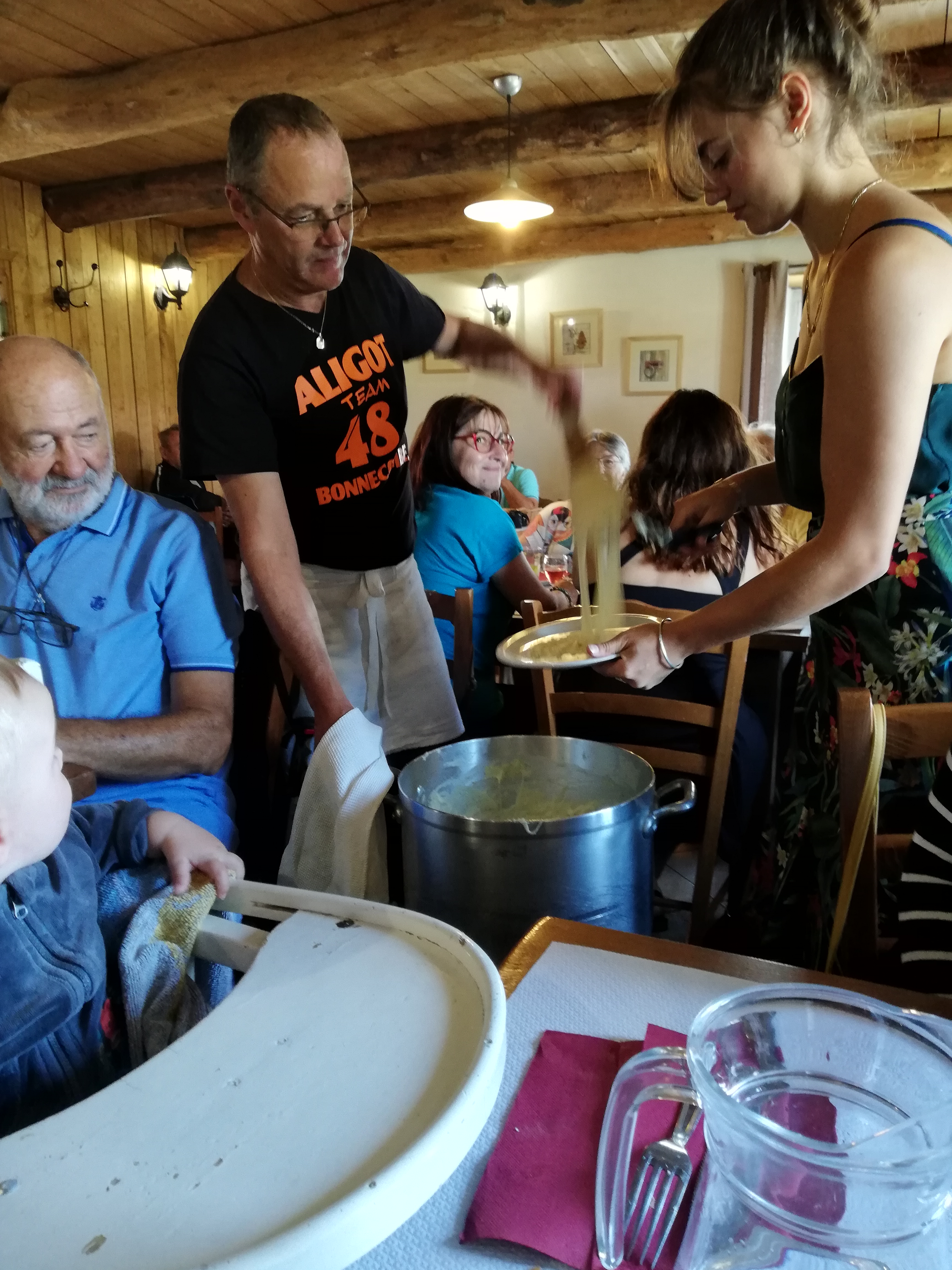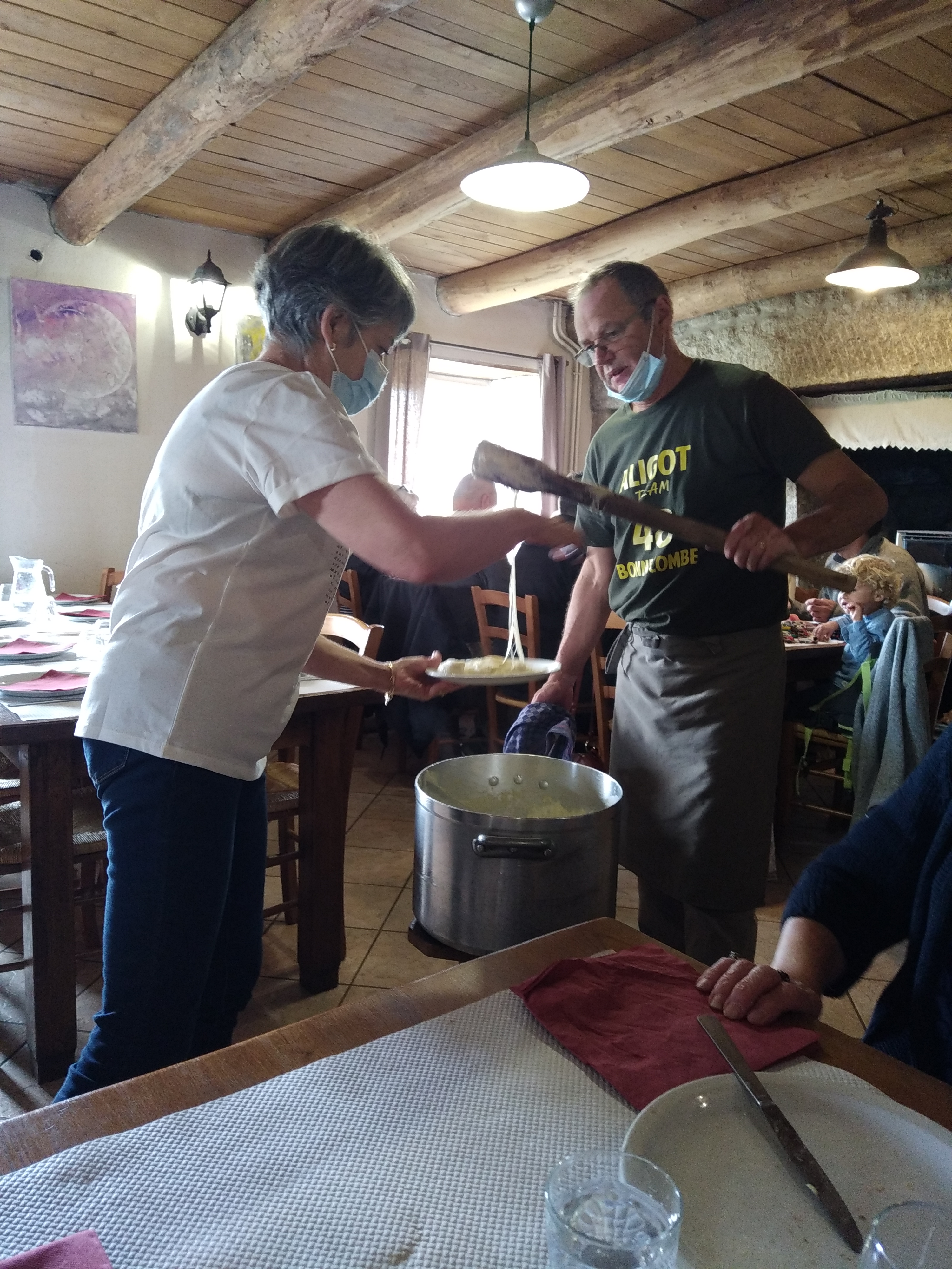 Aligot et charcuterie délicieux. Personnel aux petits soins. Paysage du plateau d’Aubrzc. Que rêvez de mieux?
