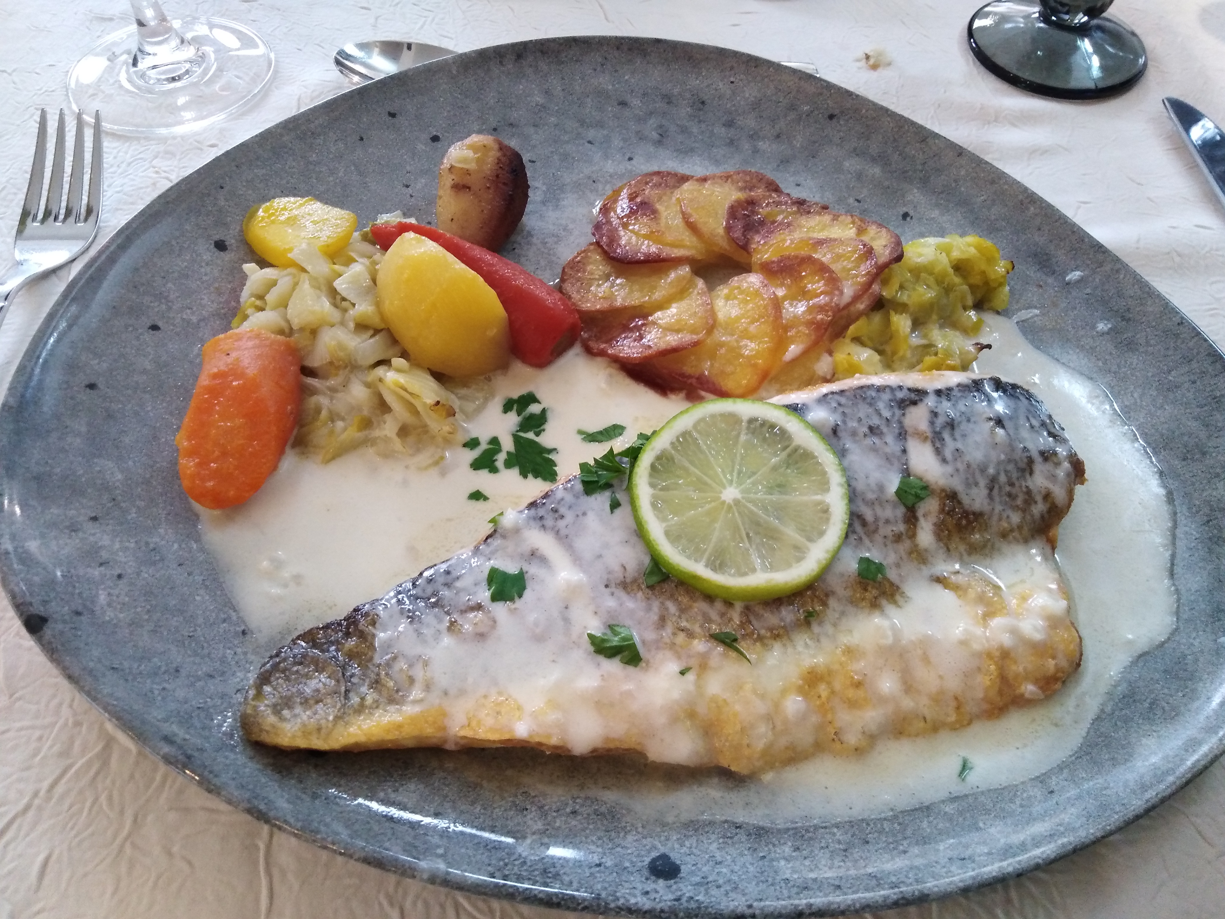 Déjeuner dans ce restaurant en se promenant..belle expérience. Service sympathique et carte variée et plaisante..Filet de bar pour moi,avec assortiment de légumes de saison et sauce aux pomelos..très bon,et pavé de bœuf sauce béarnaise et frites pour mon mari,tarte aux fraises avec super bonne pâte sablée, vacherin...très belle expérience. Je conseille +++