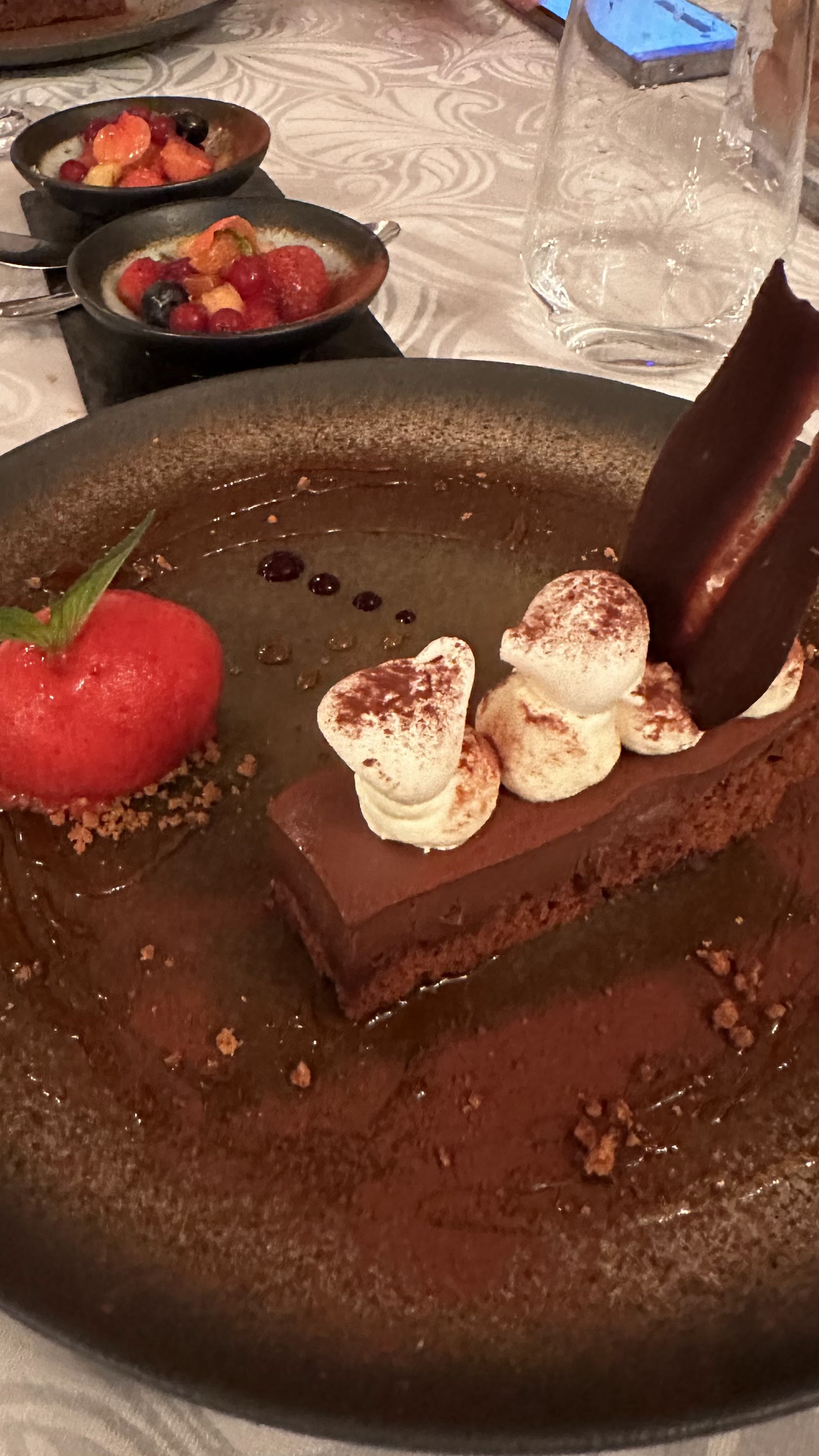 Le poisson toujours aussi bon bien cuit bien relevé pour moi un régal Le croustillant d’agneau cuisson 7h était bon très goûteux très relevé Le dessert le moment que j’aime moins dans ce restaurant le chocolat est trop fort et le sablé breton était un peu mou … la petite salade de fruits de saison au citron vert et huile d’olive était bonne Bien sûr restaurant à conseiller