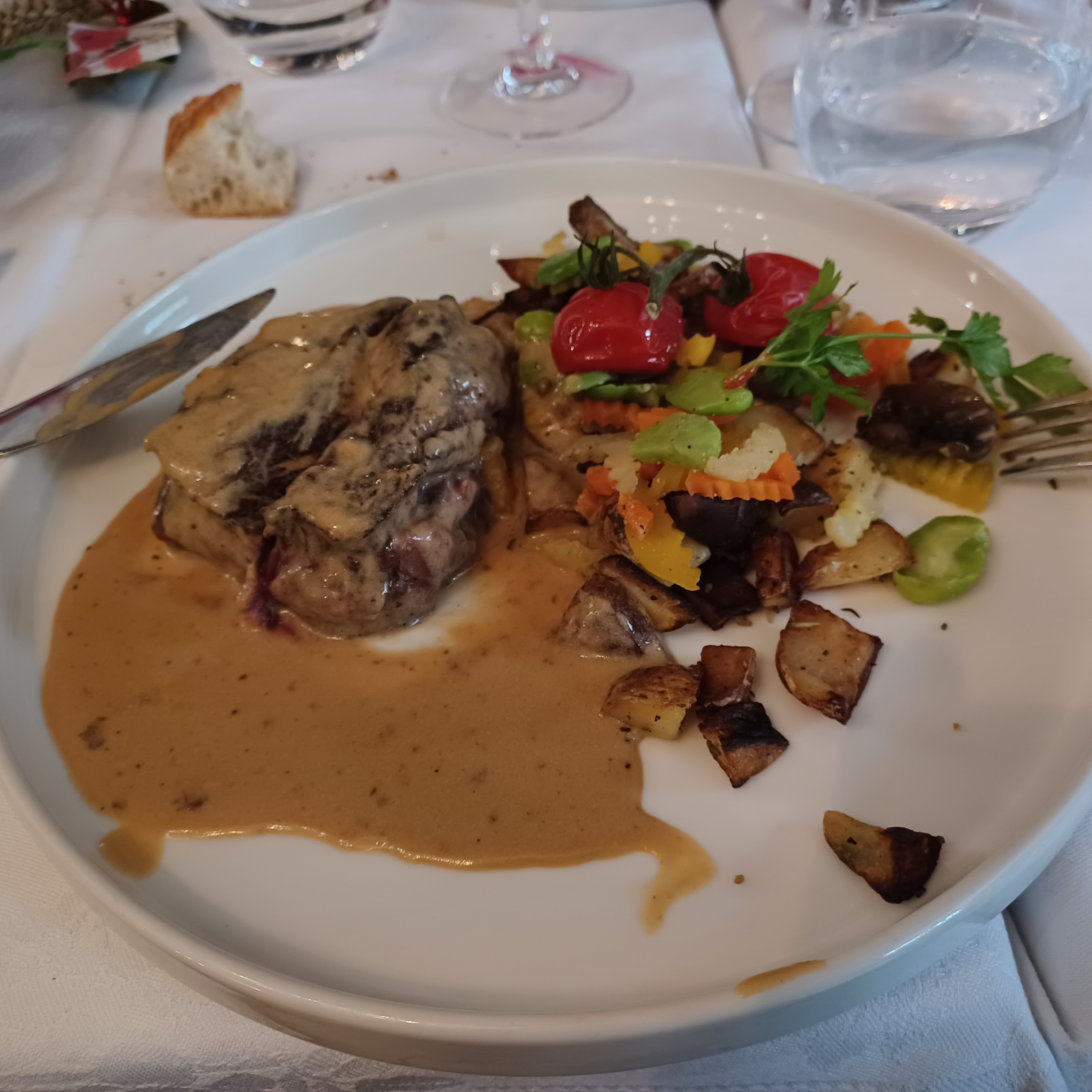 Un restaurant haut de gamme dans une petite ville. Ce restaurant n'oublie pas qu'il y a des végétariens. Très bonnes coupes de viande
