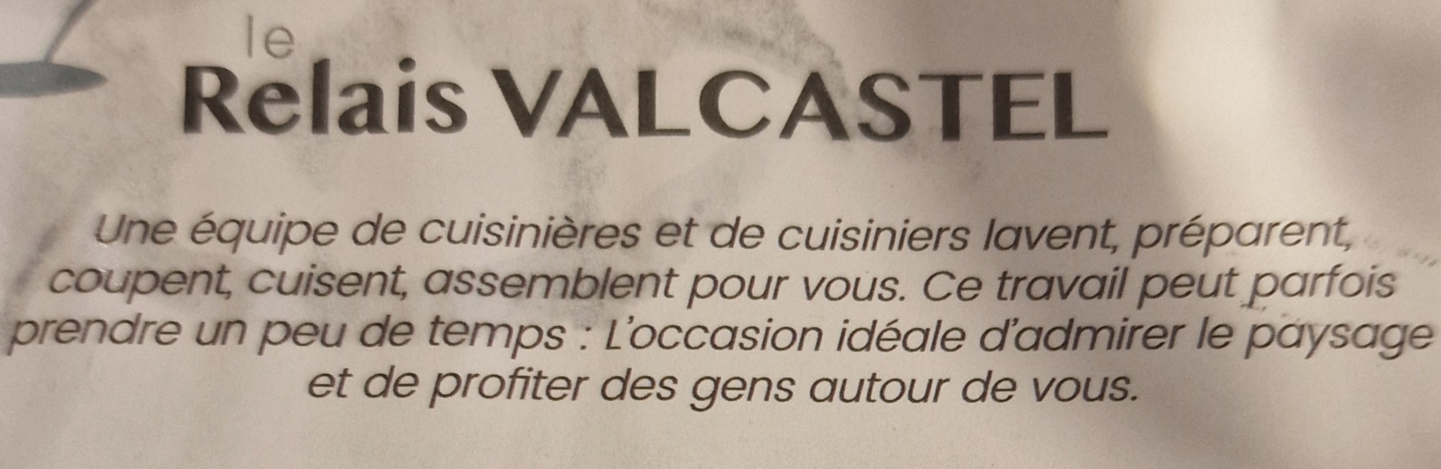 Dommage qu'on ne peut pas mettre 0 étoile ! Avant d'aller visiter le magnifique Château de Val on s'est dit qu'on allait manger sur place au restaurant proche du château : le Relais Valcastel, seul endroit de restauration sur place... Très mal accueilli par la supposée patronne, elle nous indique une table à l'intérieur, proche du bar (mais vraiment proche on était sur le côté et on voyait tout ce qu'ils faisaient) on demande alors au jeune homme qui nous place s'il ne peut pas plutôt nous placer a l'extérieur (il y a des tables vides) ou sur une des tables vides au milieu du restaurant pas à côté de la cuisine... il demande à la patronne qui revient furax non y a pas de tables ailleurs tout est pris je l'ai déjà dit. C'est réservé (les tables sont restées vides et réservées tout notre repas mdr) Au bout de 10 min la serveuse vient nous donner le menu sans nous regarder et en râlant elle aussi oui ben j'allais leur donner mais j'ai du faire autre chose y a du monde je cours partout Mon mari doit se lever pour voir ce qu'est le plat du jour car personne ne nous explique rien Au bout d' 1/4 quelqu'un vient prendre la commande... pas compliqué : 2 plats du jour et 1 menu enfant (steak frites) Au bout de 3/4h toujours rien... mais pendant ces 3/4h on assiste au comportement de la patronne et de son assistante qui sont ignobles et refusent même des gens alors que le restaurant est plein de tables vides soit disant réservées. Au bout de 3/4h, excédés, on interpelle un serveur. La patronne arrive aussitôt vous avez commandé ?... ben oui bien sûr mais ca fait longtemps... et ben si vous avez commandé ca va arriver faut attendre c'est tout sur un ton énervé... Mon mari lui répond ca fait 45 minutes quand même qu'on attend, mais elle fini sa phrase en tournant les talons !!! Le couple a cote de nous est aussi atteré lol Au bout d'une heure on nous sert notre ballotine de poulet avec du riz, et mon fils son poulet frites... la patronne arrive, et je vous jure que c'est vrai, elle nous dit avec un grand sourire mais toujours sur un de ces tons ! : Alors ca y est ca va vous êtes nourri ! Puis repart !!!!! Non mais je rêve quoi !!!!! Jamais je n'ai vu ca, mais le pire vient à venir : elle revient vers nous et nous dit toujours en souriant Vous savez c'est ca la cuisine, des fois ça sort, et des fois ça sort pas. Ben aujourd'hui ça sort pas voilà Aucune excuse, rien, elle repart comme si tout allait bien... Philippe Etchebest au secouuuuuurs ! Lol On a failli partir et ne pas payer ! Et en discutant avec les gens aux bords du château on s'est rendu compte qu'elle avait eu le même comportement a ce tout le monde ! Donc je vous confirme : n'aller pas manger au Relais Valcastel !!!! Prenez un pique nique et mangez sur la plage !!!