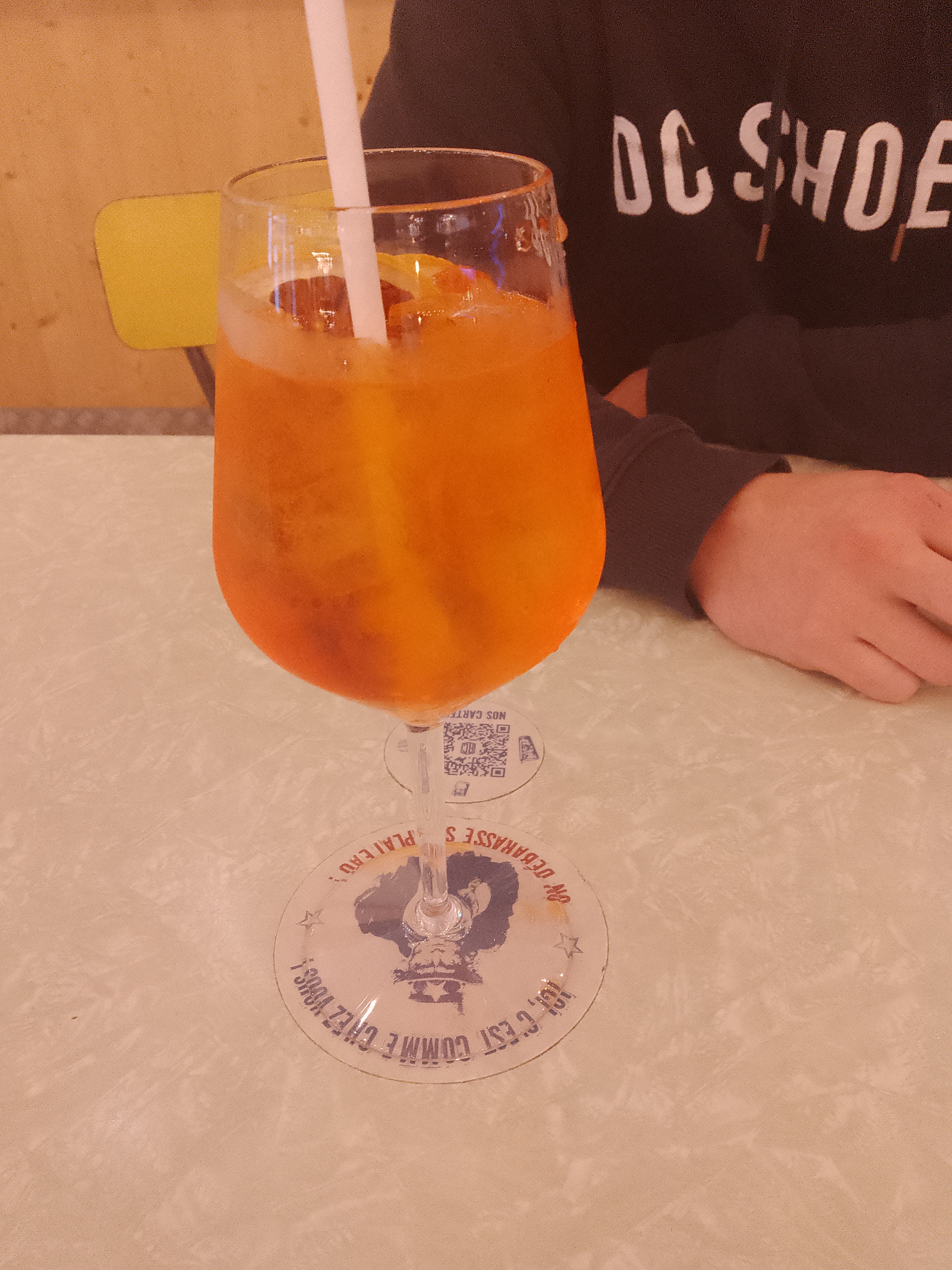 Venue pendant l'happy hour. Je demande un soft, donc 50% du prix. Il m'a été facturé plein pot et le gentil monsieur m'a assurée que c'était bien 50%. Votre carte indique 3,20€ un Schweppes, donc quand on me facture 3,20€, bah c'est pas 50%. Je ne vous remercie donc pas.
