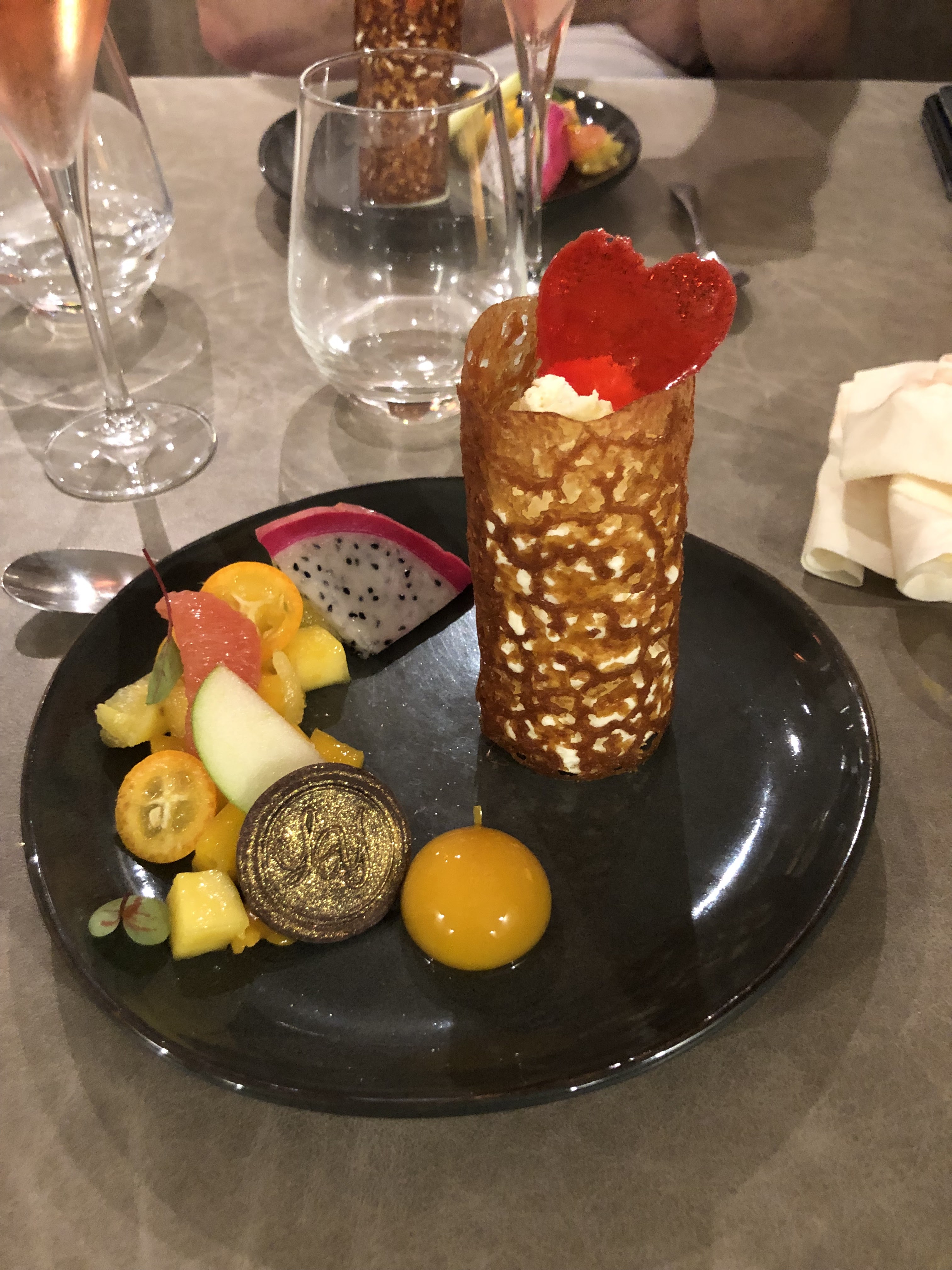 Une expérience culinaire pour la St Valentin, beaucoup de travail de la part du chef . De la mise en bouche au dessert tout était un régal : gustatif, visuel , produits frais et de qualités ,un sans faute avec tous ces mets raffinés .Le dessert avait beaucoup de prestance et d élégance, tout en dentelle… Personnel attentionné, accueil de qualité et service orchestré,impeccable.Merci