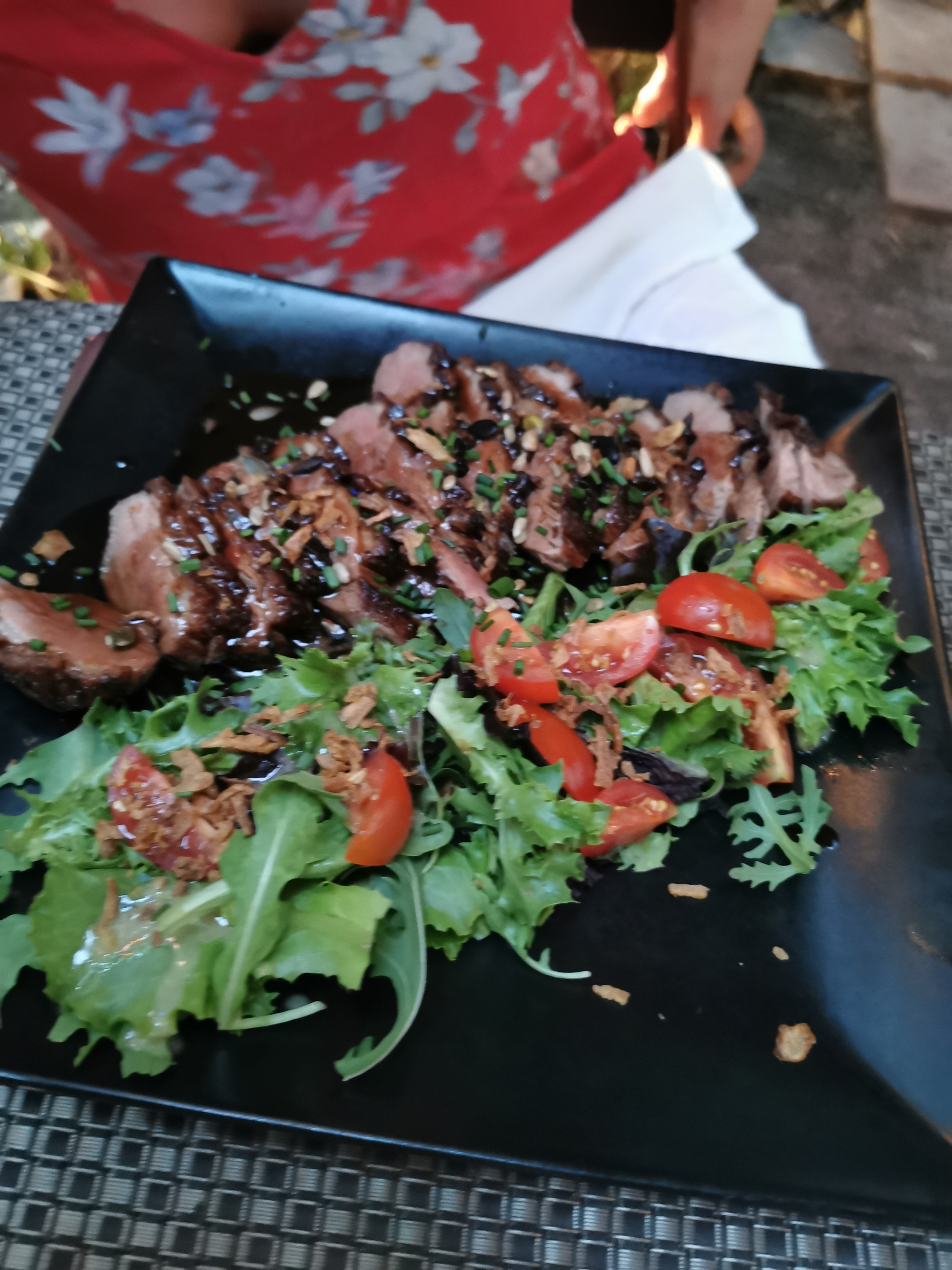 Super restaurant avec un petit jardin. J’ai juste pris une entrée. Le foie gras maison. C’était très bon. Avec confit d’oignons. Morceaux de mangue et kiwi. Patron très sympa. Cuisine maison. Je recommande. !!