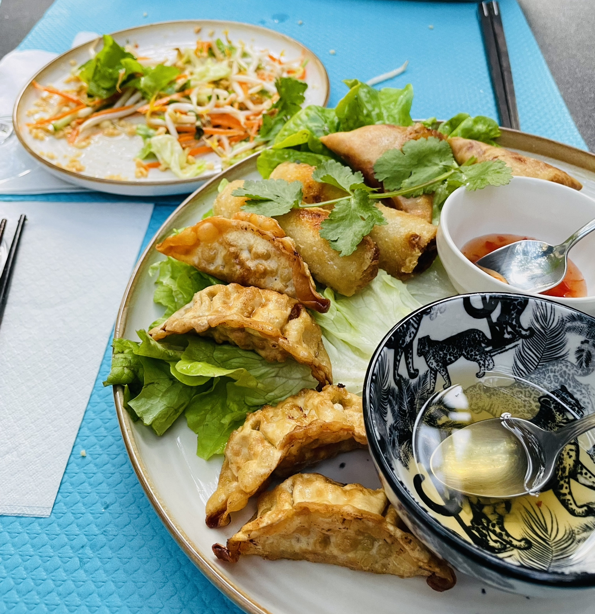 Menu entrée + plat à 15€50, raisonnable car les quantités sont généreuses. Par contre je n’ai pas trouvé la nourriture incroyable.. j’adore le pad thai donc j’ai pris celui au crevette comme je prend habituellement. Je ne sais pas si c’est car d’habitude je les prend dans des chaînes ou pas, mais je l’ai trouvé avec un gout un peu spécifique comme de graisse animal ou je ne sais pas.. pas tres agréable en tout cas :/ Les crevettes n’étaient pas revenues et donc ca manquait de saveur surtout que ca avait tout l’air de crevettes surgelées. Il n’y avait pas beaucoup de légumes c’est dommage et les pates étaient collantes, j’ai du rajouter de la sauce de mes gyozas.. par contre il y a pas mal de cacahuètes et ca c’est top ! Les gyozas végé étaient bons, bien croustillants et moelleux à l’intérieur. En ce qui concerne l’accueil, la dame est un peu pressante et directive mais reste tres gentille.