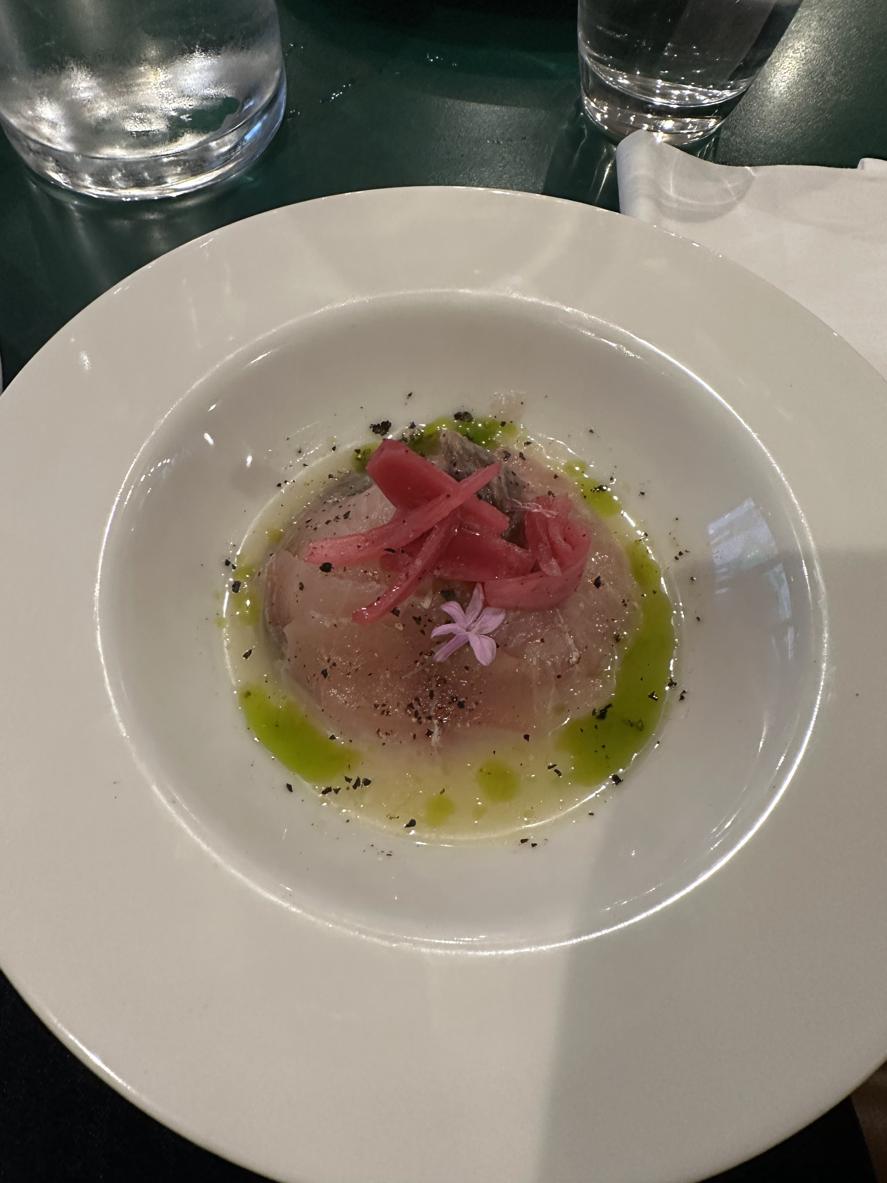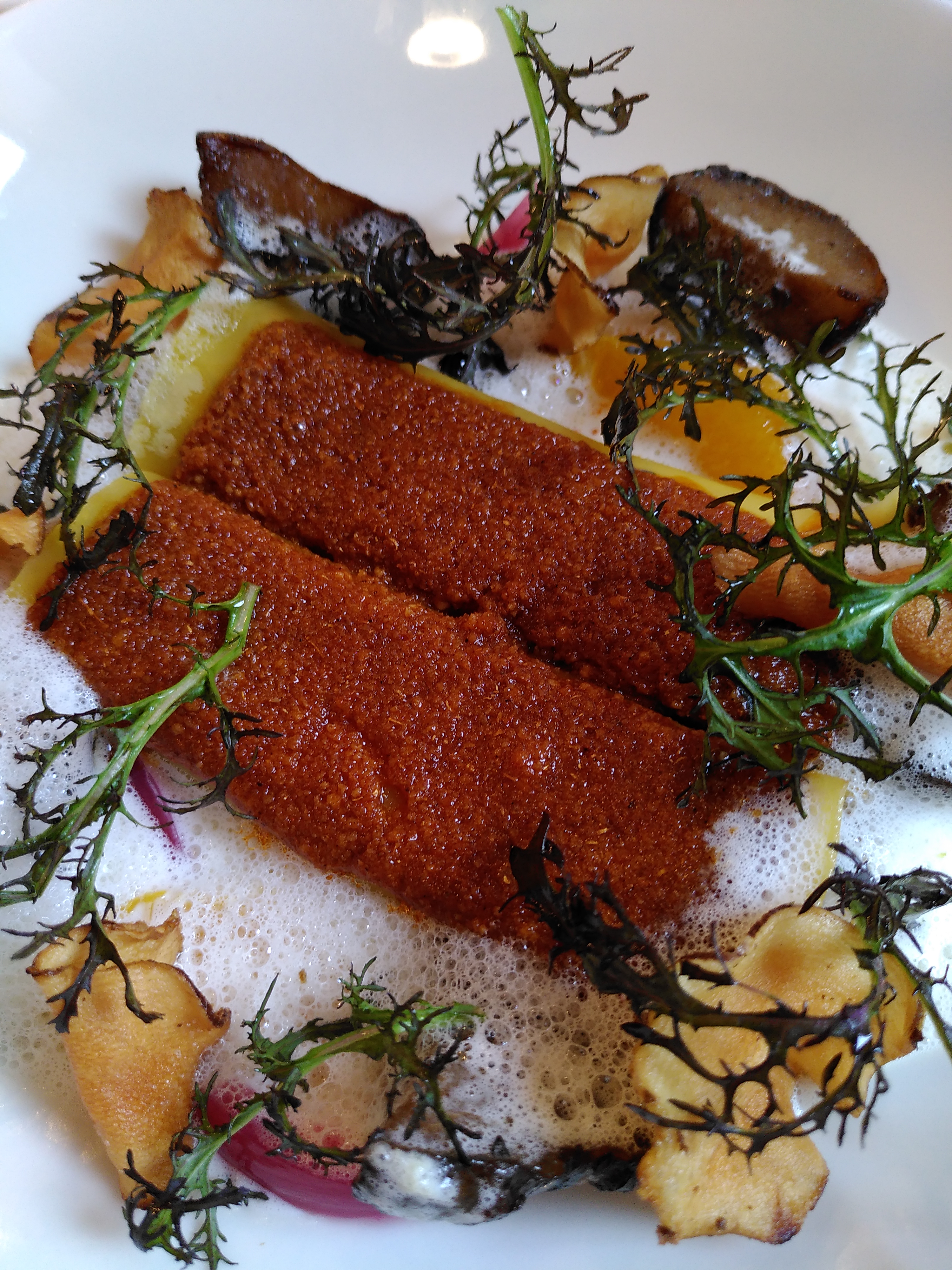 Plat ultra moderne et appétissant mais ultra décevant en bouche peu d'assaisonnement très fade et surtout très surchargé. Trop de chichi pour un résultat moyen. Vous verrez le visuel ci-dessous. Concernant le service en salle pour ma part très moyen. Un autre défaut c'est qu'il n'y a pas de sas d'entrée, le froit rentre et me tire directement dans la nuque, maigres que nous étions à plus de 2 metre de l'entrée.