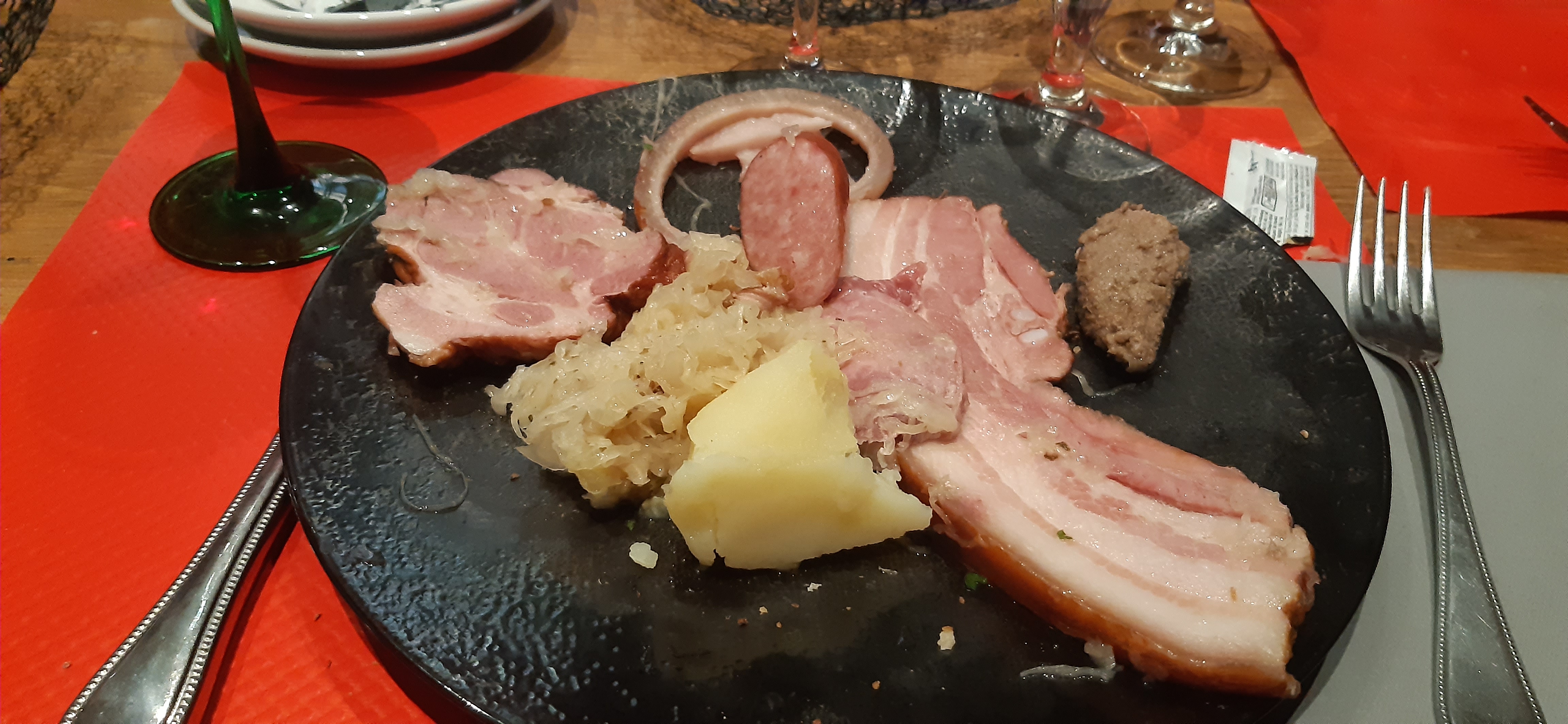 Restaurant uniquement. Pour un repas de Noël. C'était....comment dire...une choucroute garnie...je cherche encore le chou quant au garni...Ben je ne sais toujours pas si il faisait référence à quelque chose dans l'assiette. Le service plus que moyen...on a senti que c'était la fin de service. Je précise la pomme de terre a été servie comme ça (j'ai eu de la chance mon voisin a eu la moitié!)...