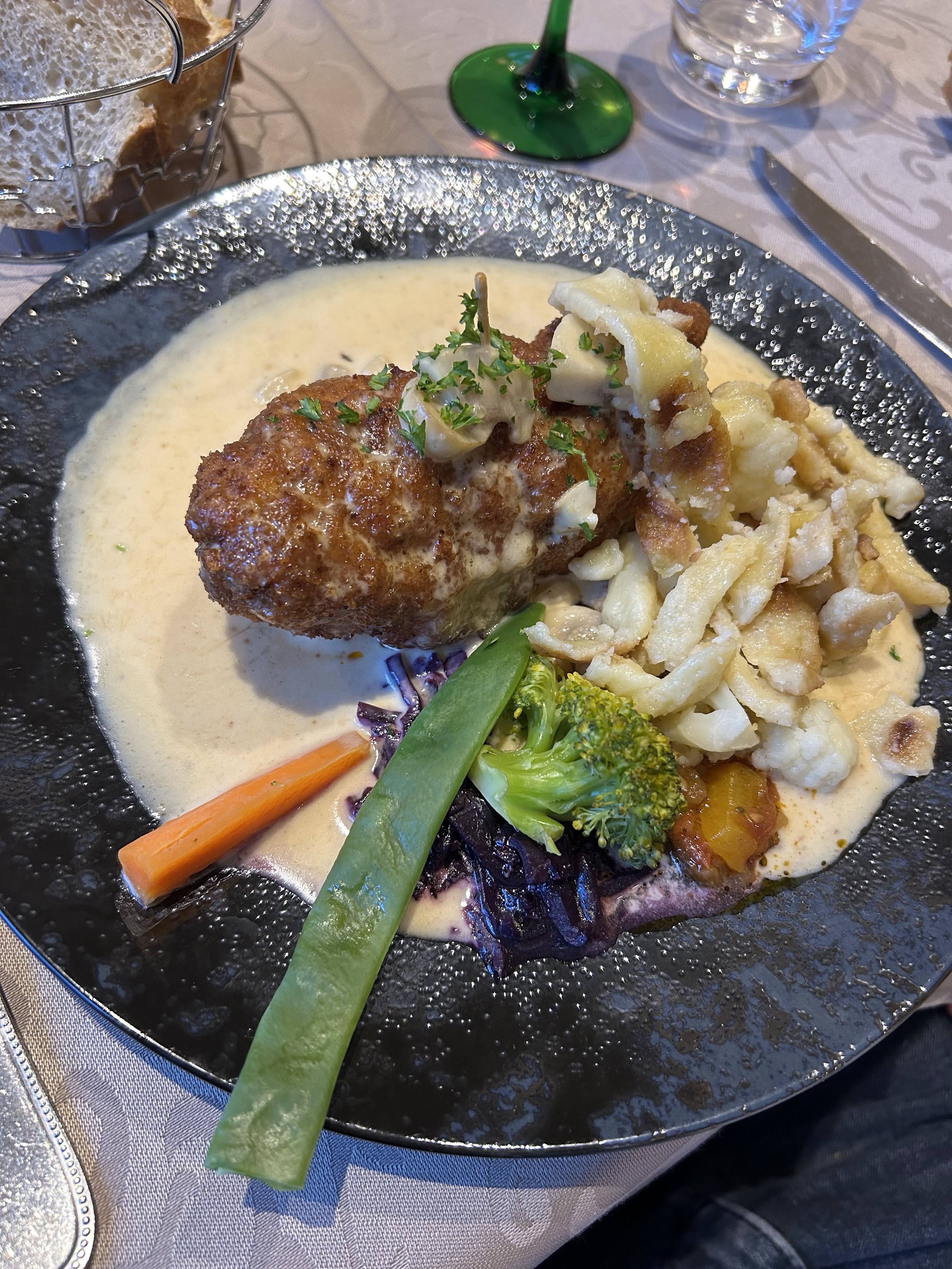 Je suis allé déjeuner, préparer un repas. Ambiance traditionnelle avec vitraux. La soupe était la meilleure de tous les temps, probablement pourquoi, c'était une portion de dégustation ! L'entrée était la salade végétarienne avec carottes, salade de chou et radis marinés ?? Le plat principal était de la morue et était parfaitement cuit La tarte aux poires était délicieuse avec un parfait ☕️ pour finir Le Riesling 🤍💚 a été servi et complété tout au long Excellent service pendant 90 minutes