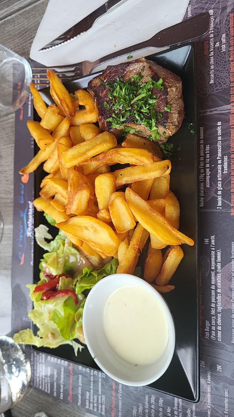 Quand vous allez au restaurant, si vous cherchez en priorité le cadre, c'est presque l'endroit idéal.... Au bord de l'eau mais vieillot qui mérite d'être remis au goût du jour. Super menu pour le prix plus que correcte !! Personnel serviable et très souriant Qui plus est et non des moindres c'était un bon moment en famille et amis au bord de l’eau