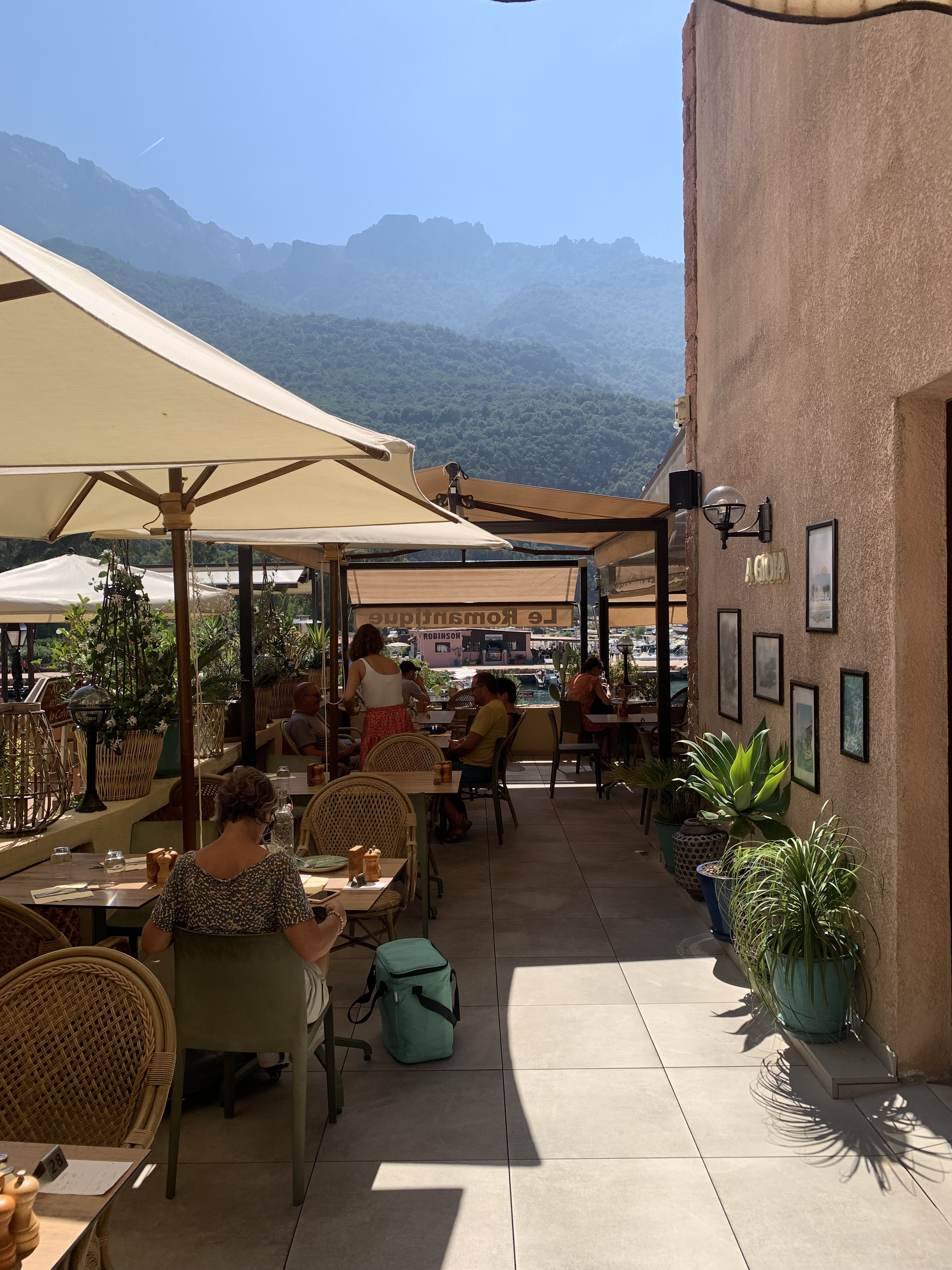 Une magnifique vue sur le port et la montagne. Très bon accueil, une carte très complète côté mer ou terre et des desserts fait maison !! La spécialité de la carte est le poisson entier grillé du golfe de Porto, selon l’arrivage. J’ai goûté pour la première fois un Shrimp roll c’était delicieux ! Pour le dessert je vous conseille le thé/café gourmand qui vous permettra de goûter les desserts de la carte en version miniature