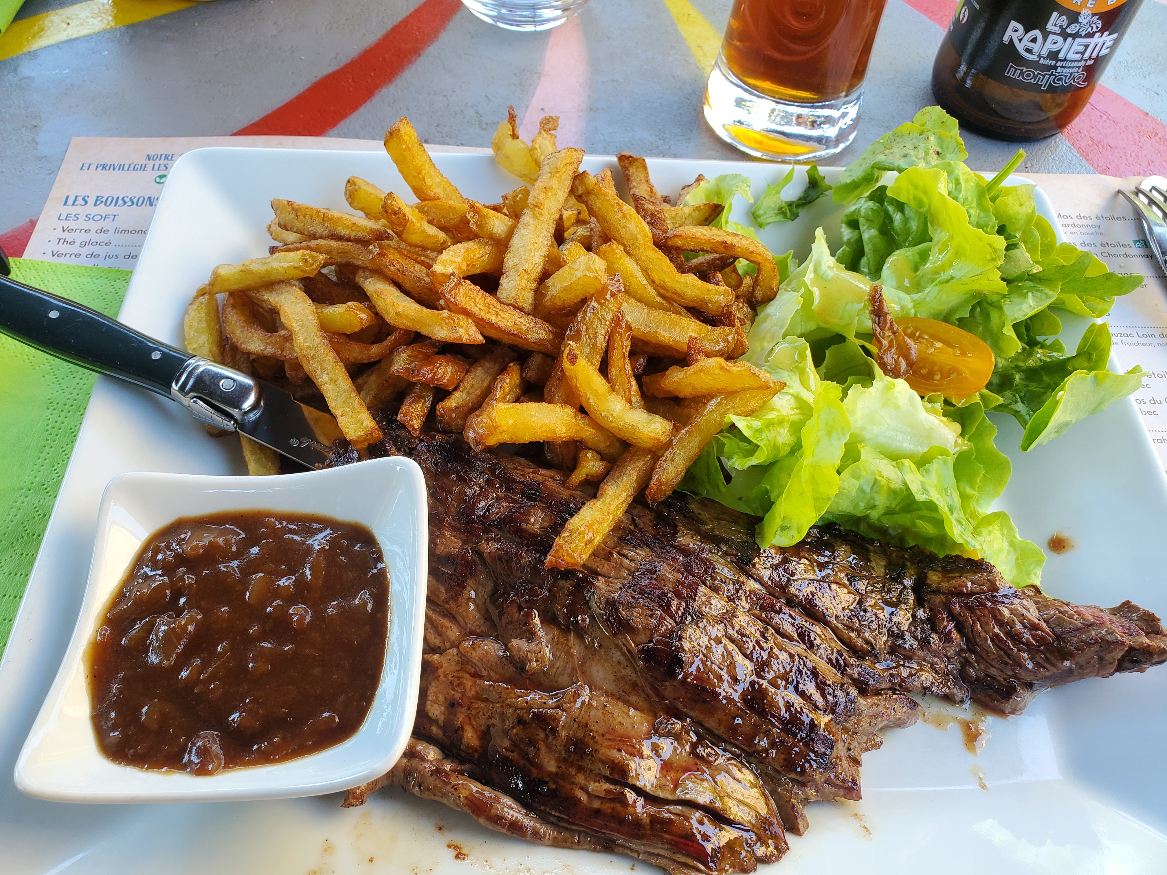 Bel terrasse au bord de la rivière, personnels sympa. Cuisine simple relativement copieuse.
