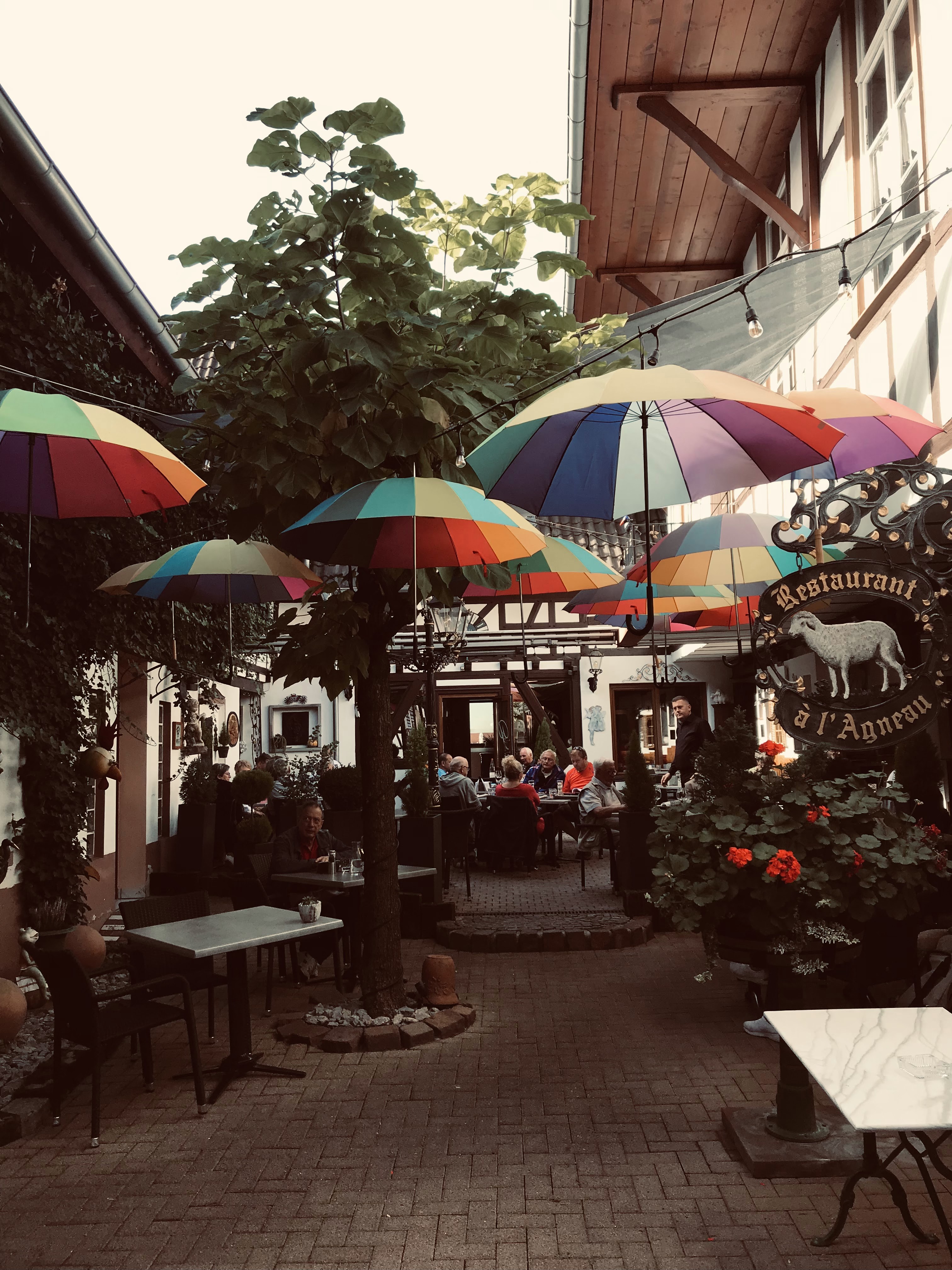 Très bon restaurant mais prix nettement plus élevés qu'en Allemagne. Terrasse dans la cour.